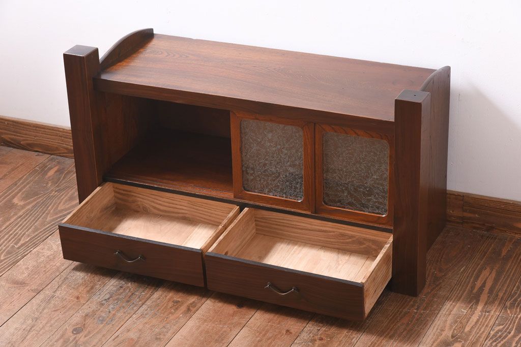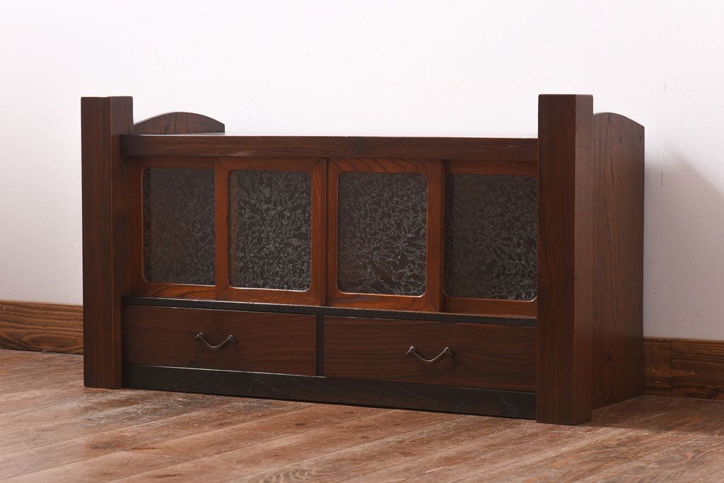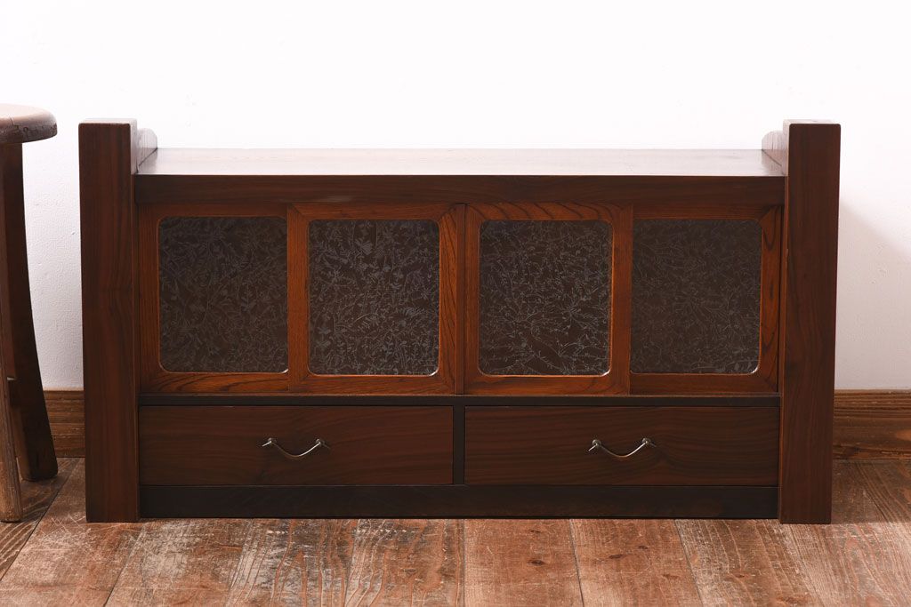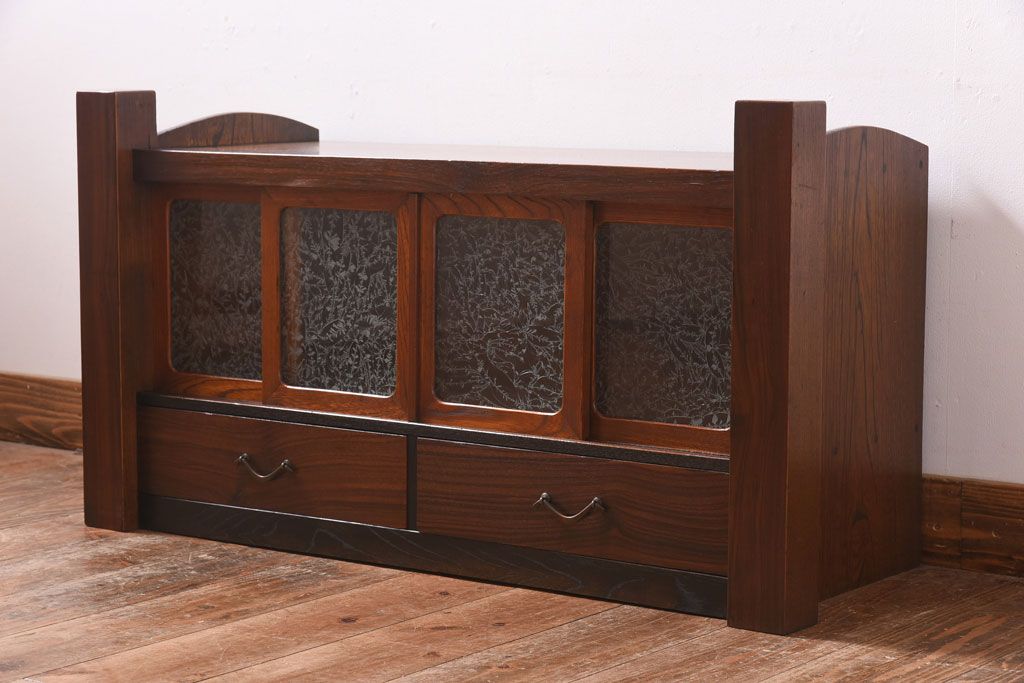 昭和初期 黒檀・栓材 結霜ガラスが上品なローボード(収納棚、置き床)です。