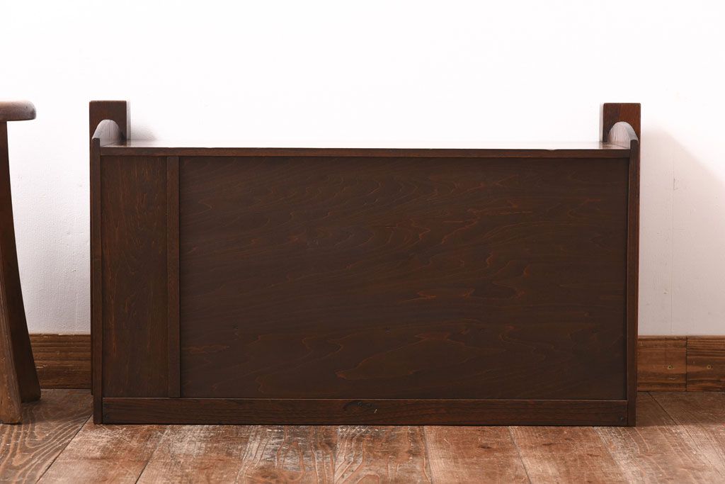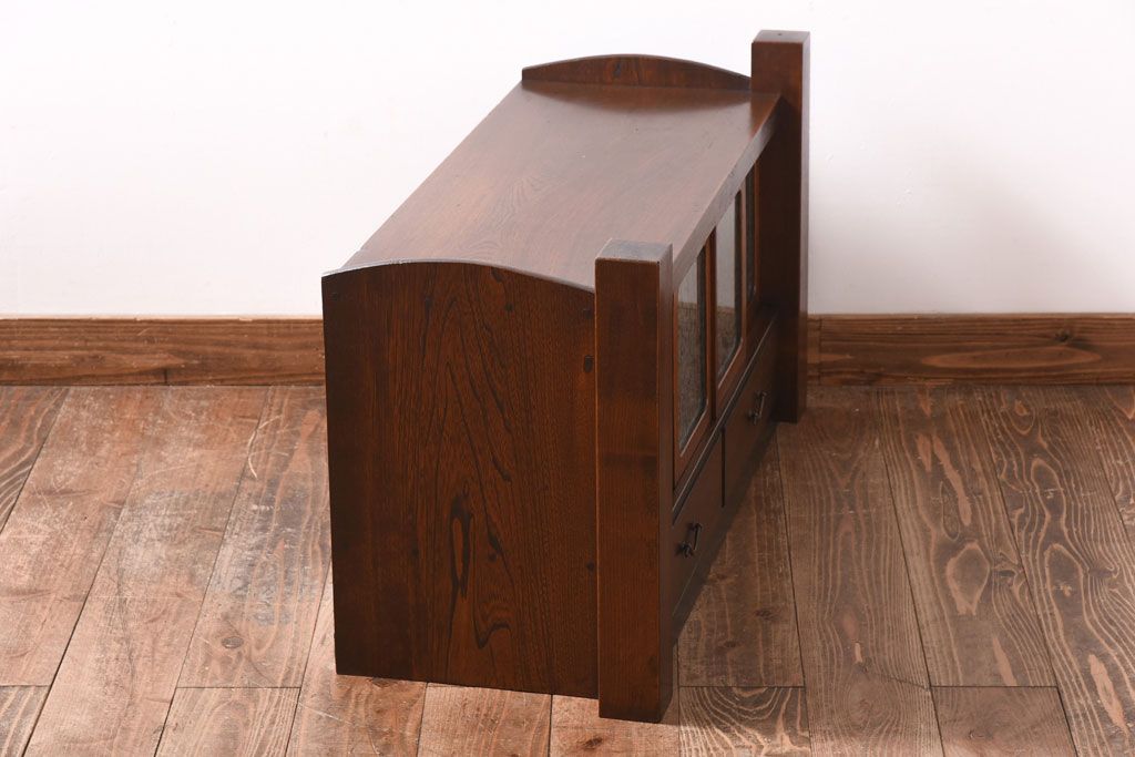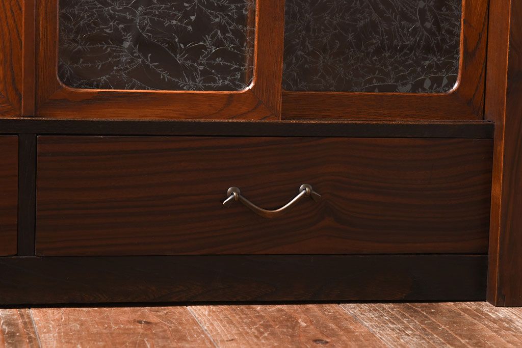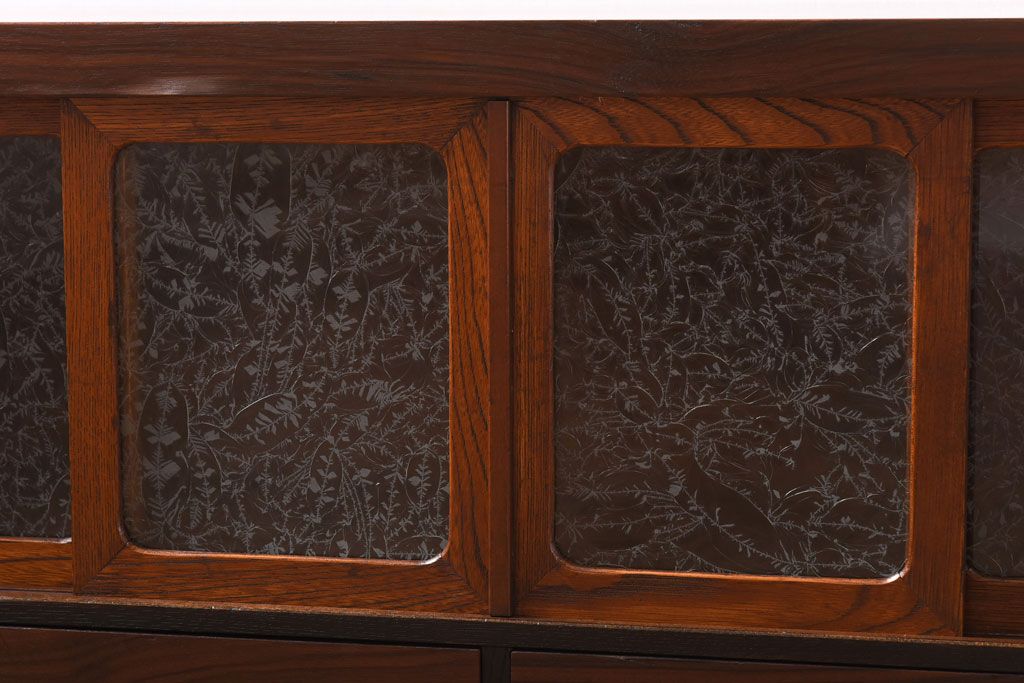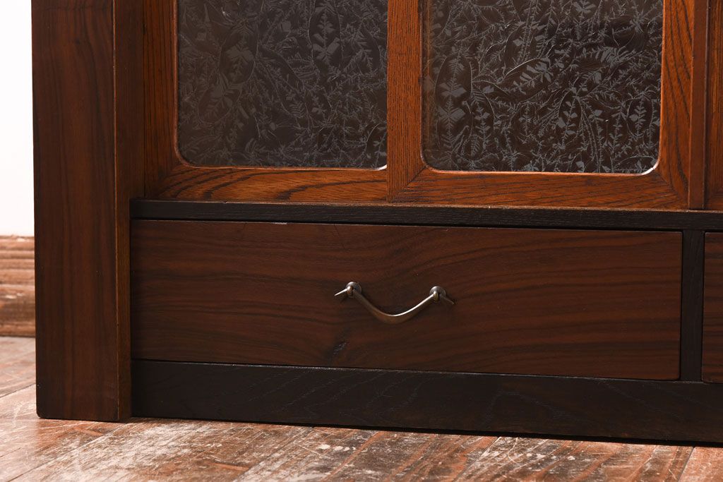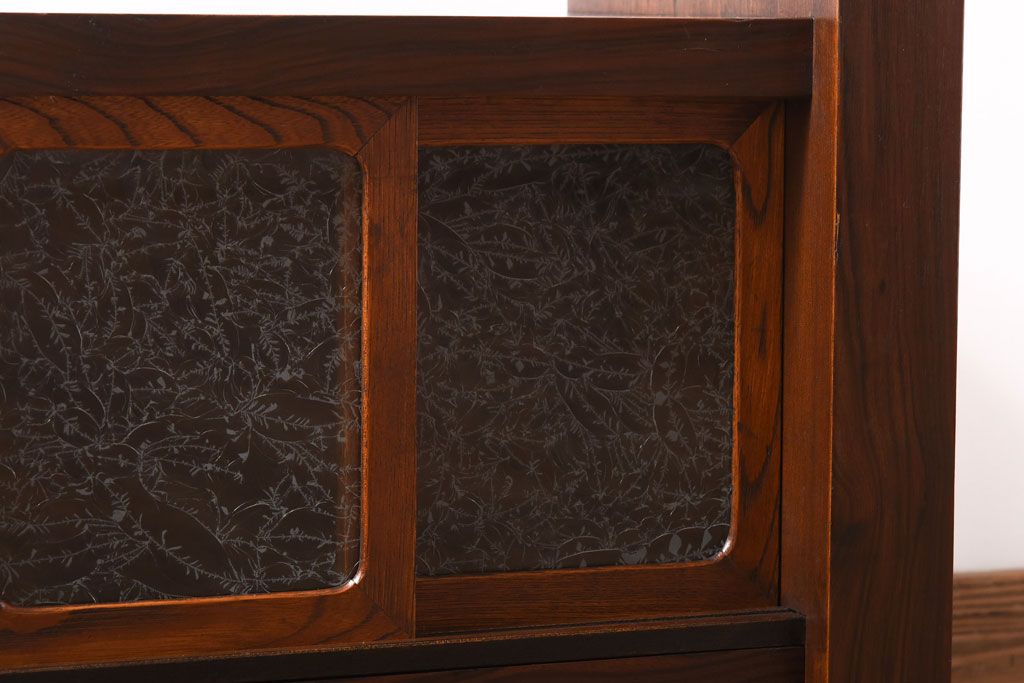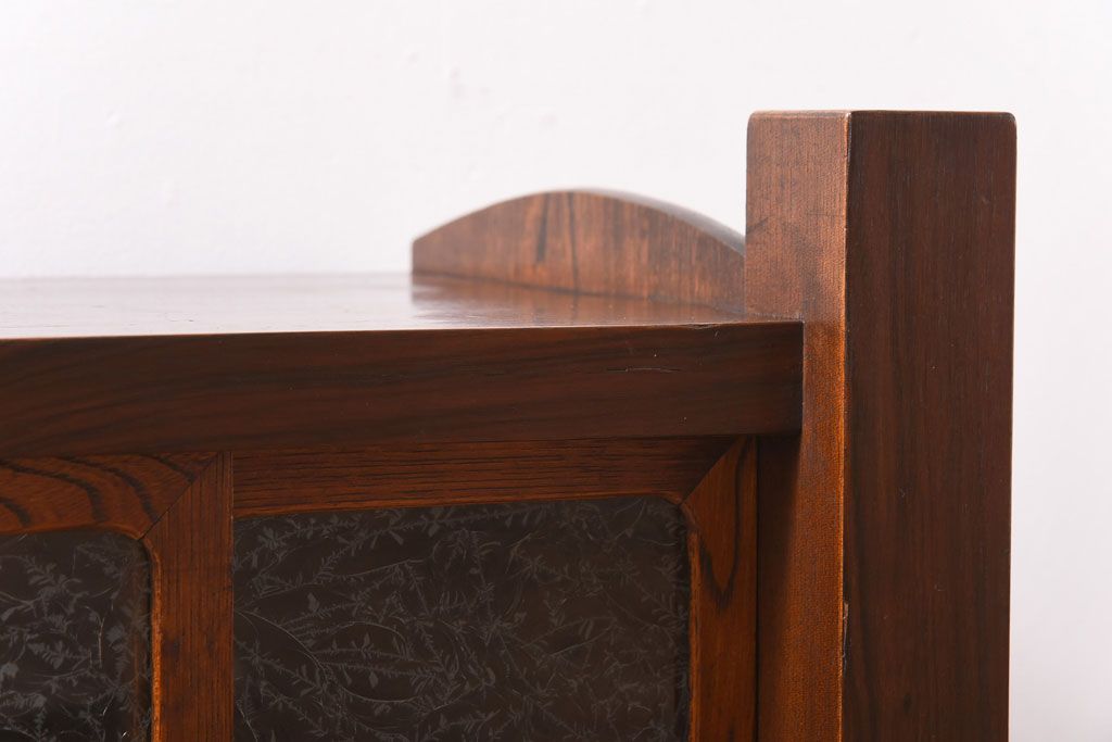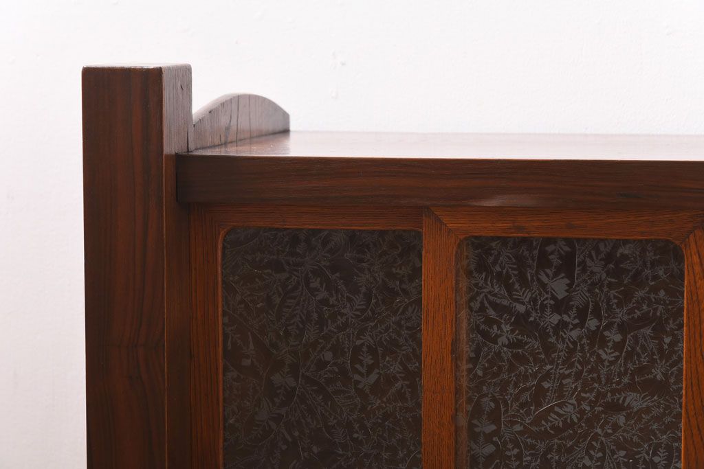 アンティーク家具 昭和初期 黒檀・栓材 結霜ガラスが上品なローボード(収納棚、置き床)