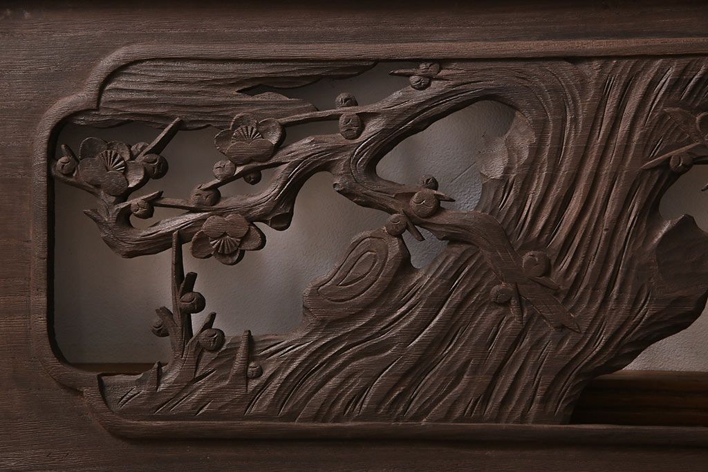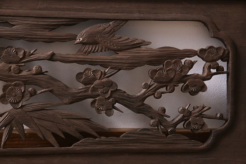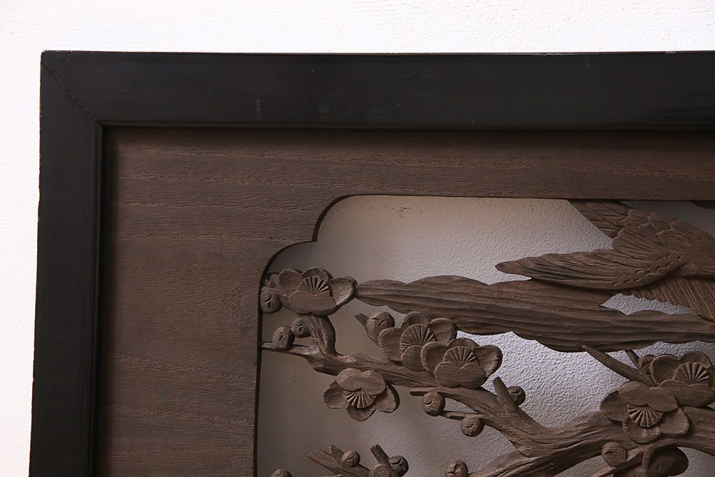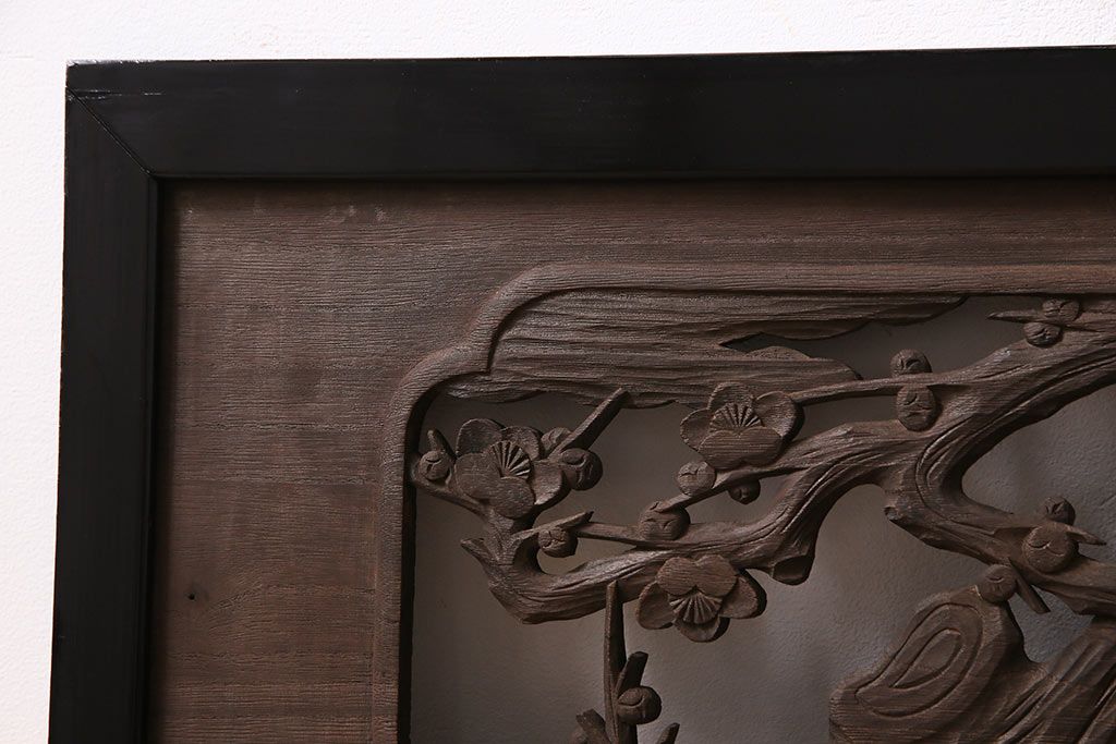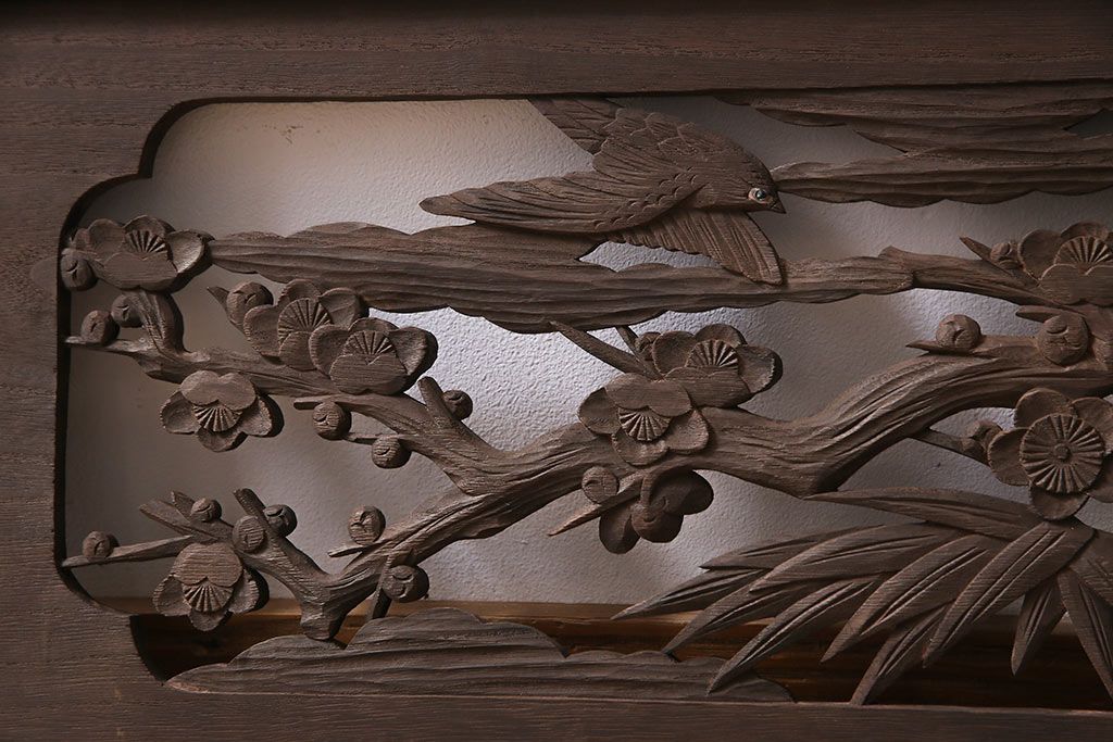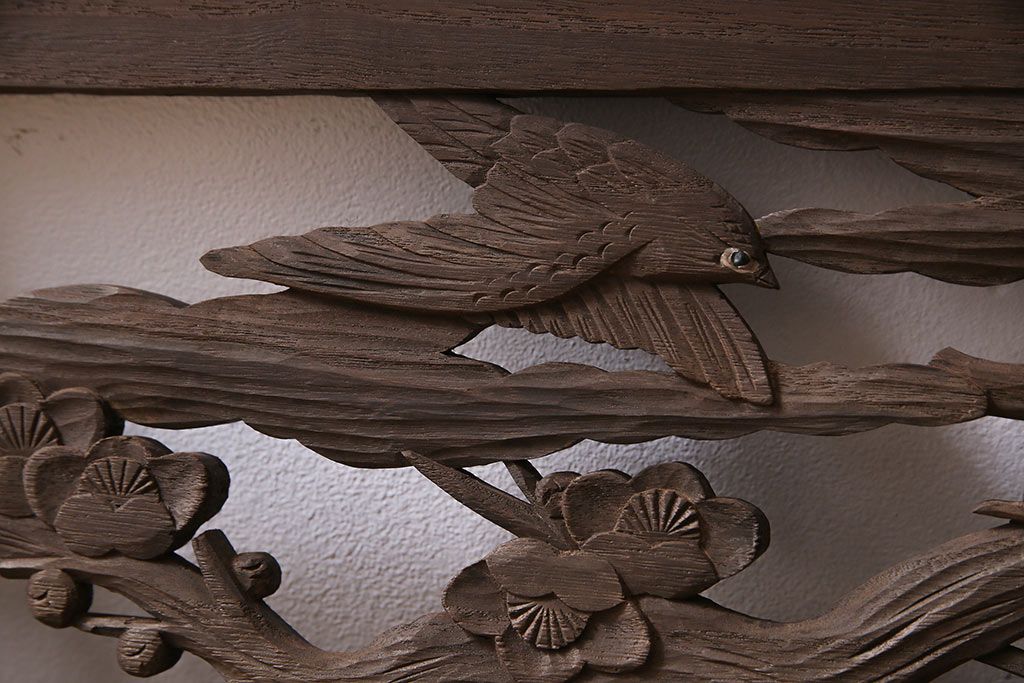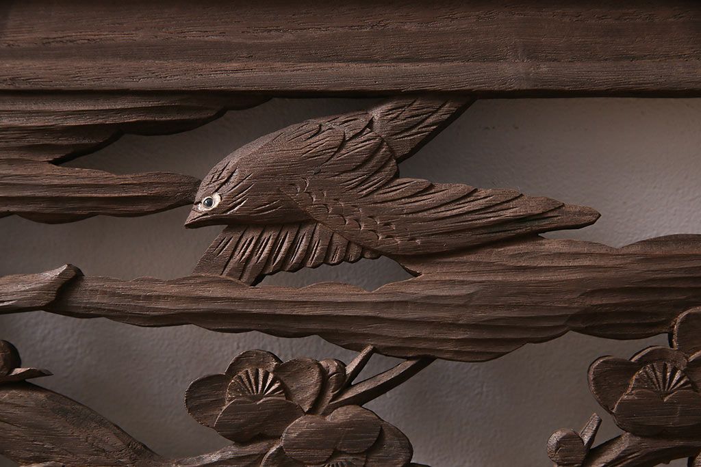 和製アンティーク 桐材 花鳥図 奥行のある構図が見事な透かし彫りの欄間(明かり取り、装飾品)です。 空間の奥行とストーリー性を感じさせる 透かし彫りの欄間です。 やわらかな風合いが特長の桐材に 力強いタッチの花鳥図を彫りあげています。 古木のようなごつごつとした梅の木の質感と、 雲間を飛ぶ躍動感ある鳥の姿に、 早春の空気に漂う梅の香が匂ってくるようです。 外枠には黒漆が施され、 欄間としてだけではなく、 室内の装飾にもおすすめです。 和を基調とした空間にいかがでしょうか。 ダメージが少なく、アンティーク品として高品質なお品です。 使用上問題のあるダメージはありません。 ■框サイズ 上40mm/左35mm/右35mm/下40mm
