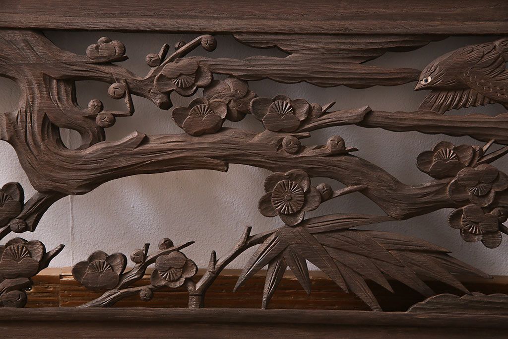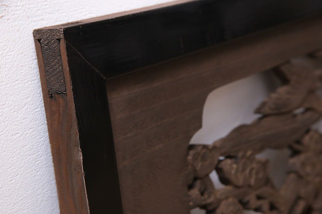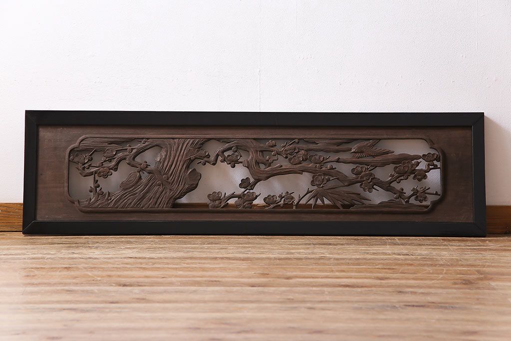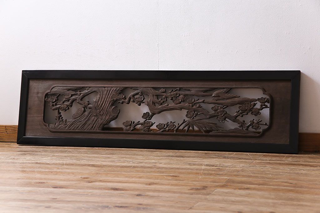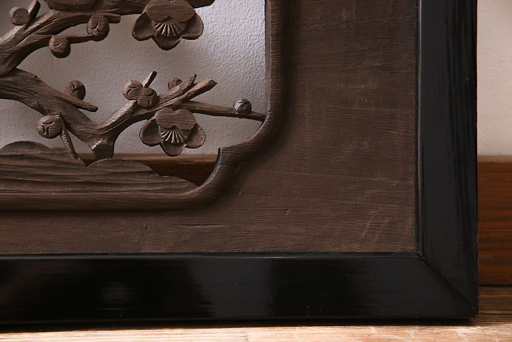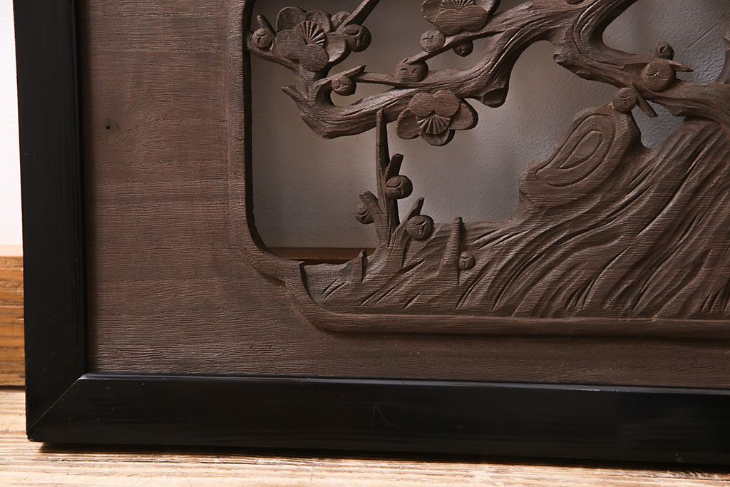 和製アンティーク 桐材 花鳥図 奥行のある構図が見事な透かし彫りの欄間(明かり取り、装飾品)です。 空間の奥行とストーリー性を感じさせる 透かし彫りの欄間です。 やわらかな風合いが特長の桐材に 力強いタッチの花鳥図を彫りあげています。 古木のようなごつごつとした梅の木の質感と、 雲間を飛ぶ躍動感ある鳥の姿に、 早春の空気に漂う梅の香が匂ってくるようです。 外枠には黒漆が施され、 欄間としてだけではなく、 室内の装飾にもおすすめです。 和を基調とした空間にいかがでしょうか。 ダメージが少なく、アンティーク品として高品質なお品です。 使用上問題のあるダメージはありません。 ■框サイズ 上40mm/左35mm/右35mm/下40mm
