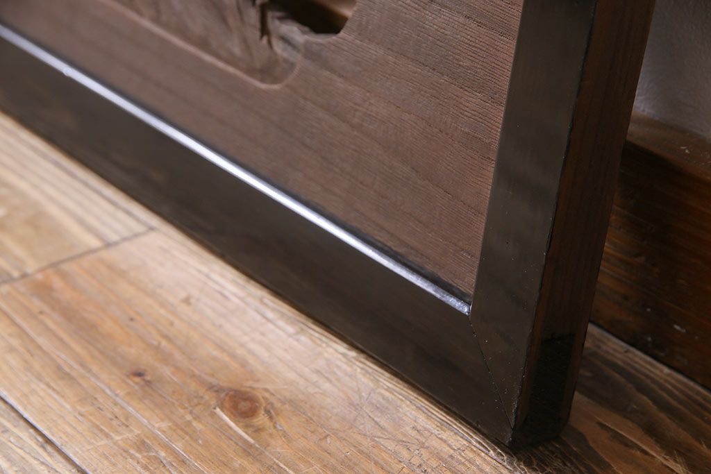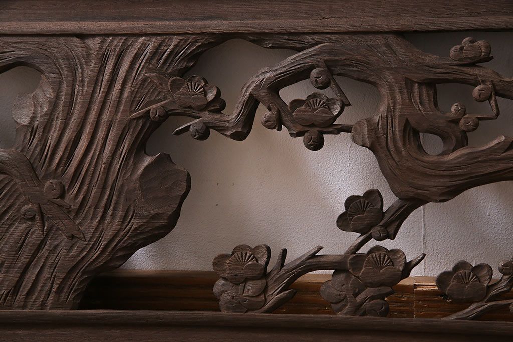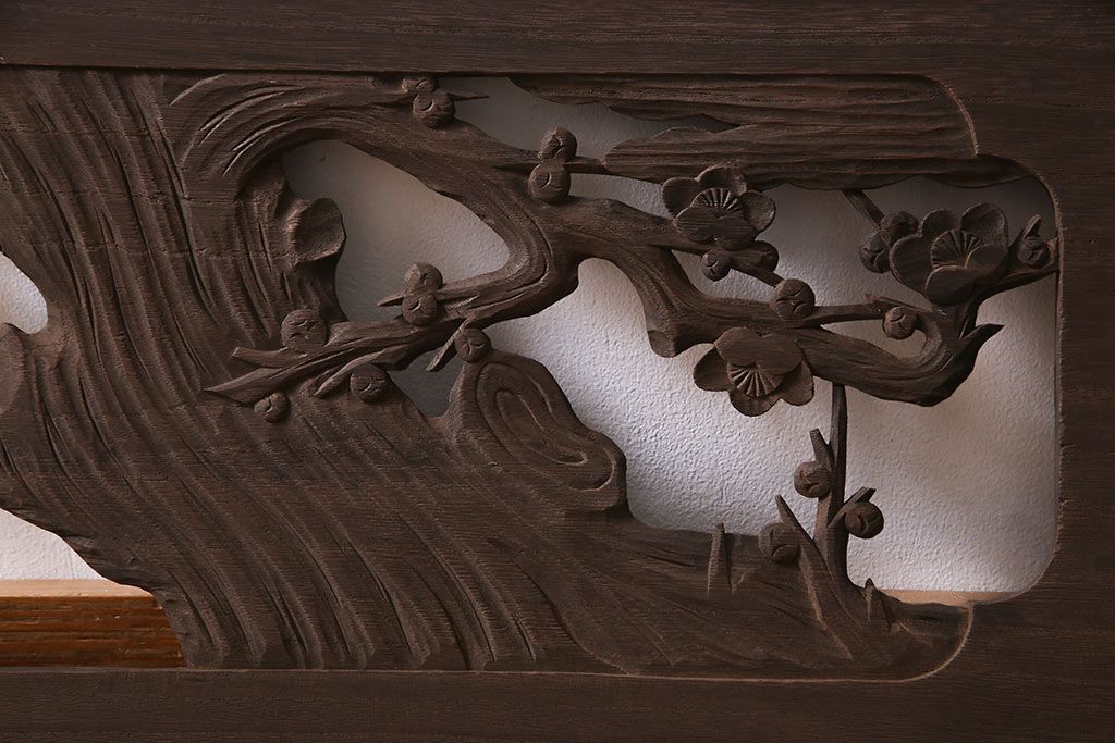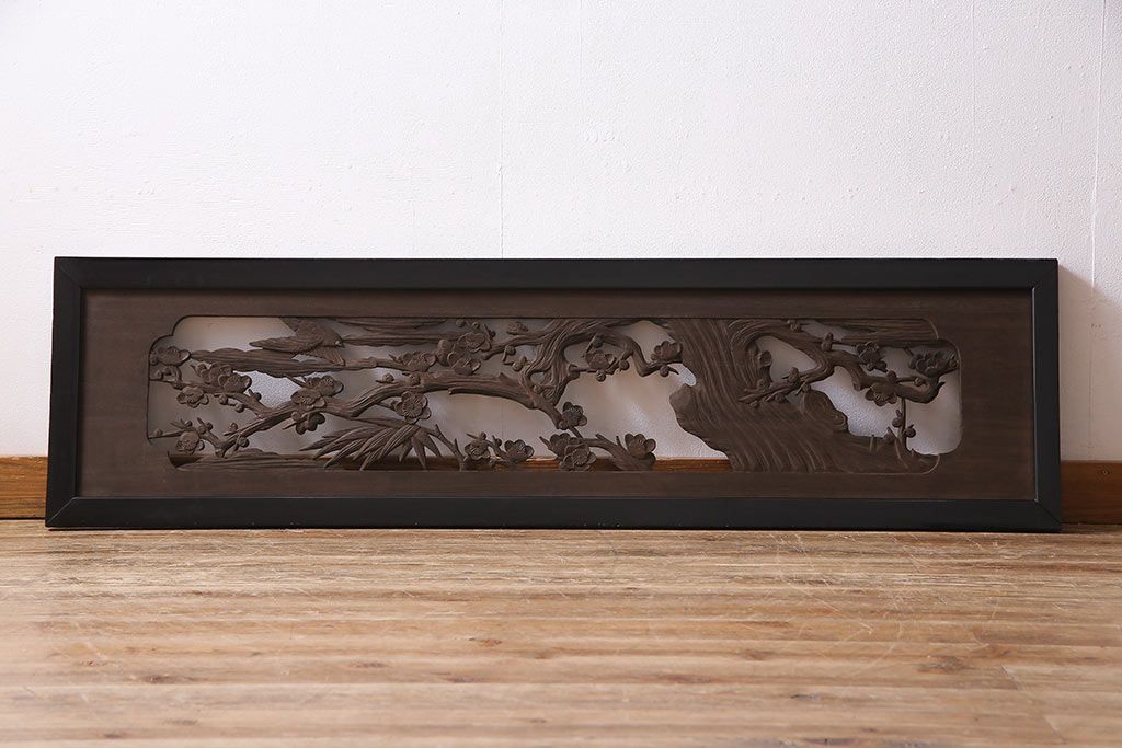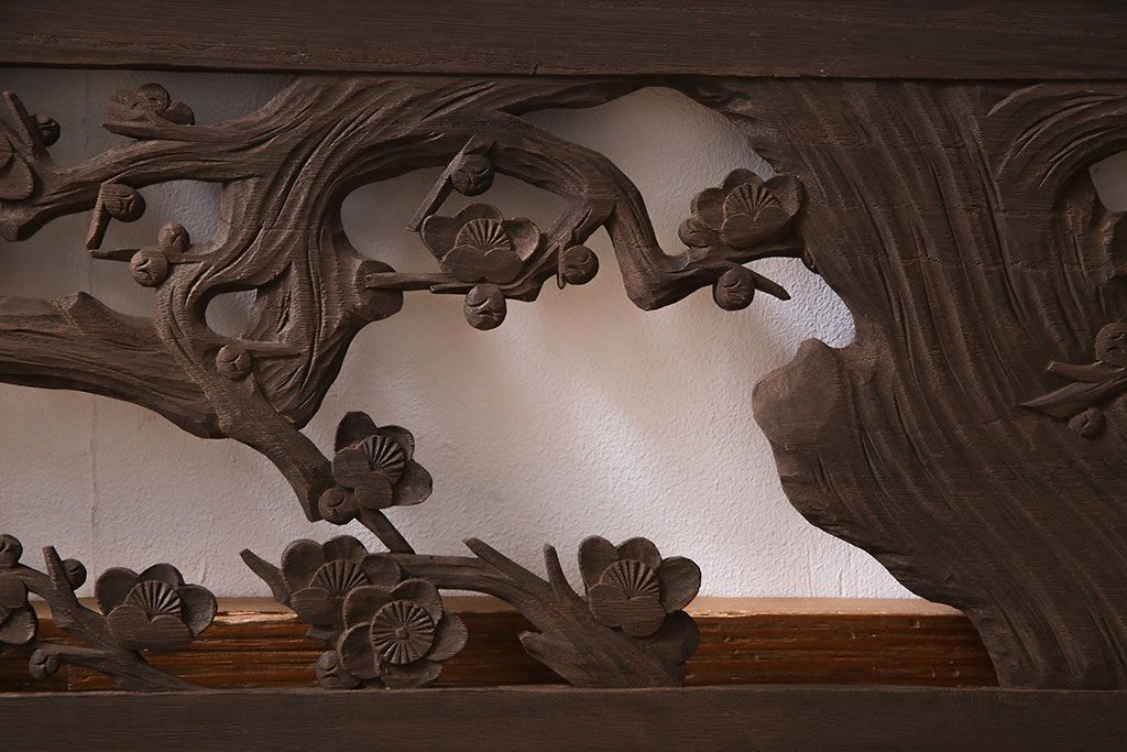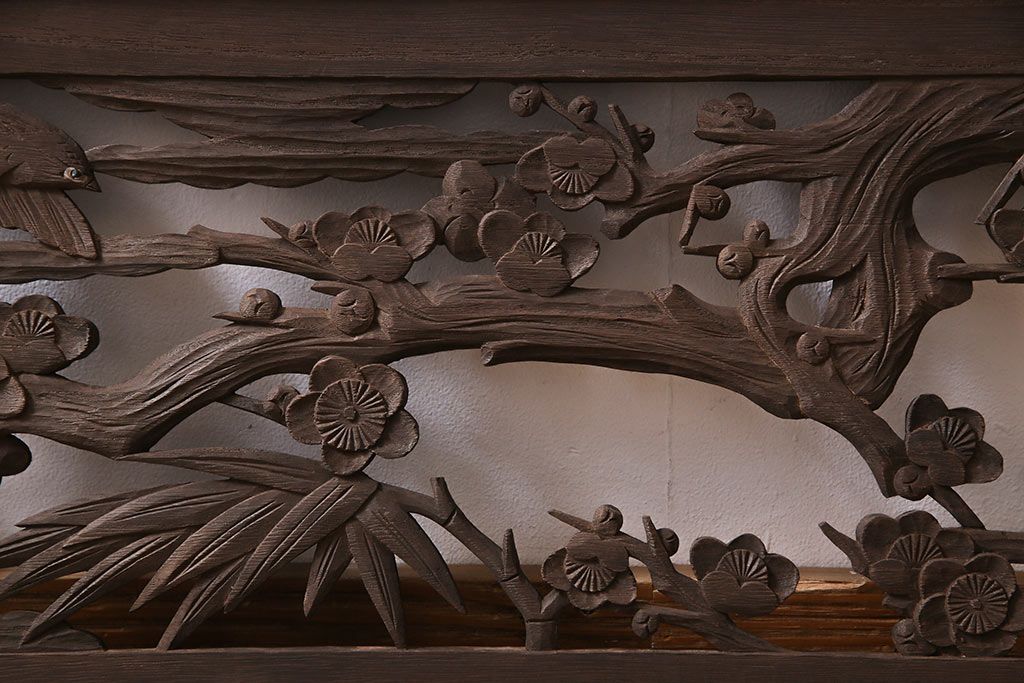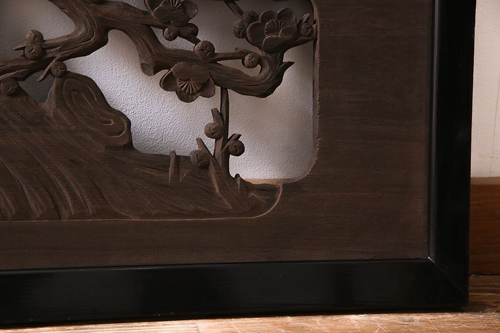 和製アンティーク 桐材 花鳥図 奥行のある構図が見事な透かし彫りの欄間(明かり取り、装飾品)です。 空間の奥行とストーリー性を感じさせる 透かし彫りの欄間です。 やわらかな風合いが特長の桐材に 力強いタッチの花鳥図を彫りあげています。 古木のようなごつごつとした梅の木の質感と、 雲間を飛ぶ躍動感ある鳥の姿に、 早春の空気に漂う梅の香が匂ってくるようです。 外枠には黒漆が施され、 欄間としてだけではなく、 室内の装飾にもおすすめです。 和を基調とした空間にいかがでしょうか。 ダメージが少なく、アンティーク品として高品質なお品です。 使用上問題のあるダメージはありません。 ■框サイズ 上40mm/左35mm/右35mm/下40mm