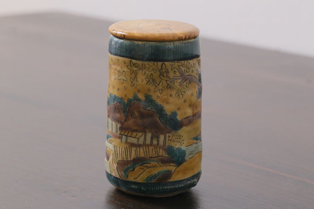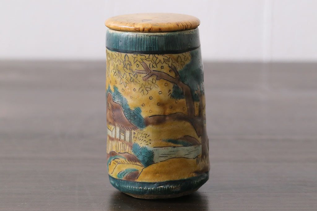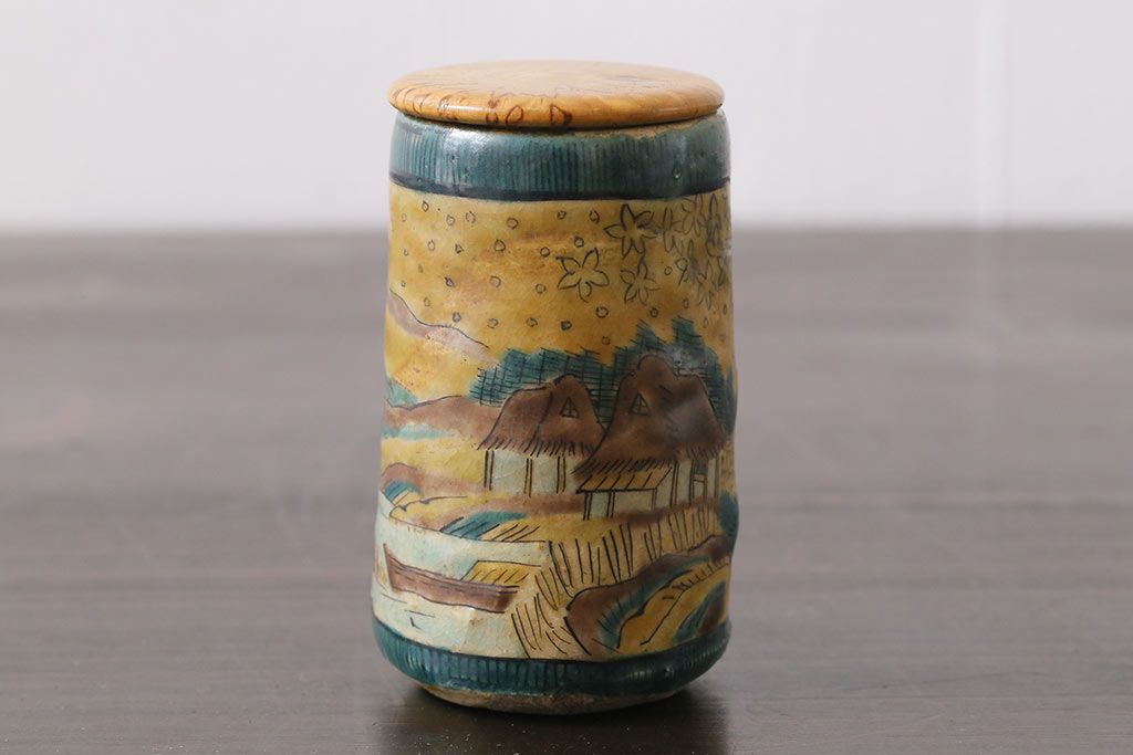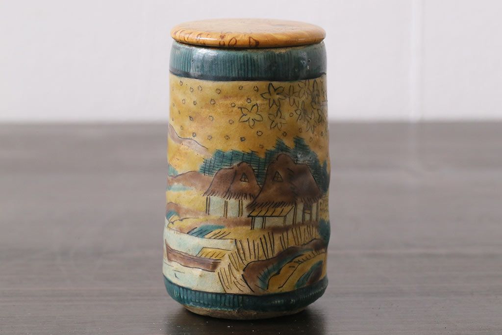 アンティーク雑貨 骨董 里山の情景が描かれた九谷焼の茶入れ(茶道具、陶器)