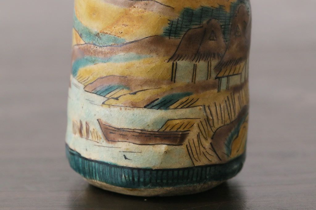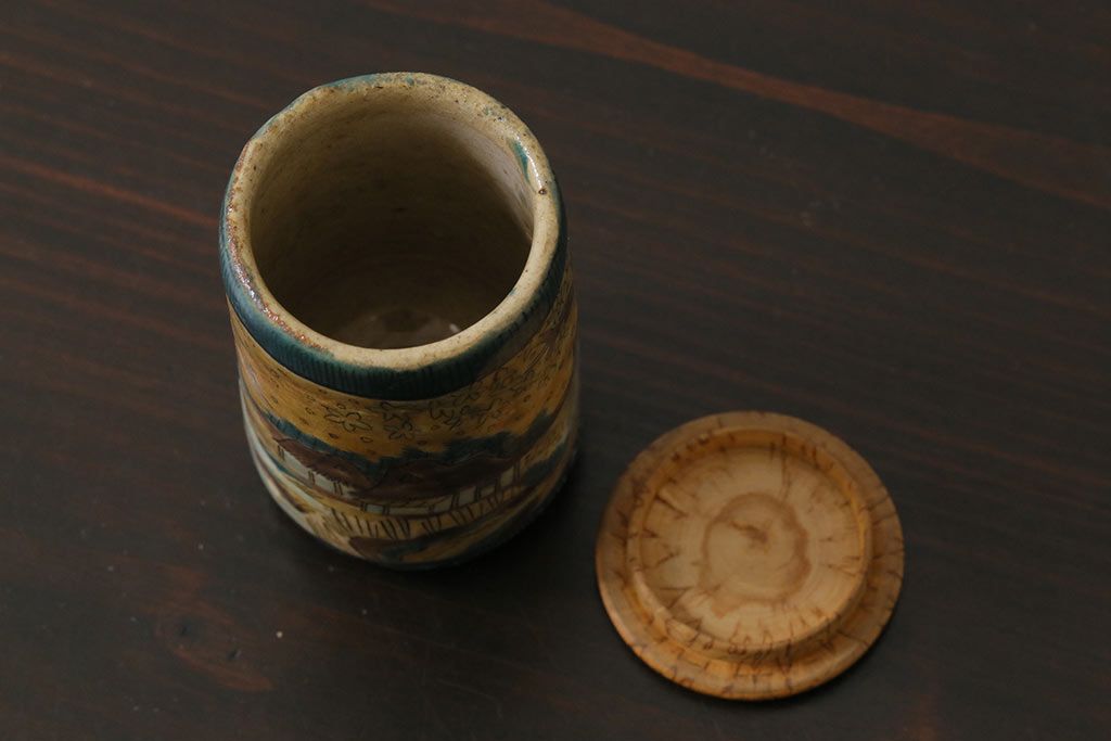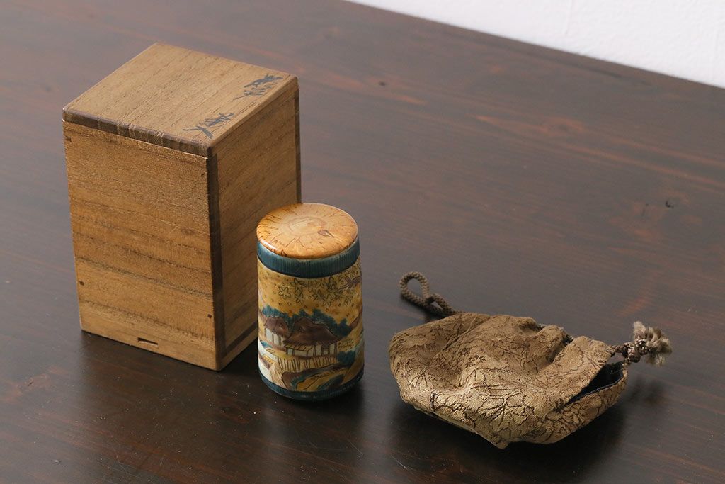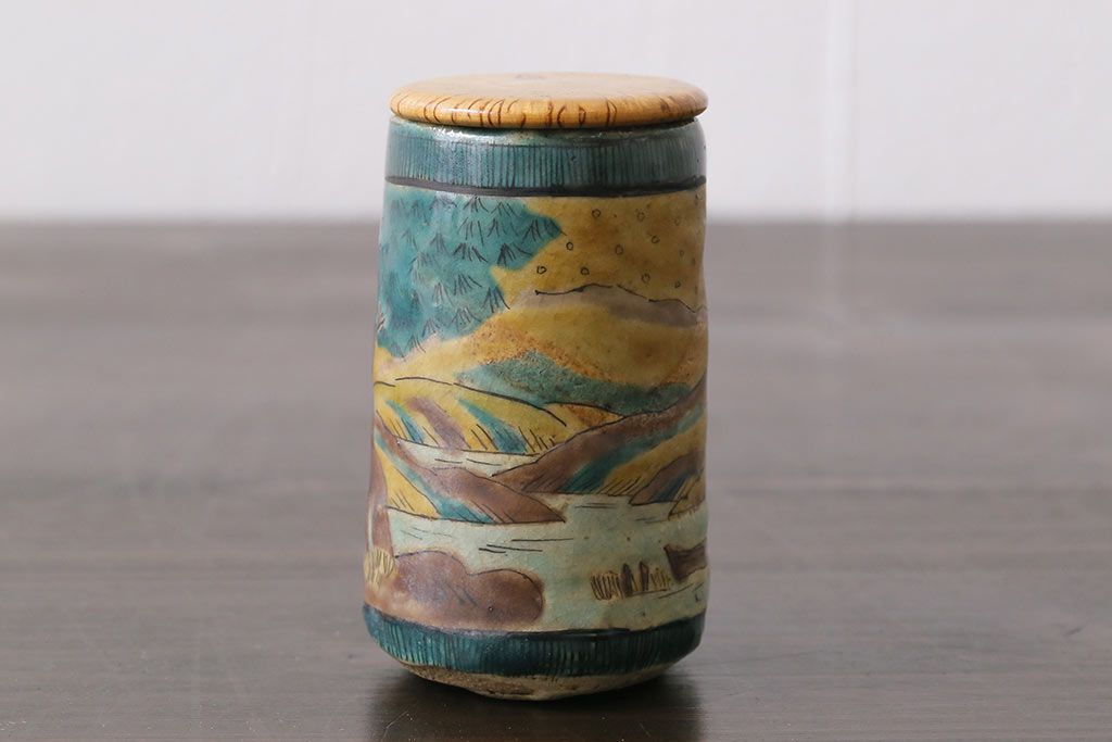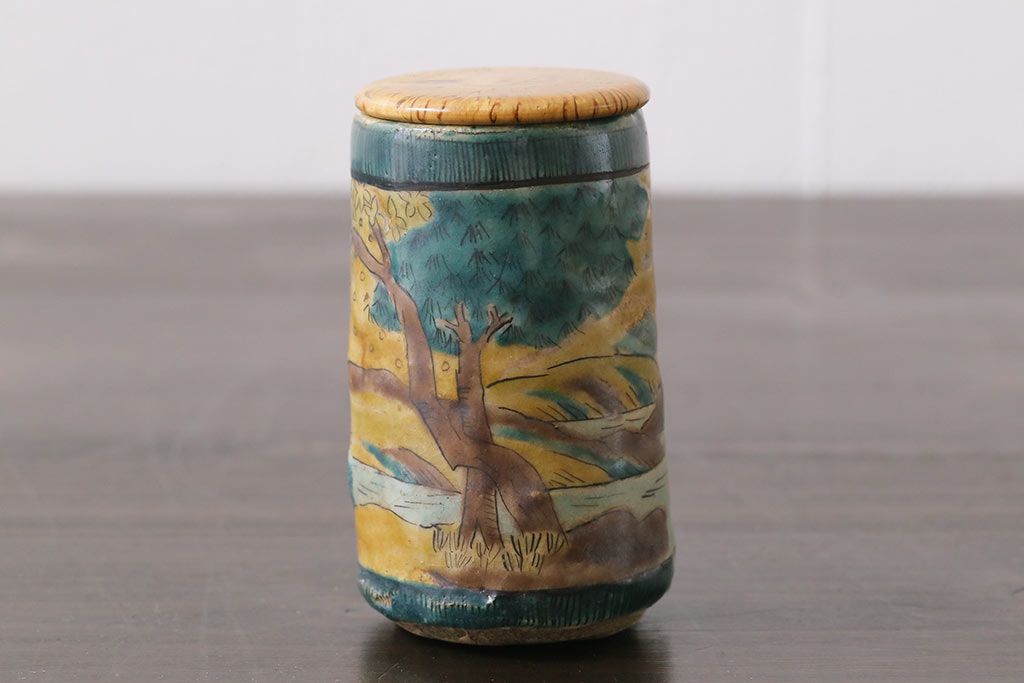 アンティーク雑貨 骨董 里山の情景が描かれた九谷焼の茶入れ(茶道具、陶器)