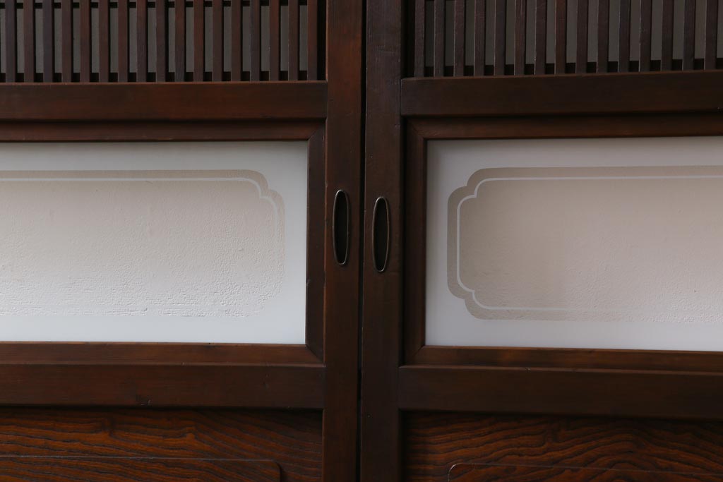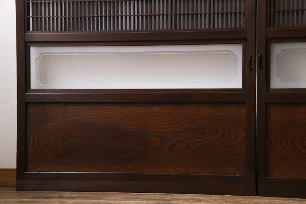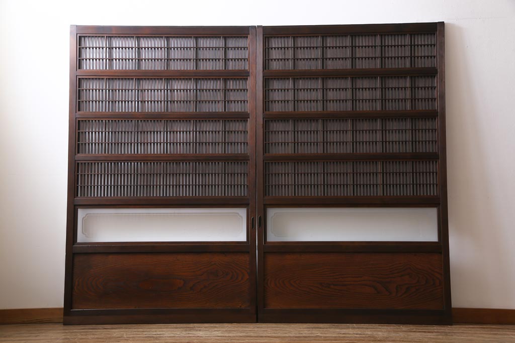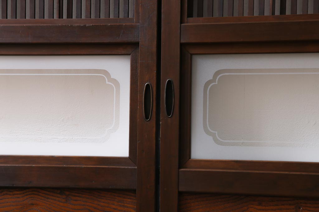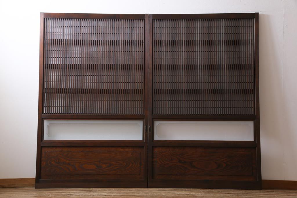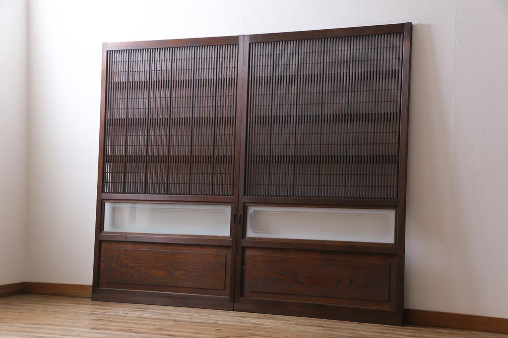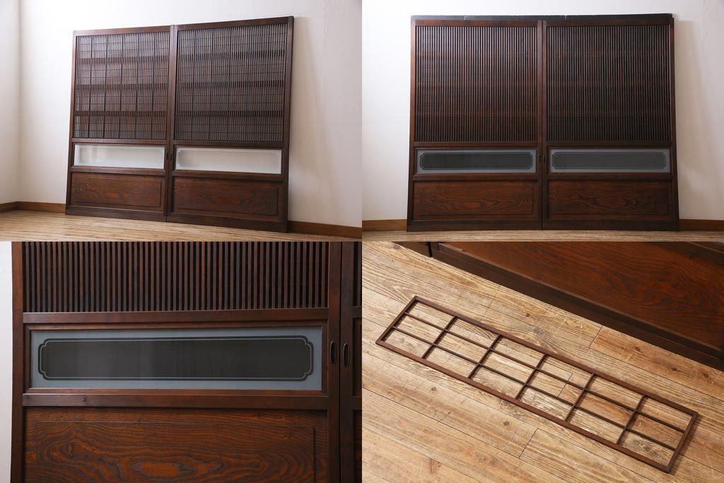 昭和初期 幅広 腰板ケヤキ材 障子枠の付いた格子帯戸(ガラス帯戸、引き戸、建具)2枚セット