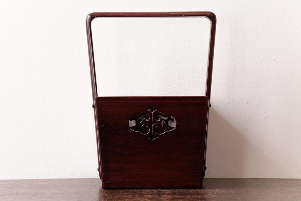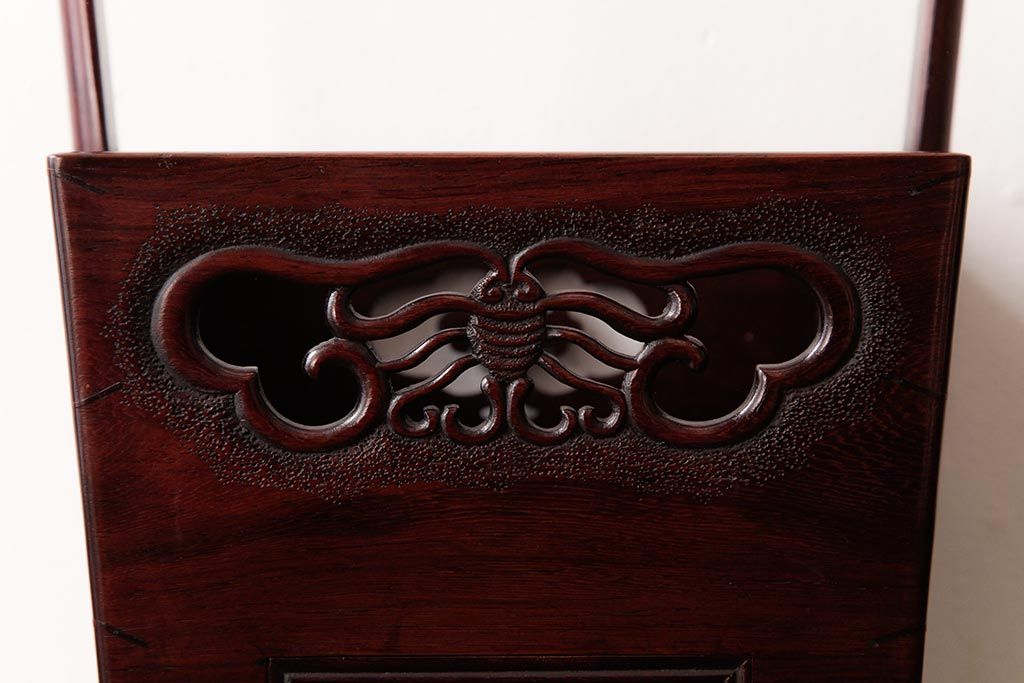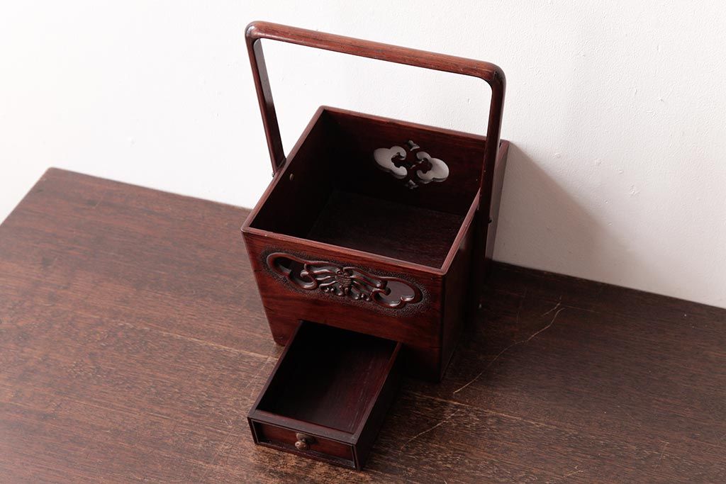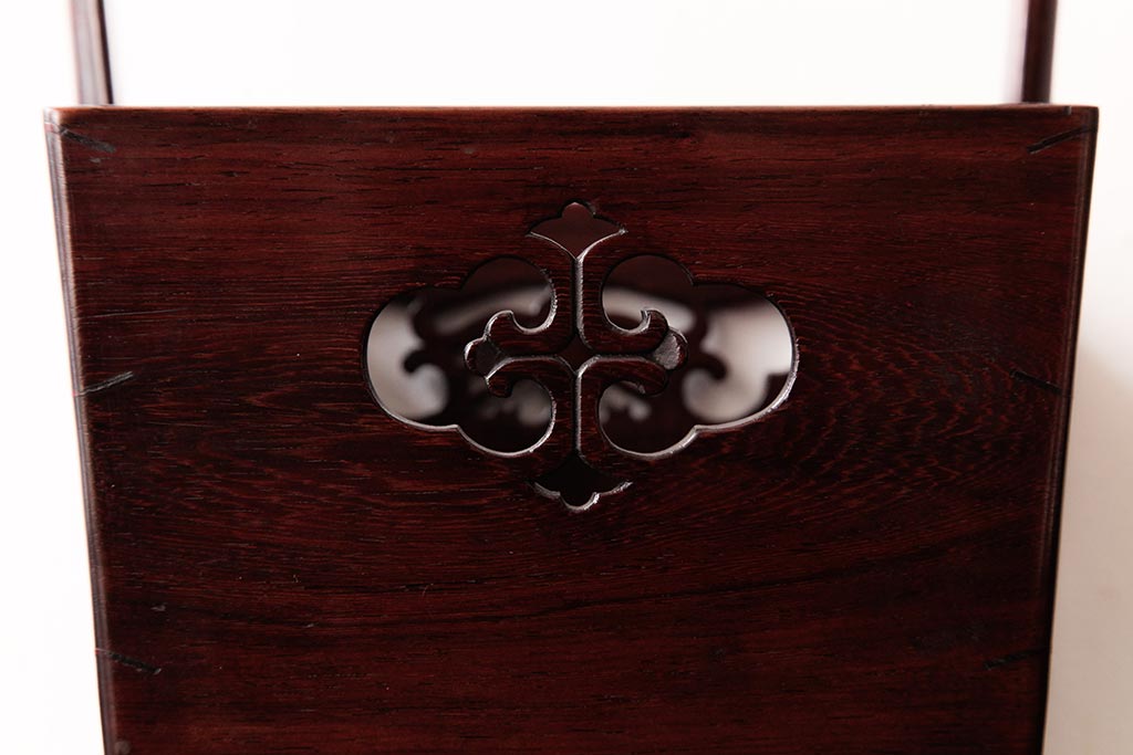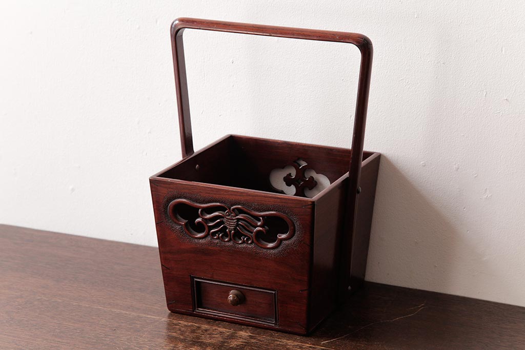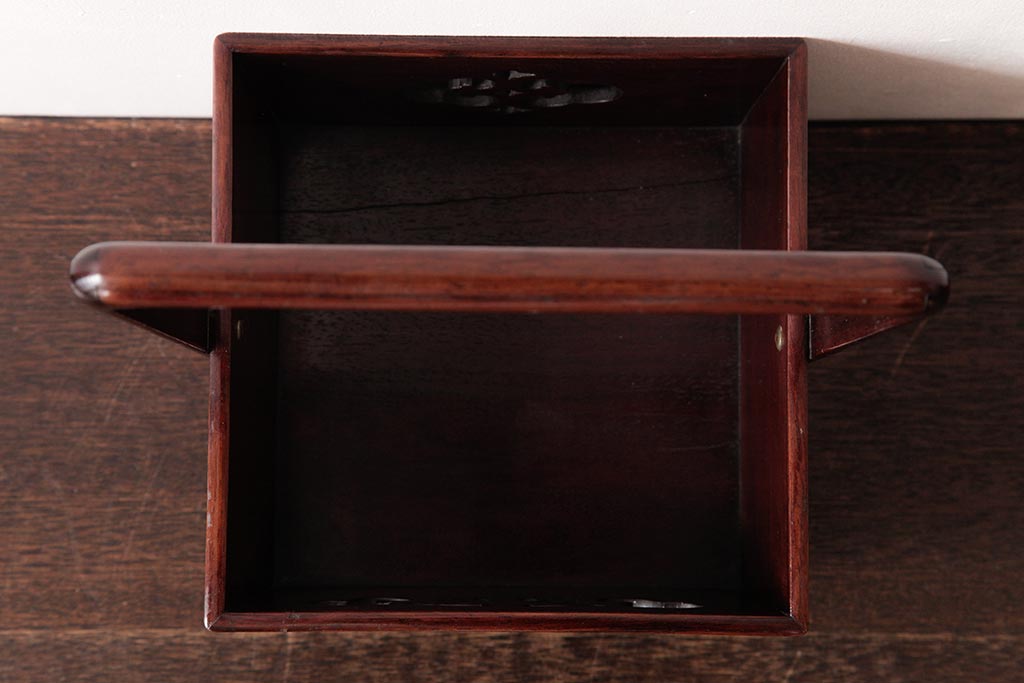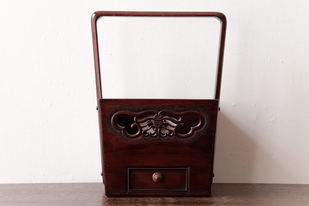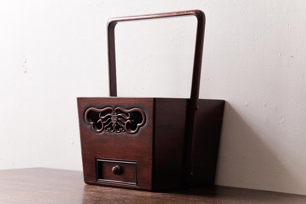 アンティーク雑貨 古民具・骨董 花梨材 引出し付き 蝶の透かし彫りが目を引く手提げ煙草盆(手付香盆、カリン材)