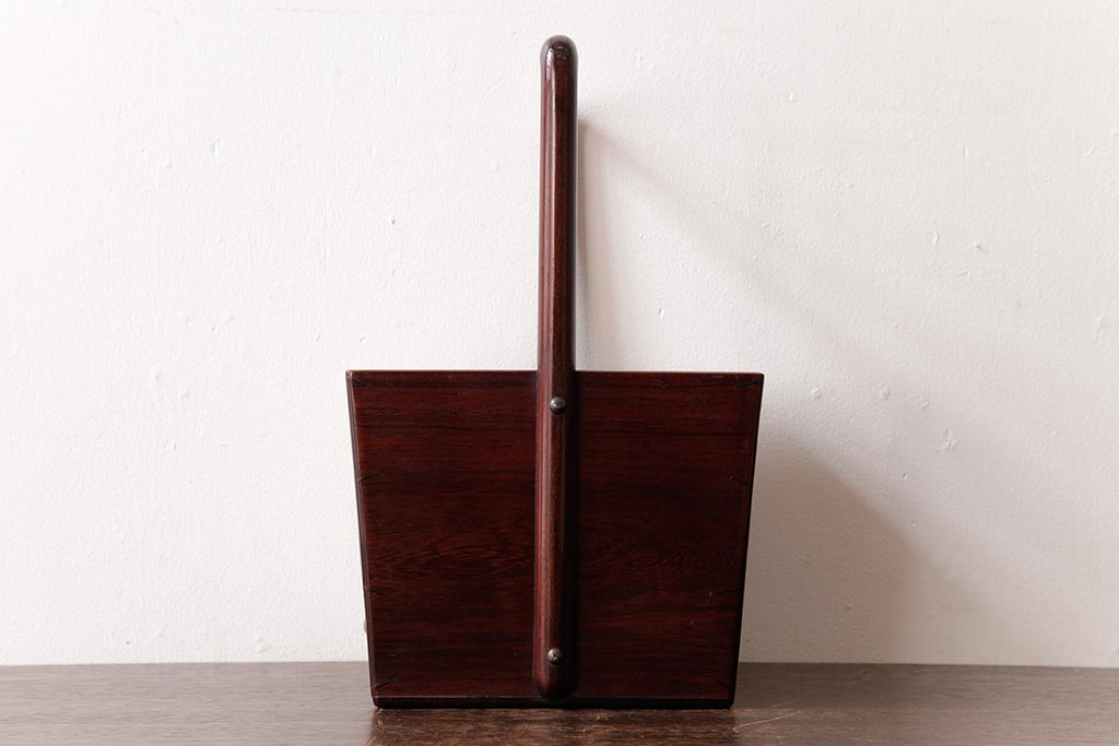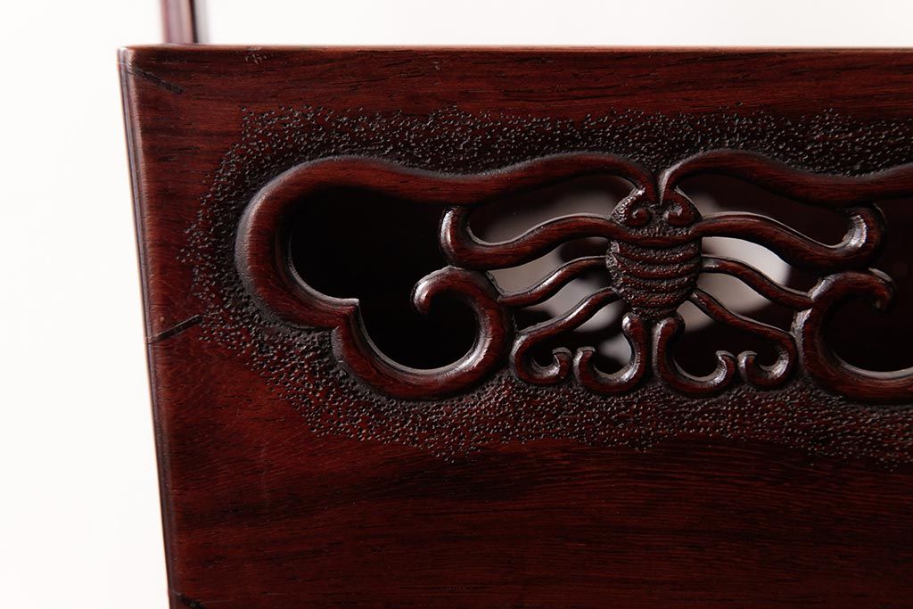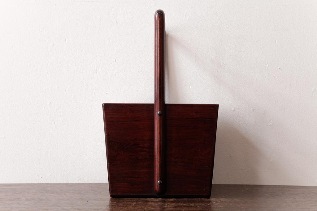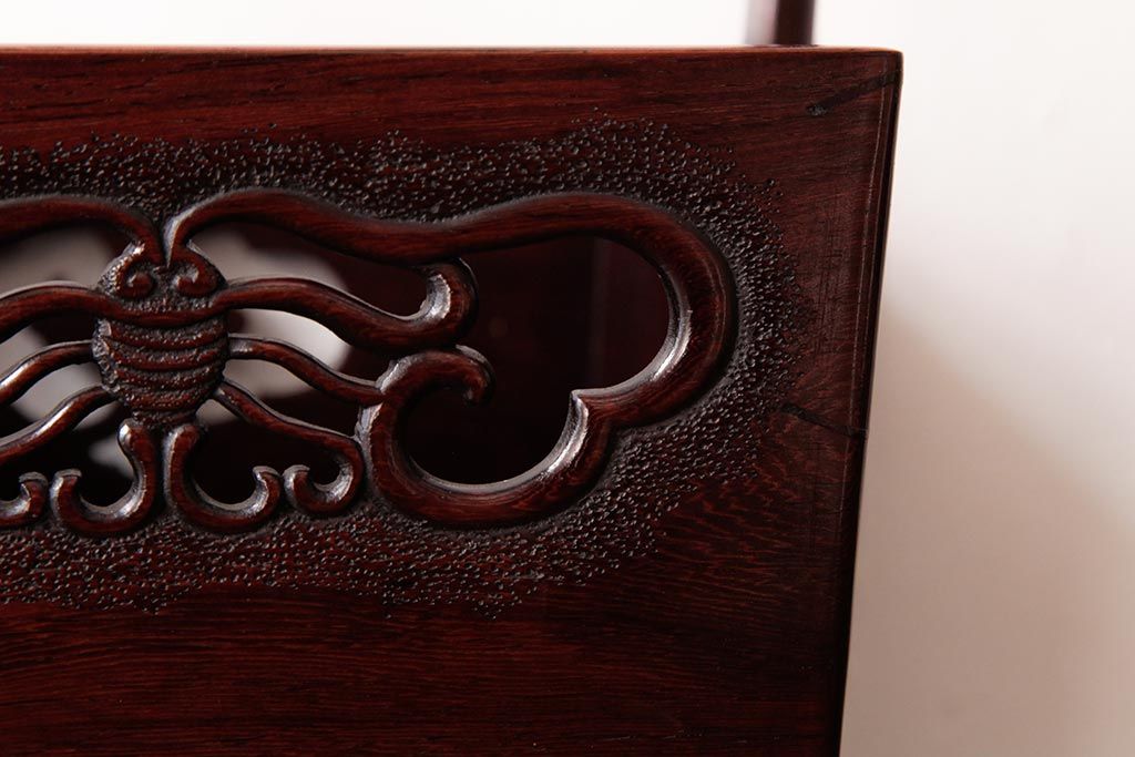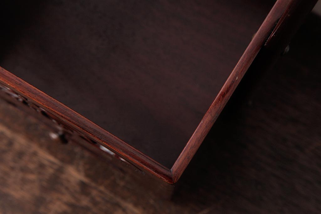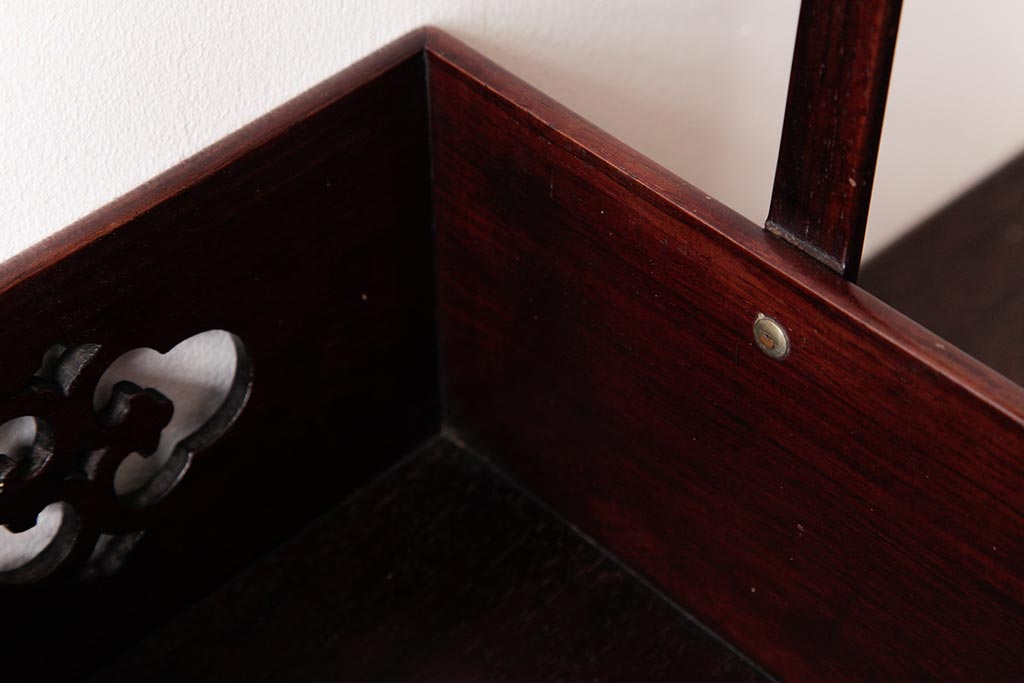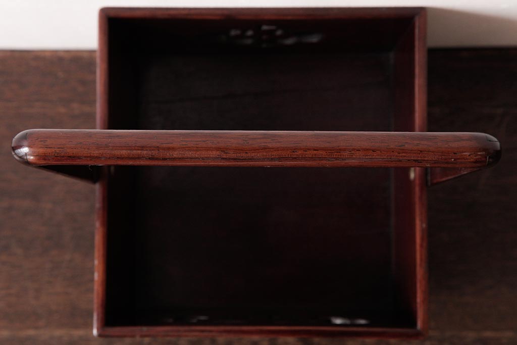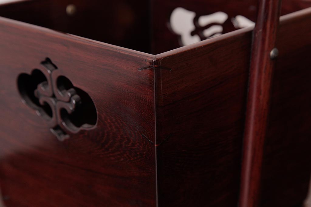 アンティーク雑貨 古民具・骨董 花梨材 引出し付き 蝶の透かし彫りが目を引く手提げ煙草盆(手付香盆、カリン材)