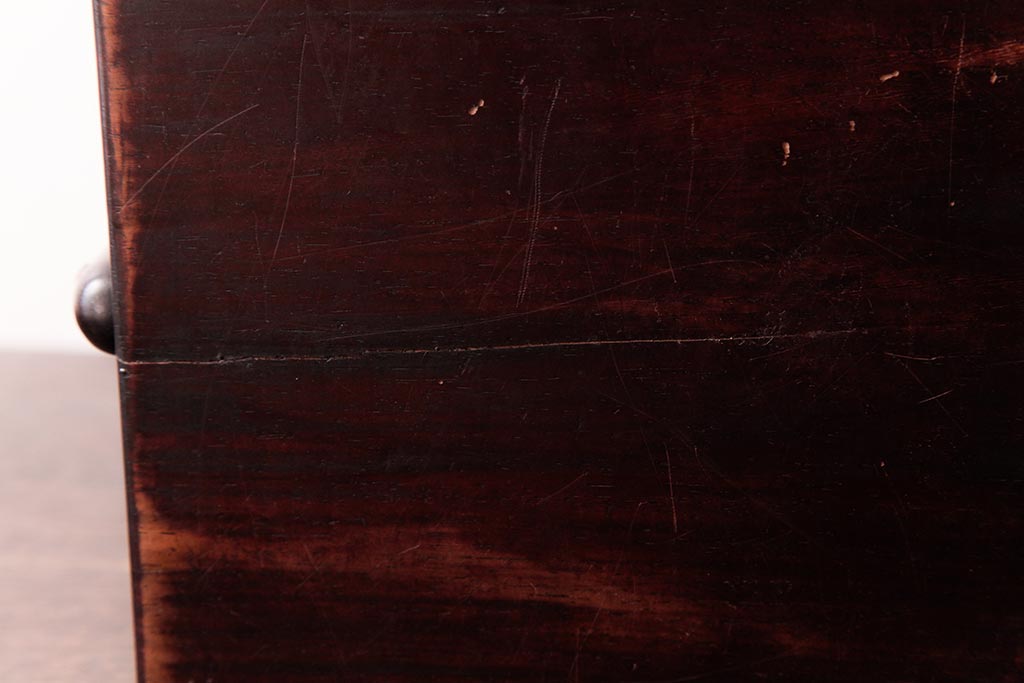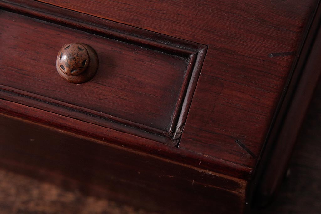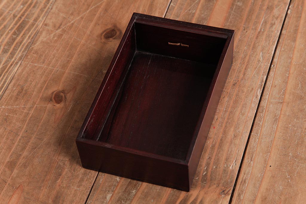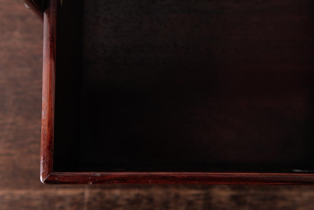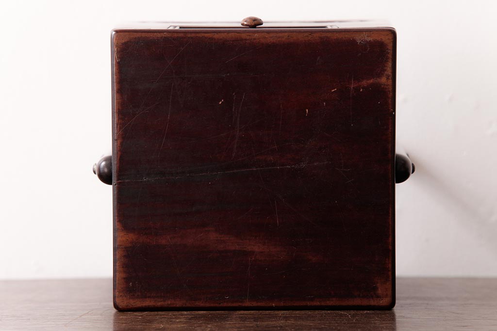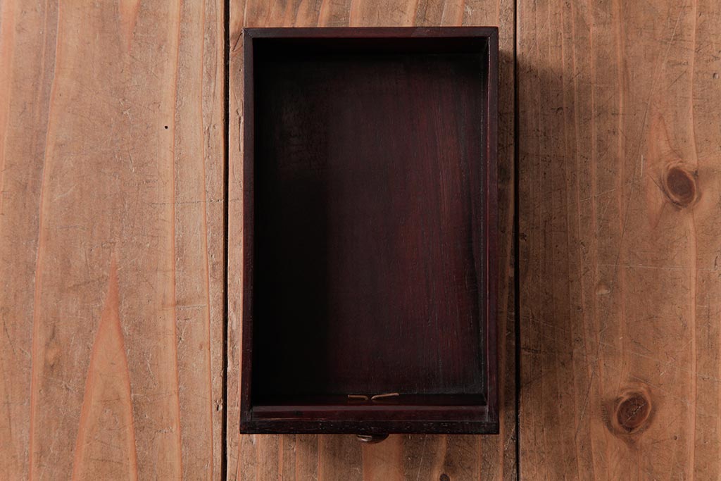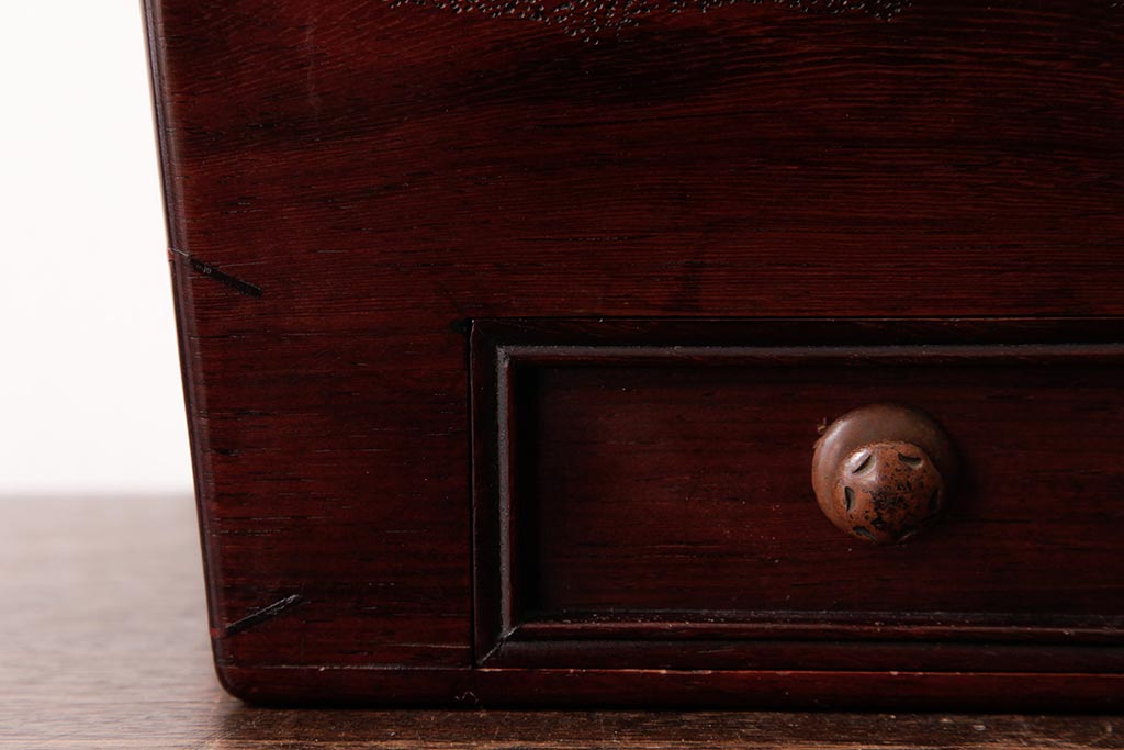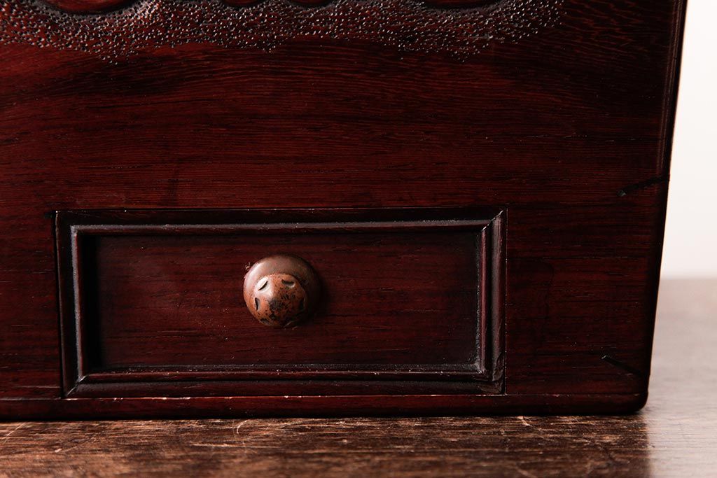 アンティーク雑貨 古民具・骨董 花梨材 引出し付き 蝶の透かし彫りが目を引く手提げ煙草盆(手付香盆、カリン材)