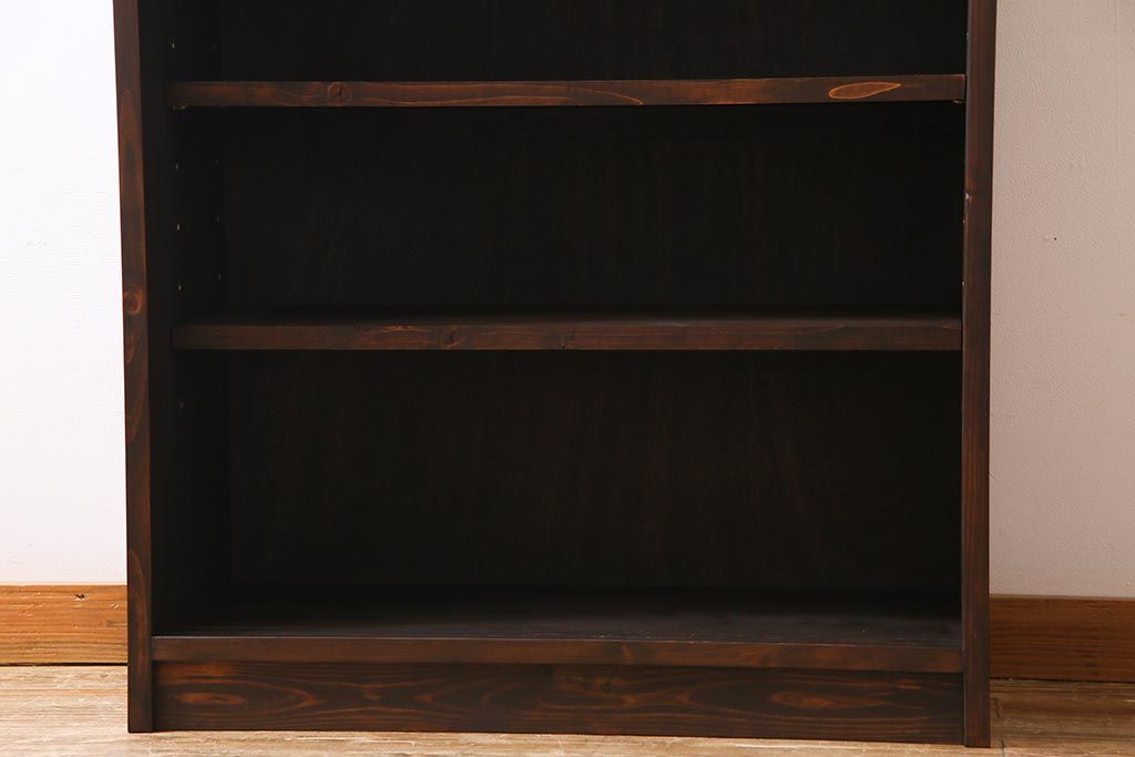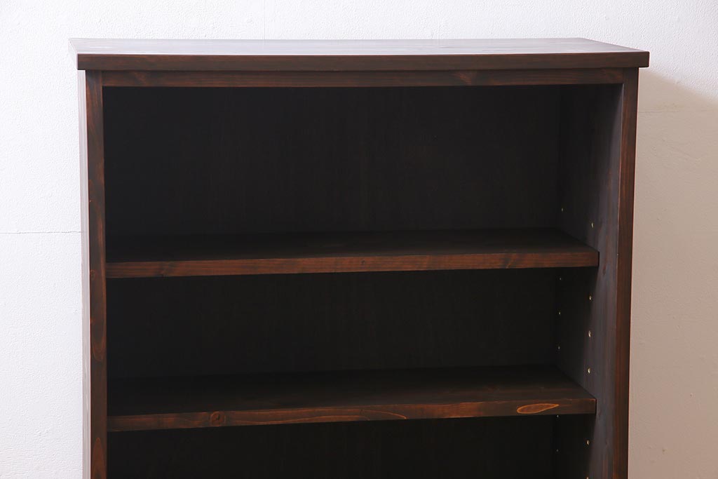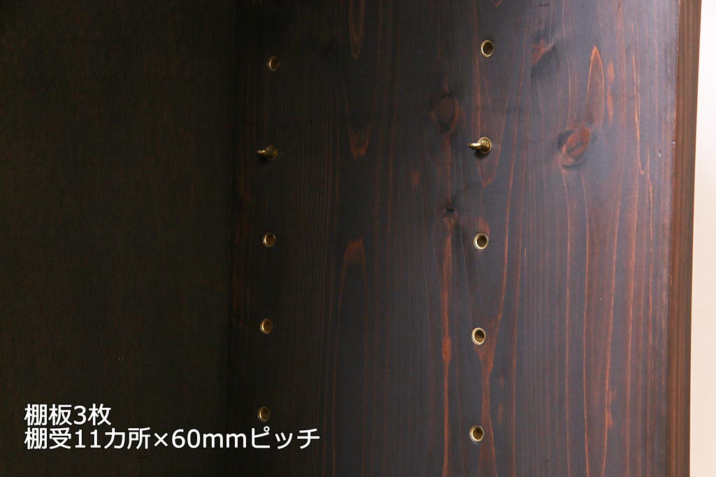 棚板は取り外しできます。棚板は3枚あり、棚受けは11ヶ所、60mmピッチで調整できます。棚幅サイズのものが1枚の作りです。