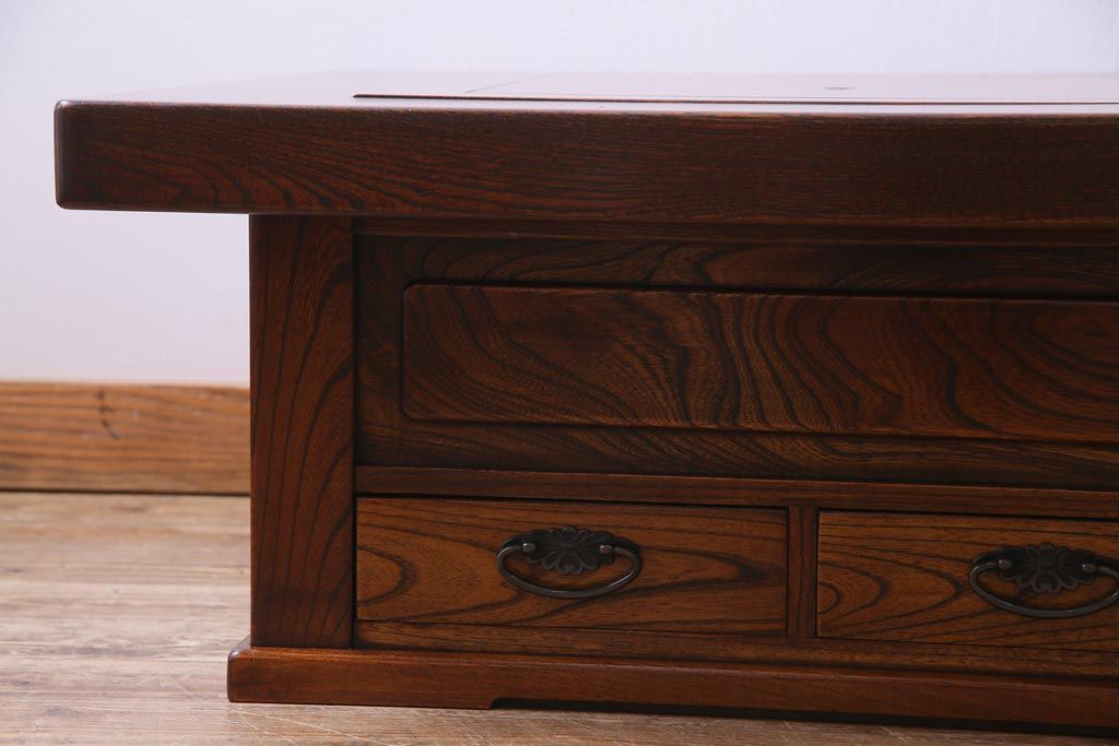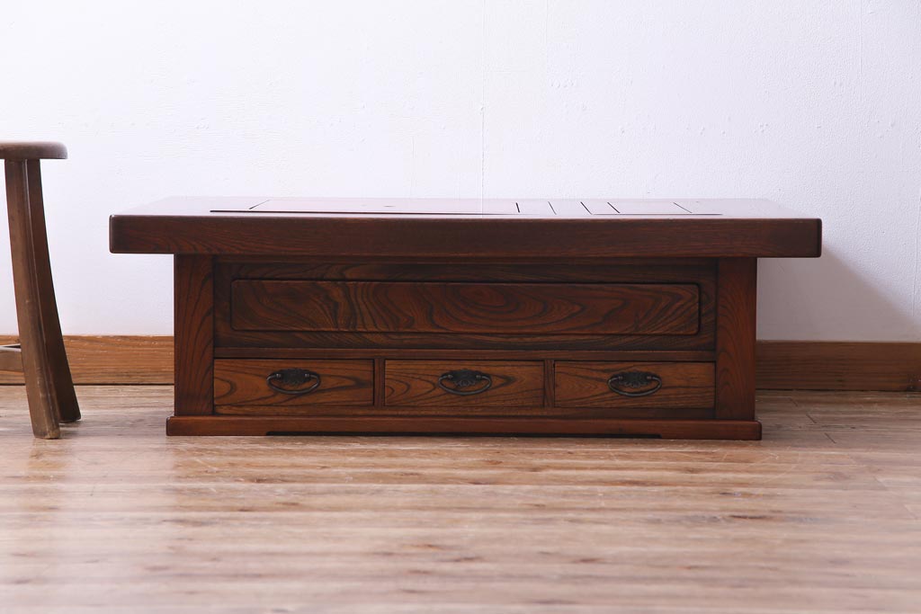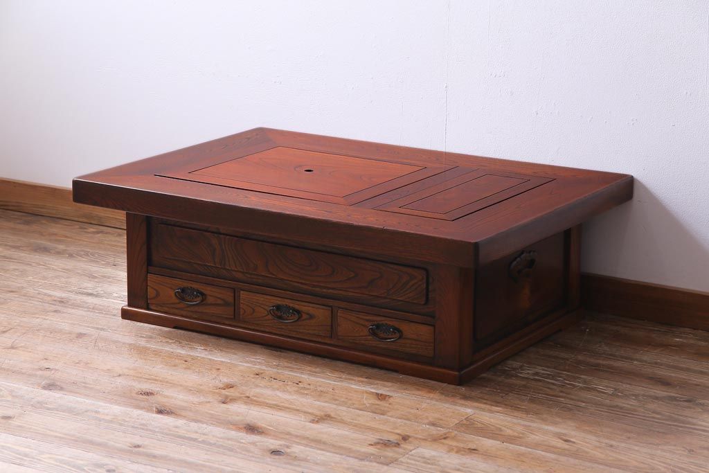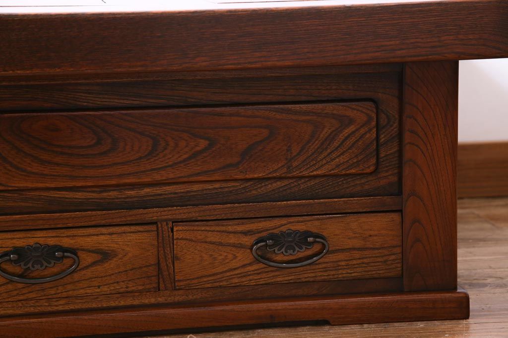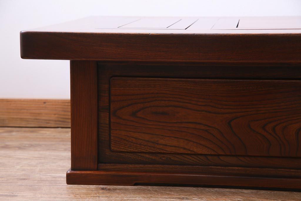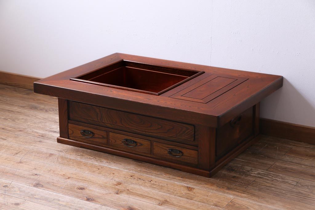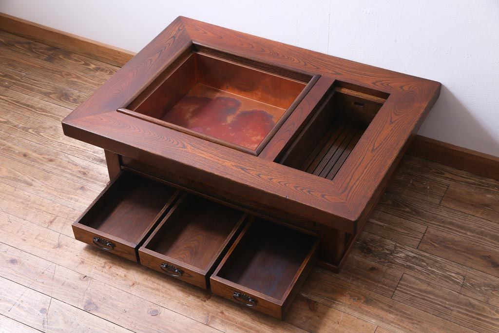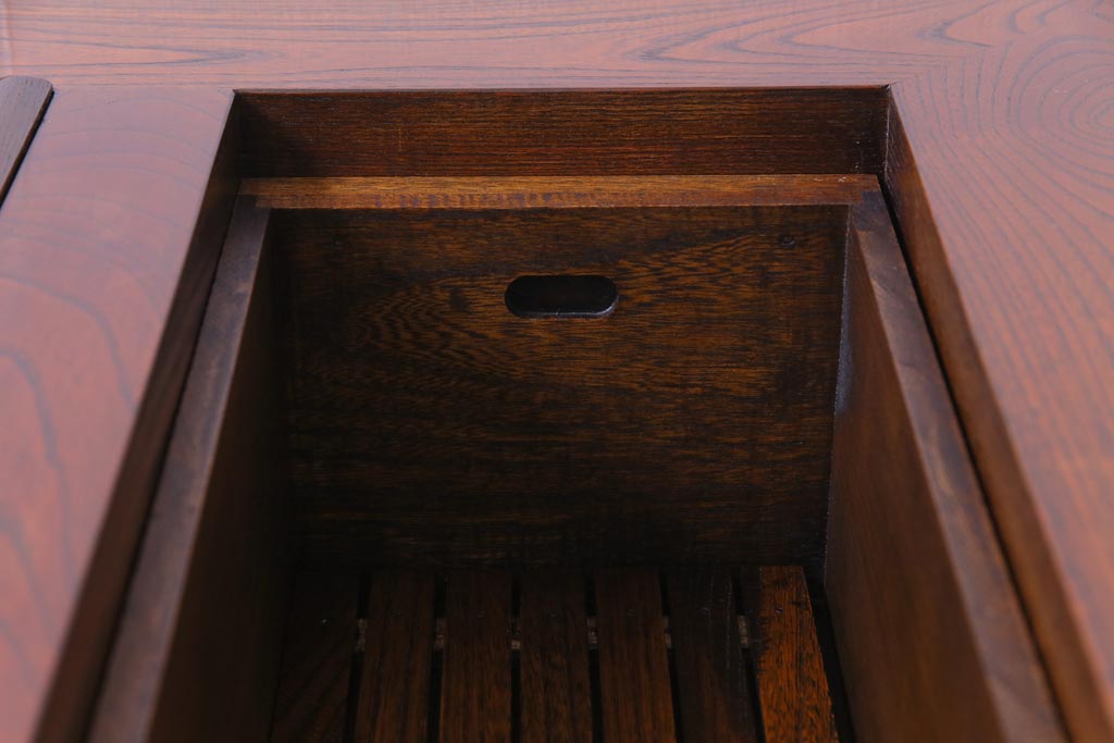 テーブル> 座卓 > アンティーク雑貨 ビンテージ ケヤキ材の杢目が美しい手の込んだ関西火鉢(長火鉢、囲炉裏)