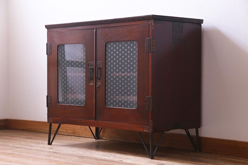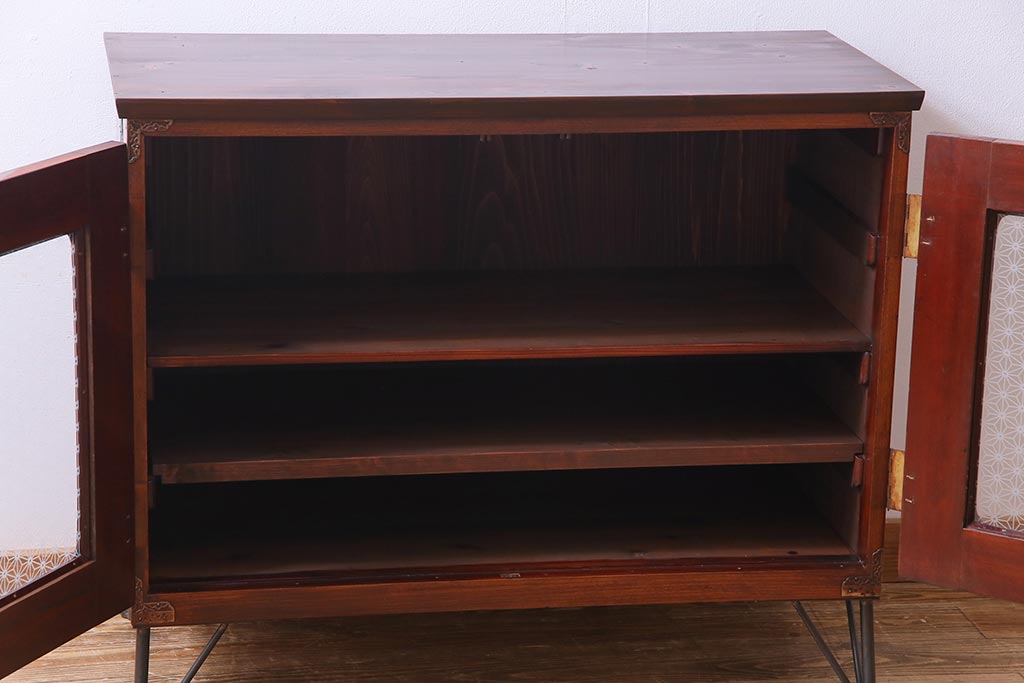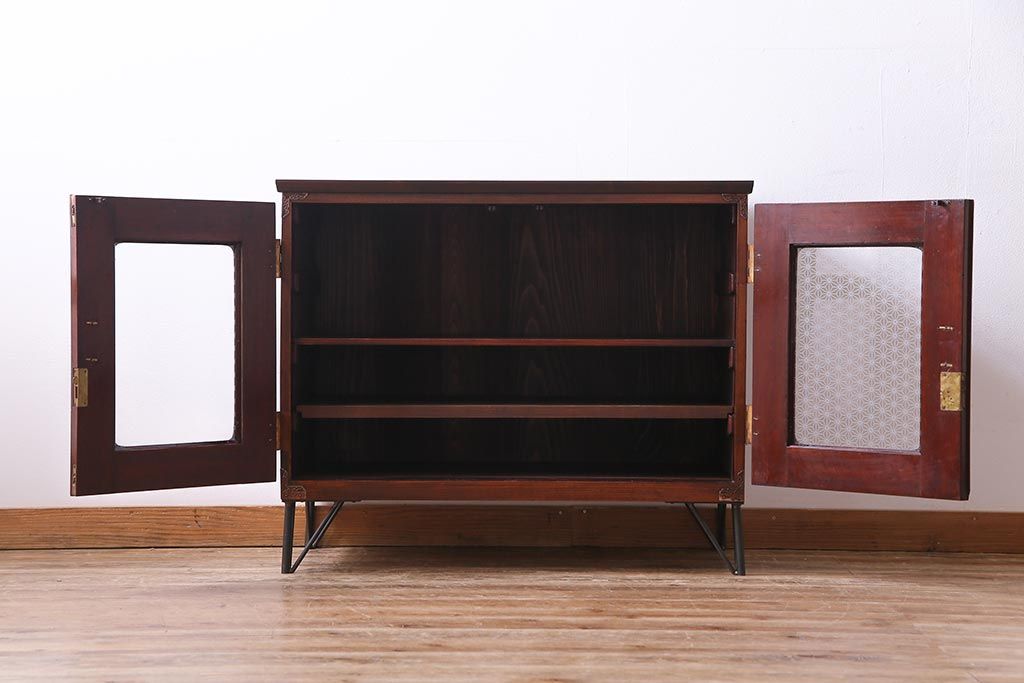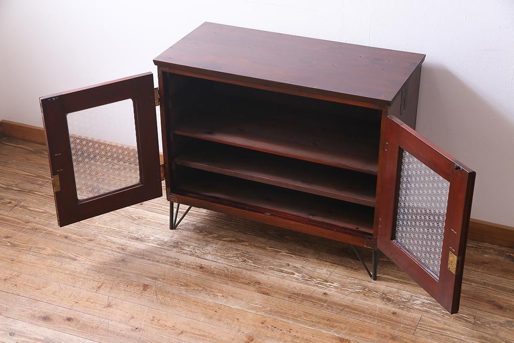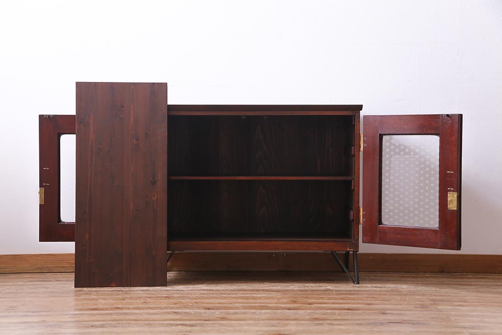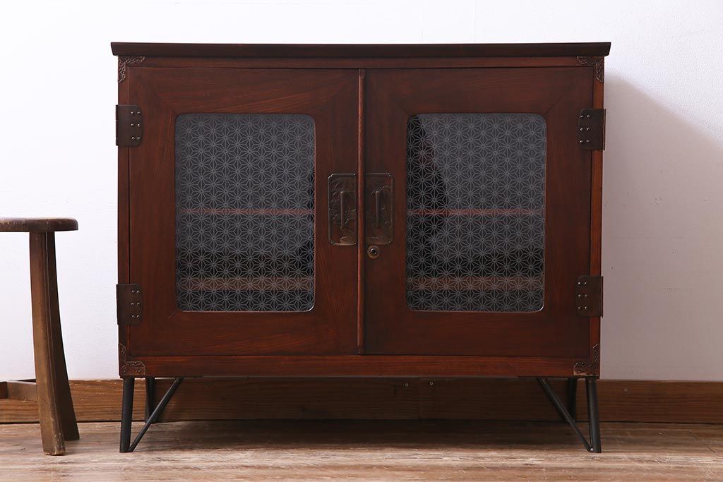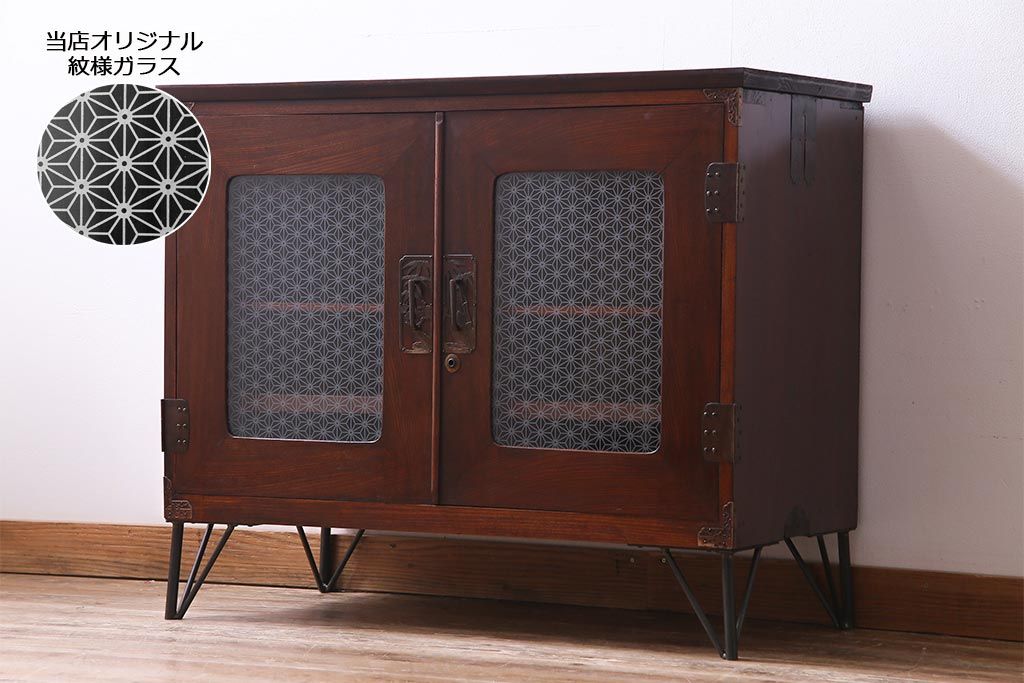 和製アンティーク 前面ケヤキ材 オリジナルガラス入り レトロな趣き溢れる観音開きのローボード(リビングボード、収納棚)です。