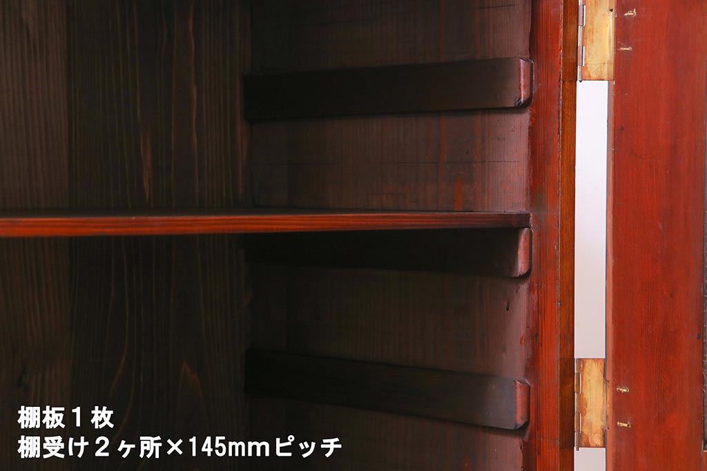 棚板は取り外しできます。棚板は1枚あります。棚受けは2ヶ所、145mmピッチで調整できます。棚幅サイズのものが1枚の作りです。