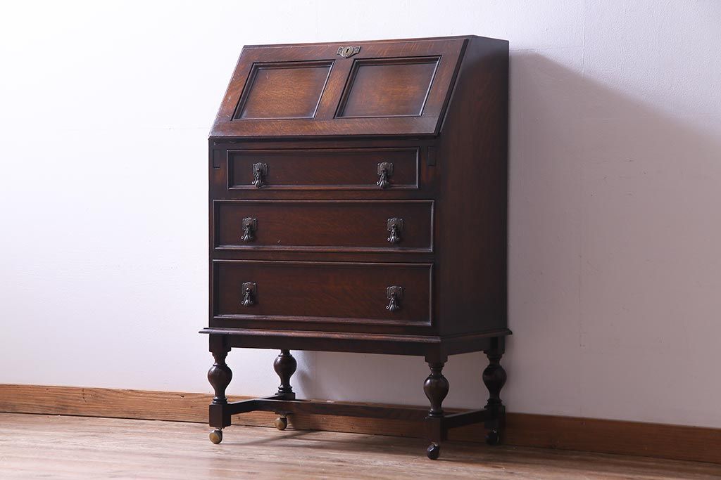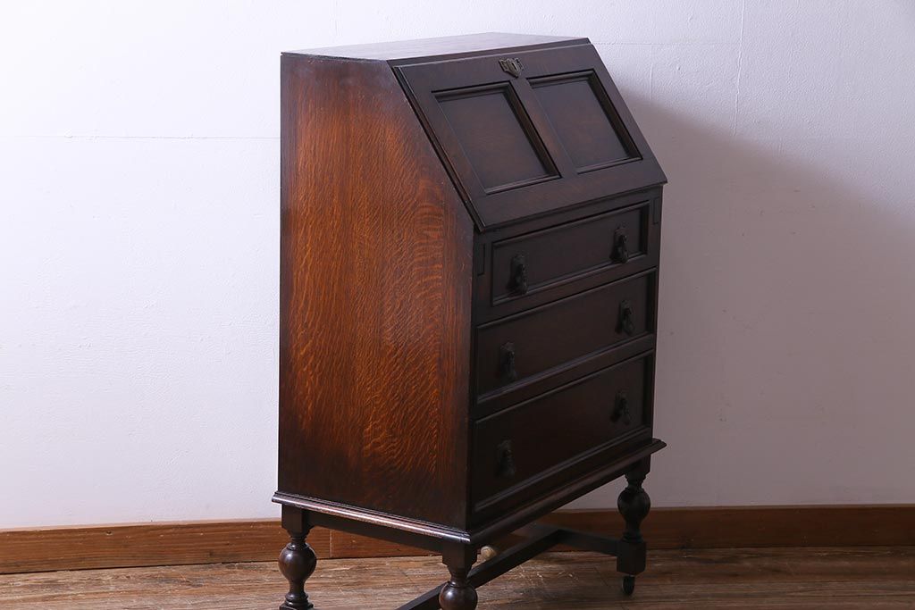 アンティーク家具 イギリスアンティーク オーク材 エレガントな佇まいが目を惹くコンパクトなライティングビューロー(簿記机、在宅ワーク、在宅用デスク)