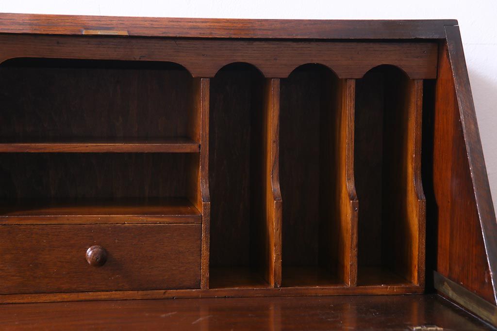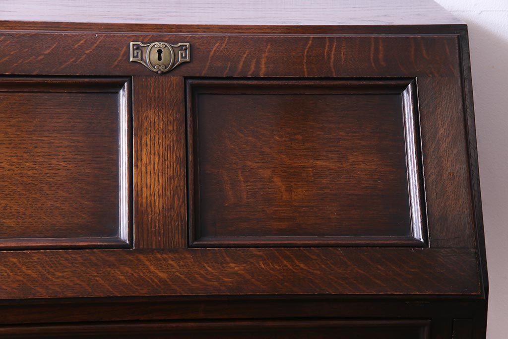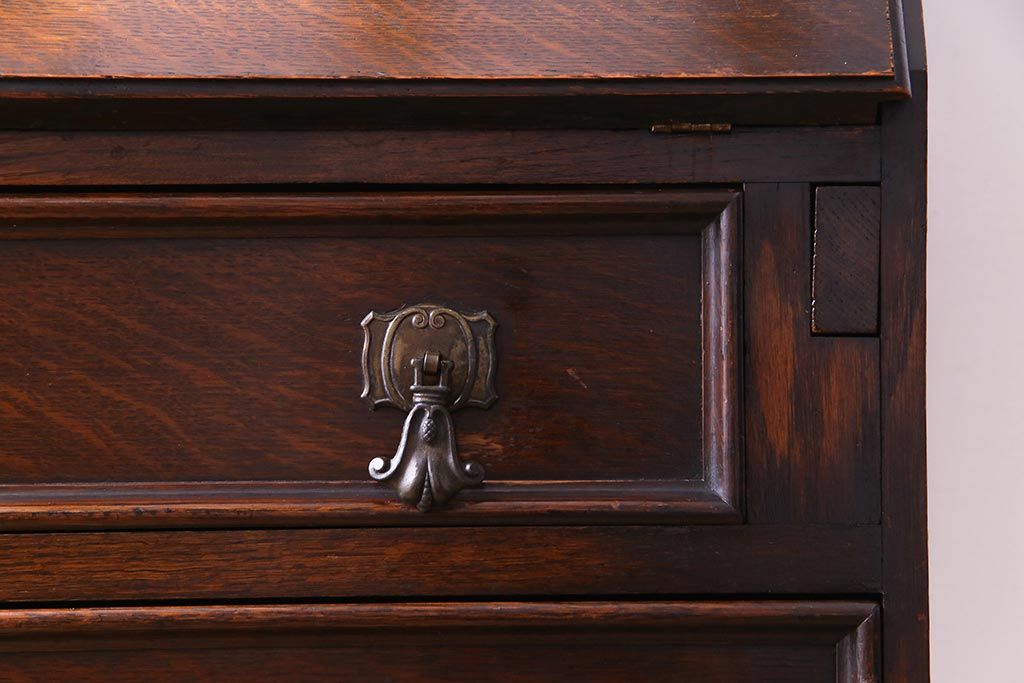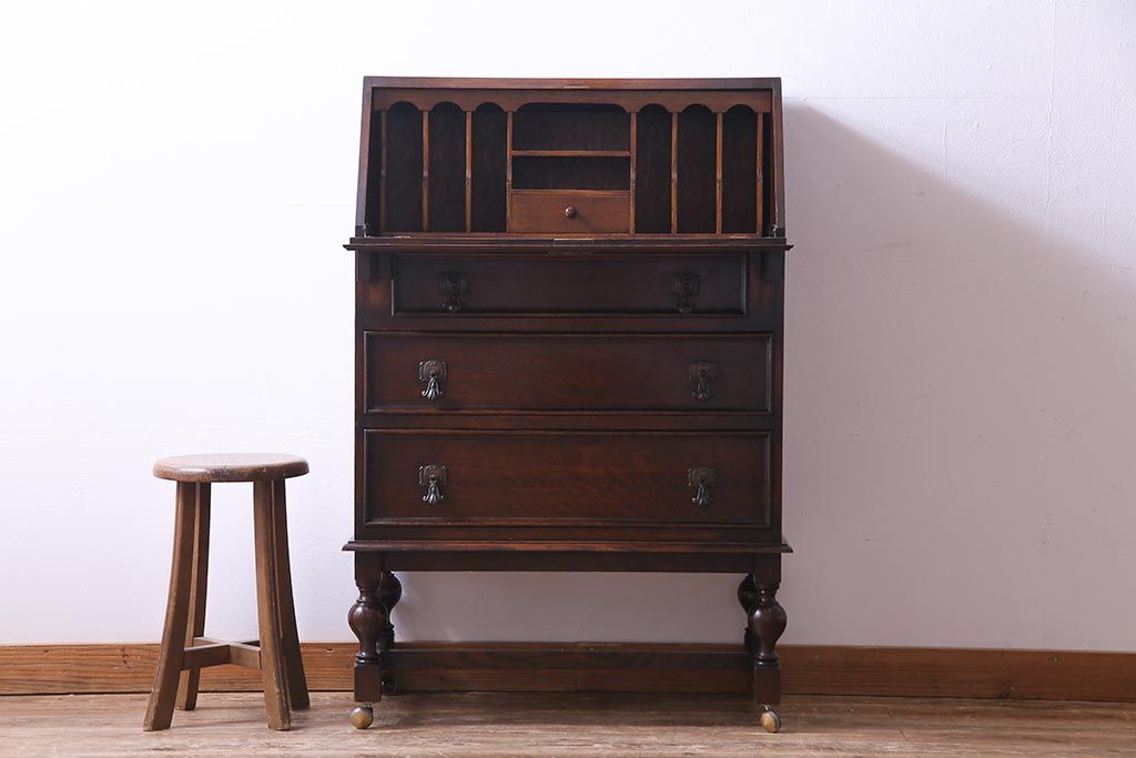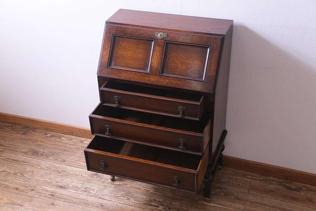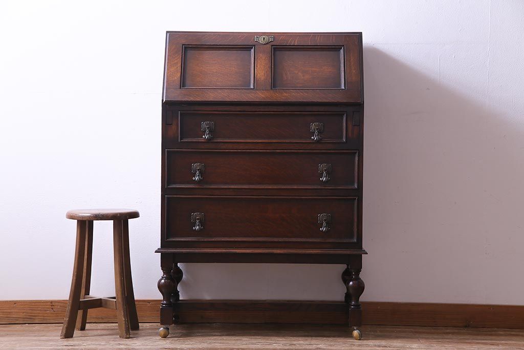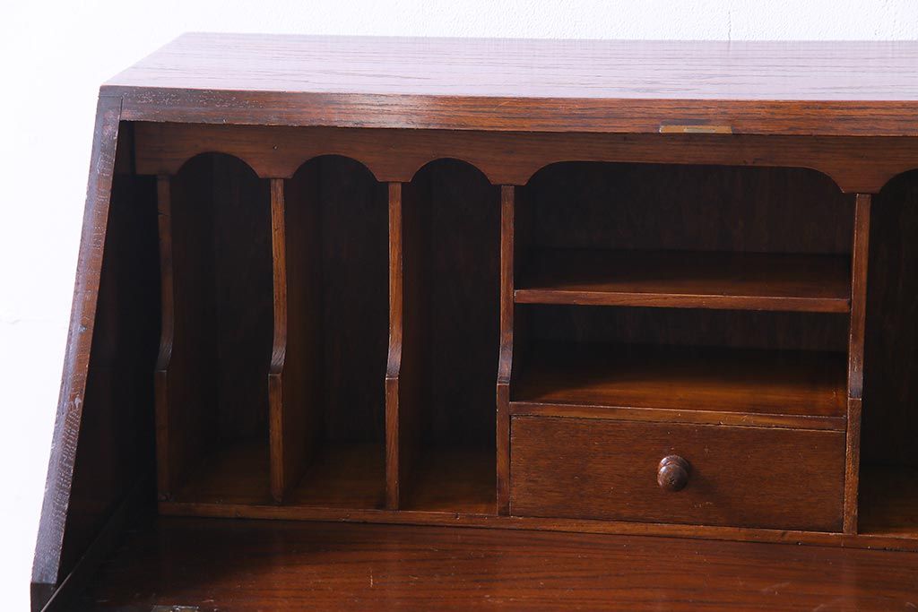 ラフジュ工房> デスク> ライティングビューロー・簿記机 > アンティーク家具 イギリスアンティーク オーク材 エレガントな佇まいが目を惹くコンパクトなライティングビューロー(簿記机、在宅ワーク、在宅用デスク)