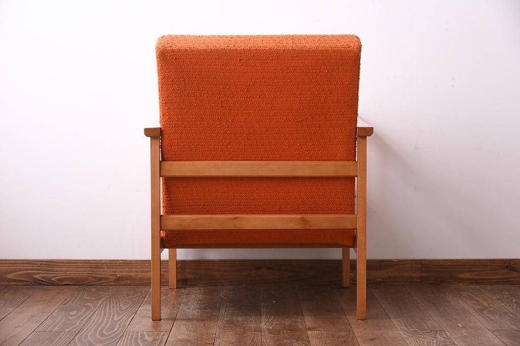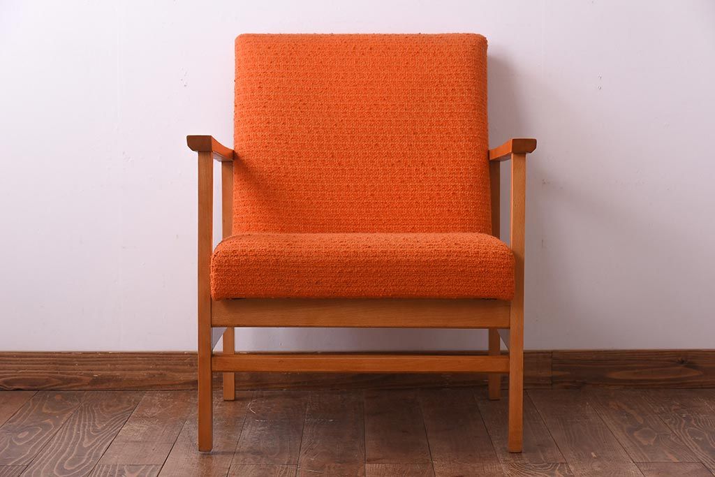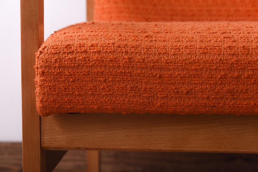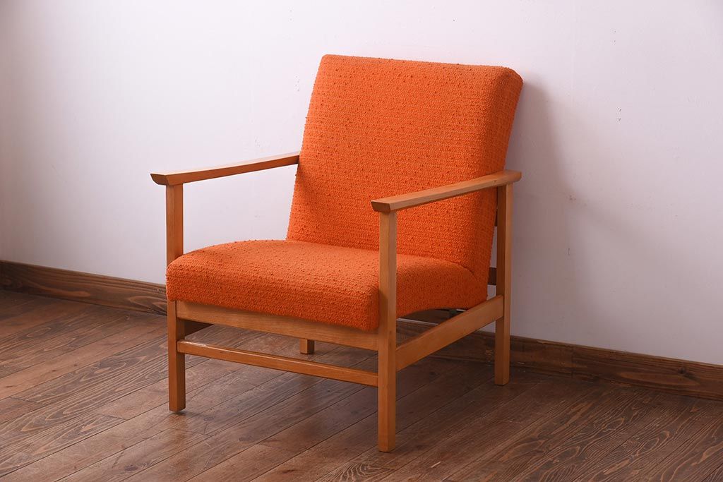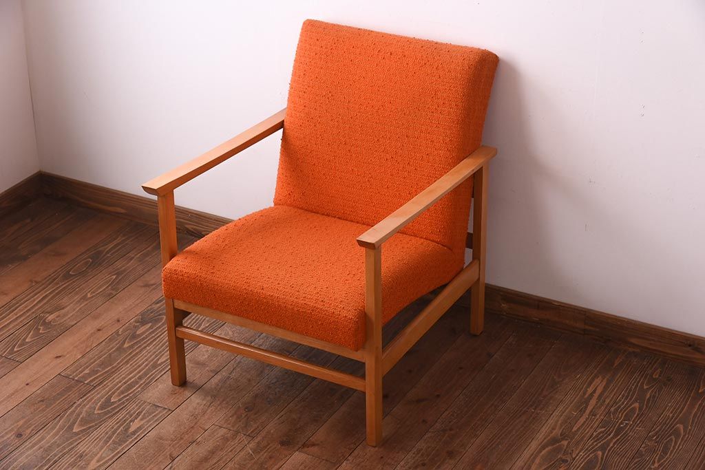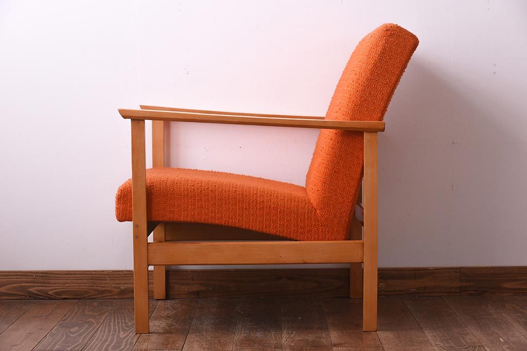 ヴィンテージ家具 イギリスビンテージ ビーチ材 オレンジのファブリックが目を引く一人掛けソファ(1)