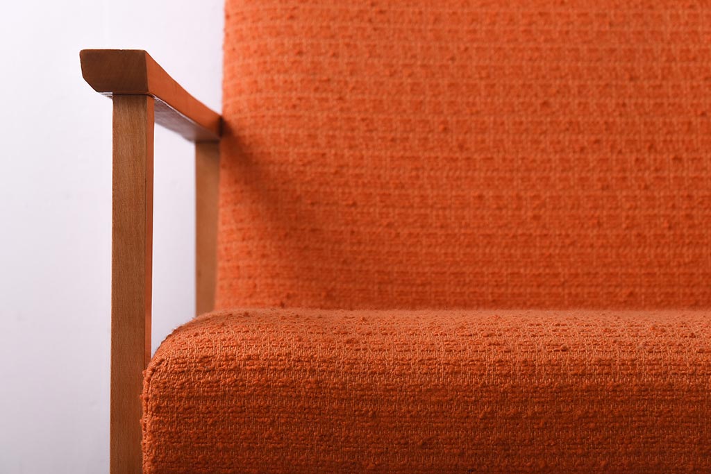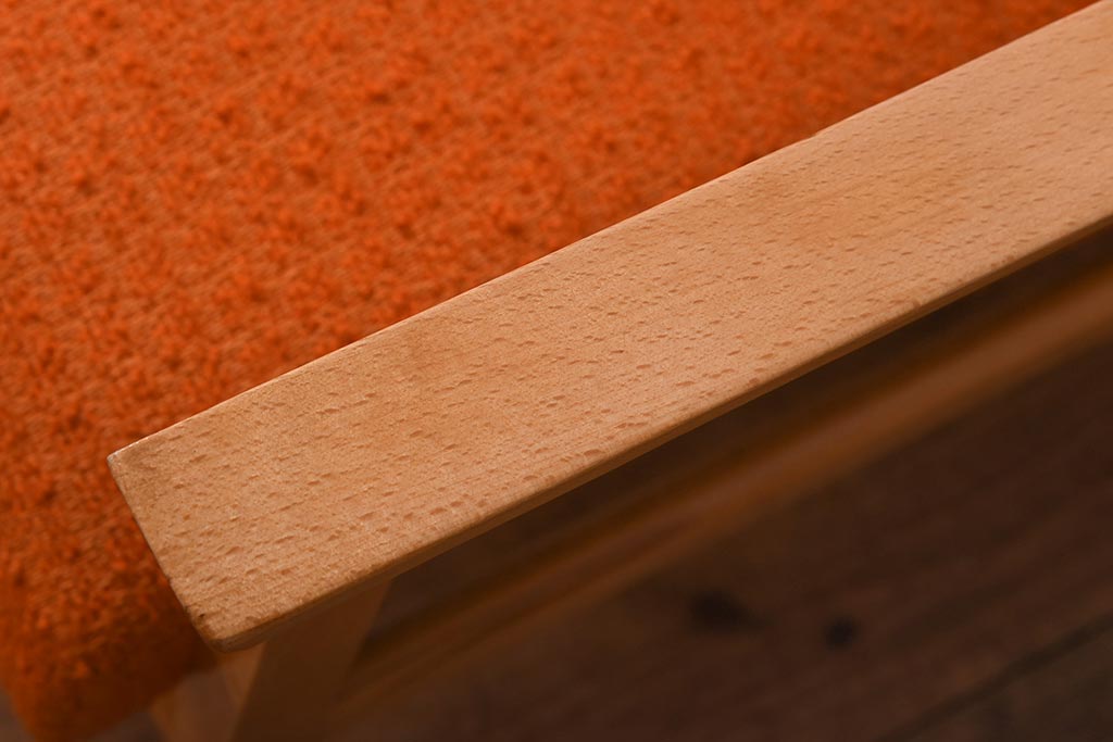 ラフジュ工房> ソファ> 1人掛けソファ > ヴィンテージ家具 イギリスビンテージ ビーチ材 オレンジのファブリックが目を引く一人掛けソファ(1)