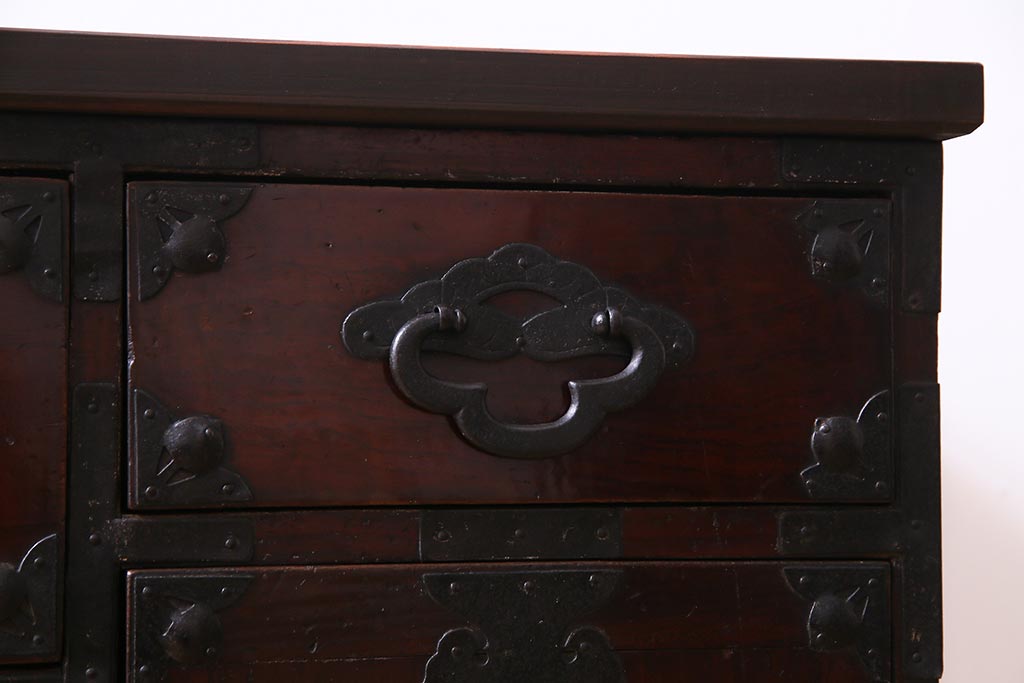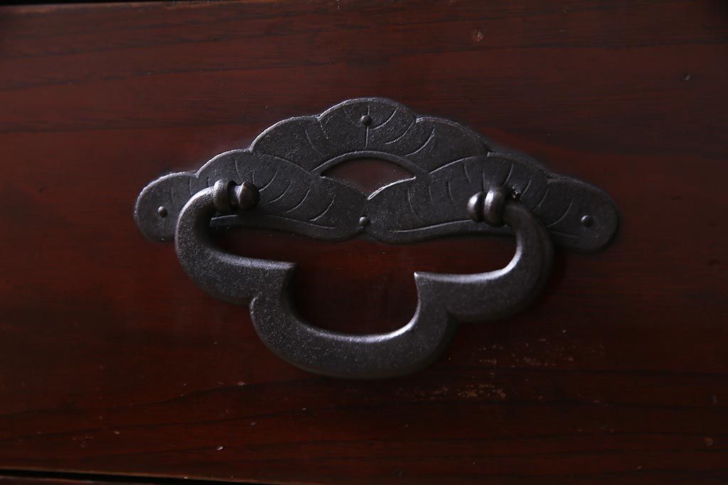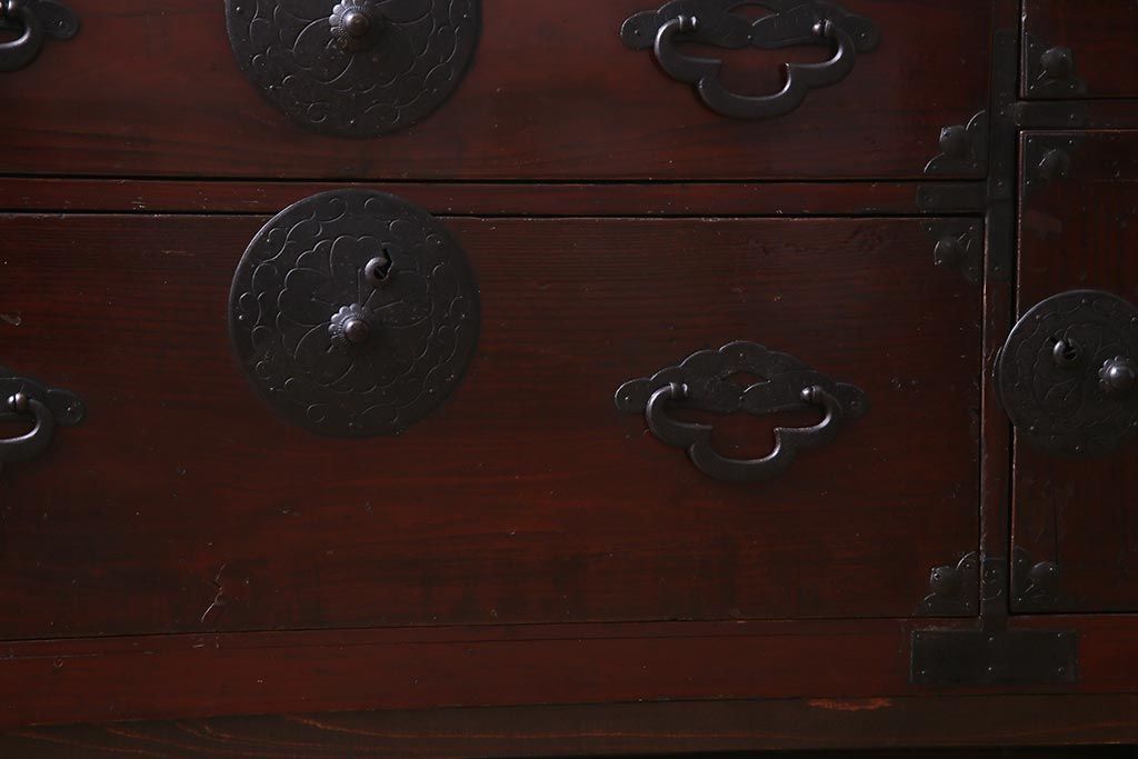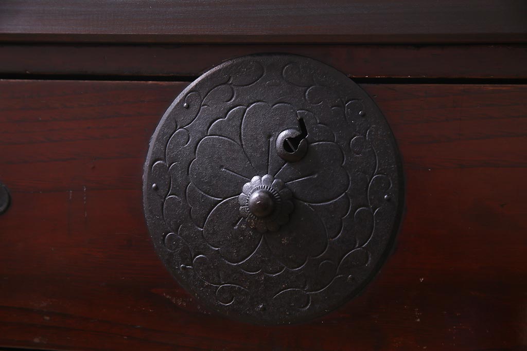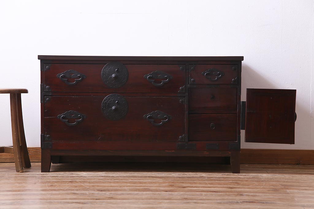 アンティーク家具 和製アンティーク リメイク 前面栗材 細かな装飾の金具が目を引く米沢箪笥ローボード(ローチェスト、引き出し、和タンス)