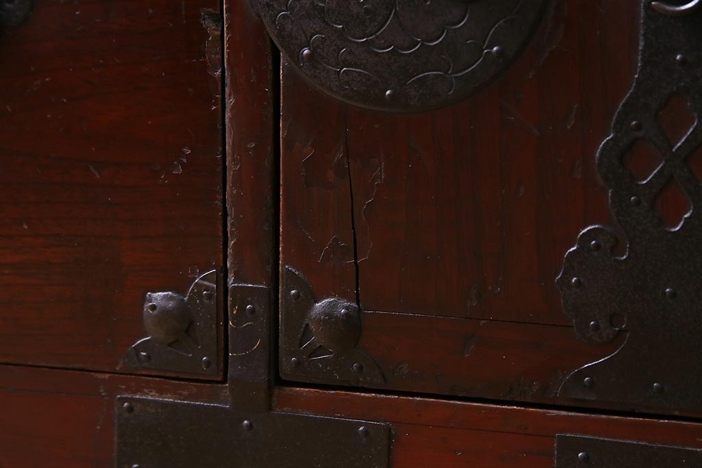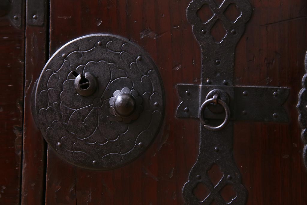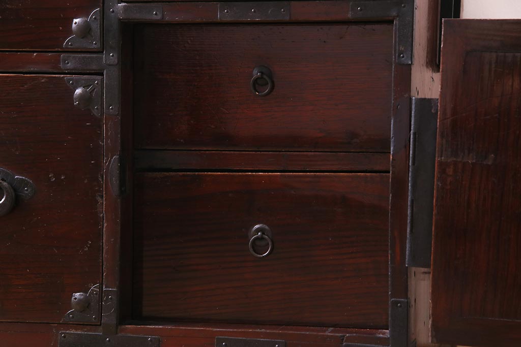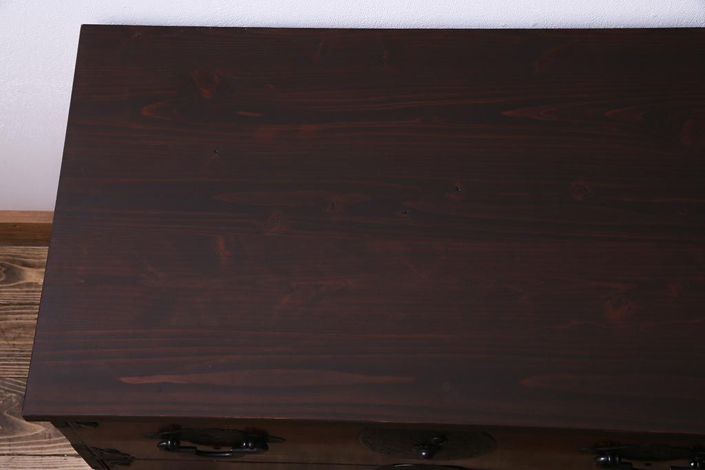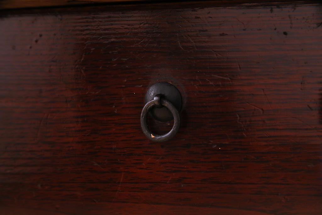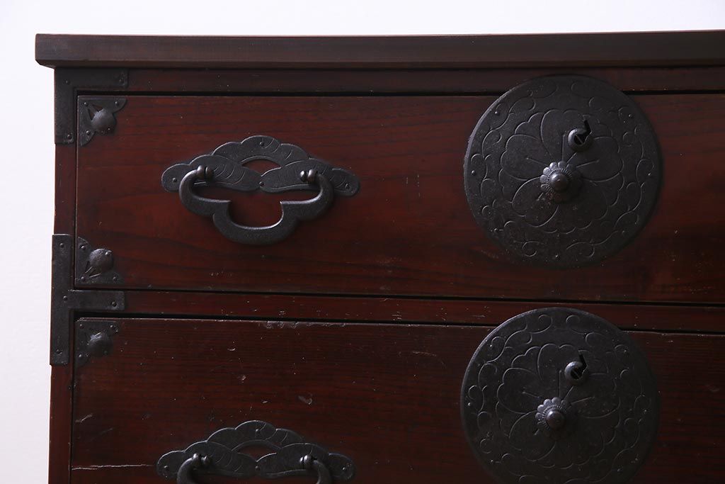 アンティーク家具 和製アンティーク リメイク 前面栗材 細かな装飾の金具が目を引く米沢箪笥ローボード(ローチェスト、引き出し、和タンス)