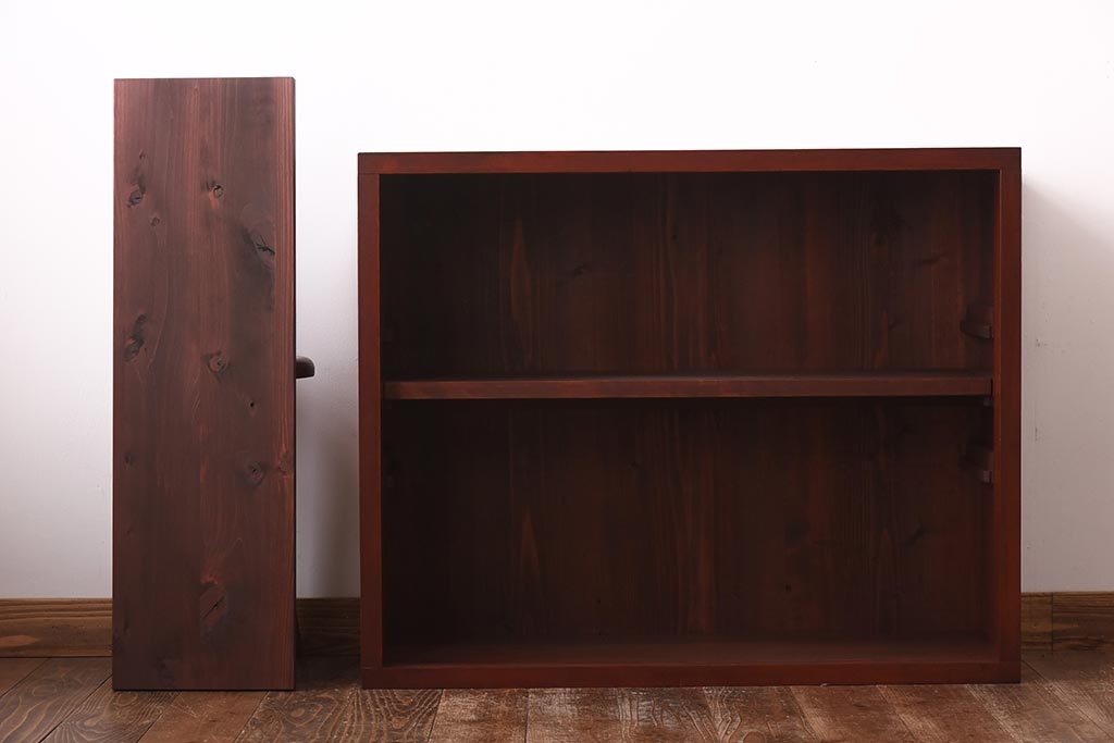 棚板は取り外しできます。棚板は2枚あります。棚受けは3ヶ所、90mmと105mmピッチで調整できます。棚幅サイズのものが1枚の作りです。