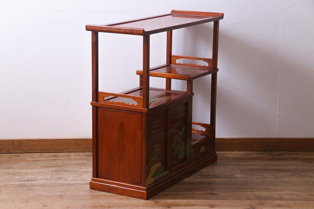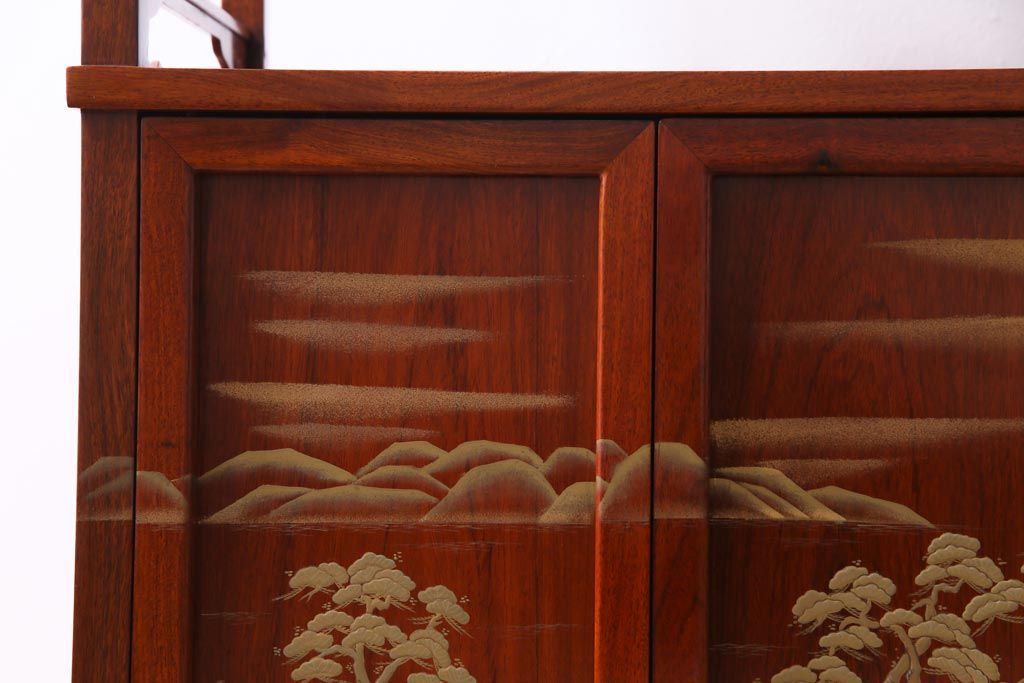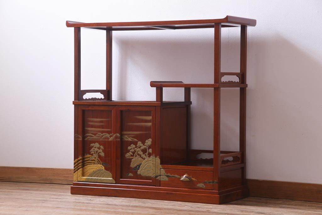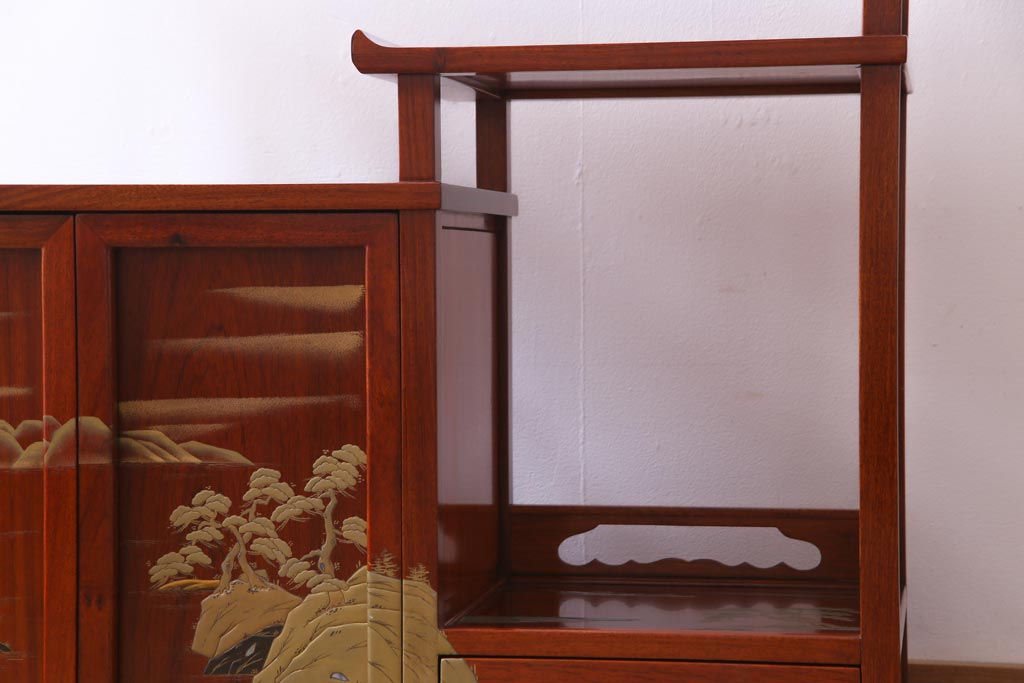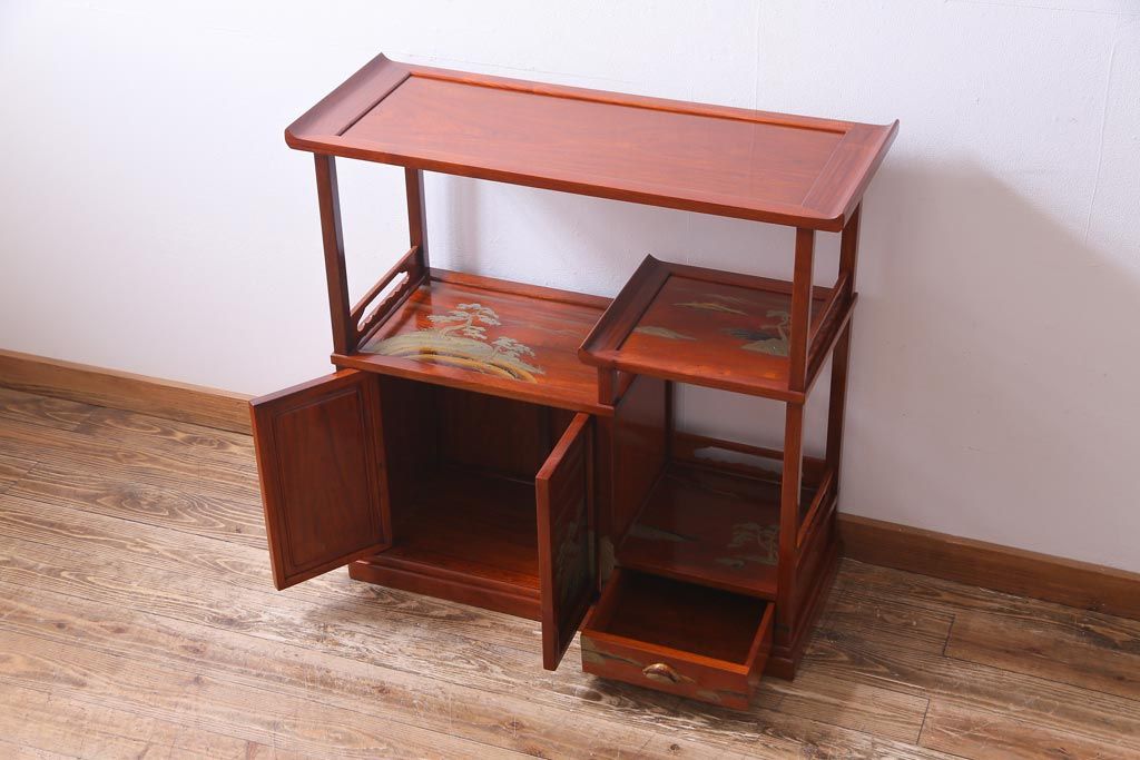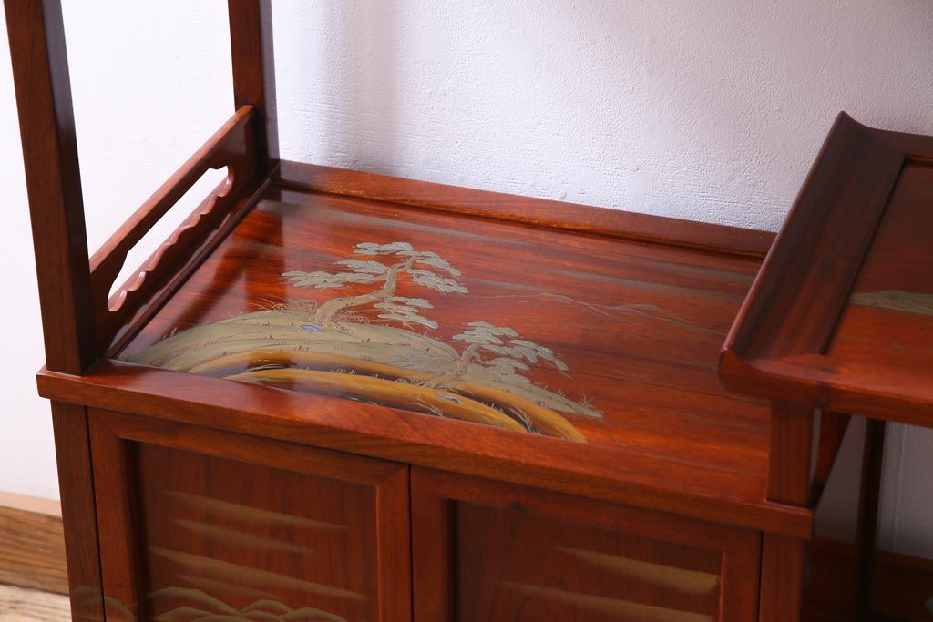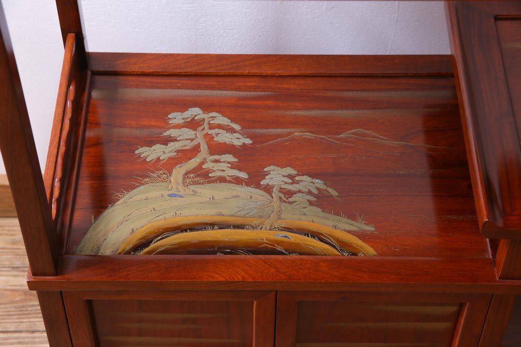 民芸家具 > 中古 カリン材 漆塗り 蒔絵で描かれた松の図が美しい茶棚(飾り棚、花梨材)(定価約40万円)
