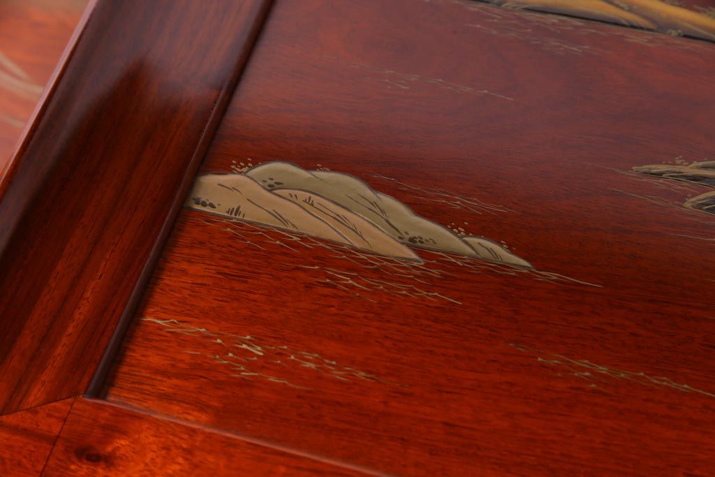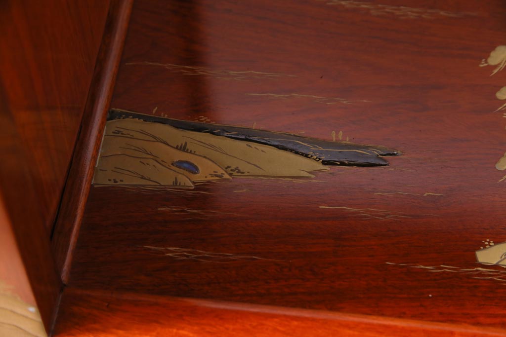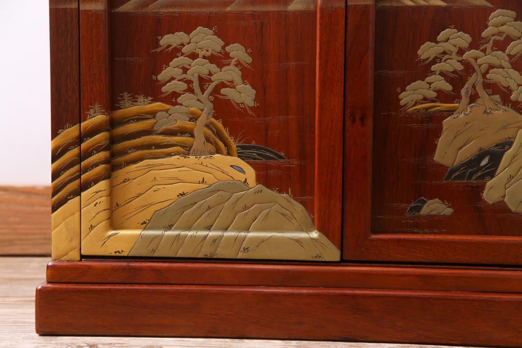 和箪笥> 茶箪笥・茶棚 > 中古 カリン材 漆塗り 蒔絵で描かれた松の図が美しい茶棚(飾り棚、花梨材)(定価約40万円)