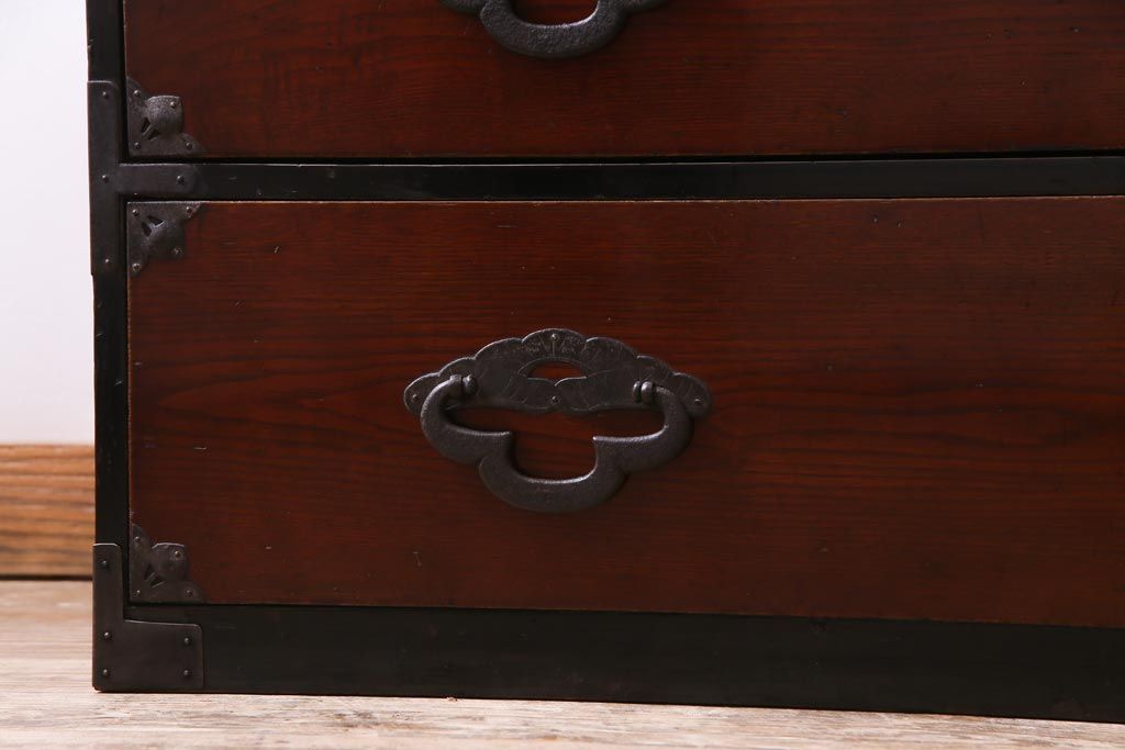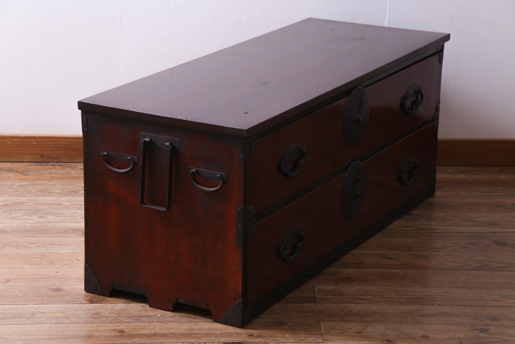 ラフジュ工房> 和箪笥> 衣装箪笥 > アンティーク家具 和製アンティーク リメイク 前面栗材 桜丸金具 漆塗りが上品な印象を与える米沢箪笥ローボード(ローチェスト、引き出し)