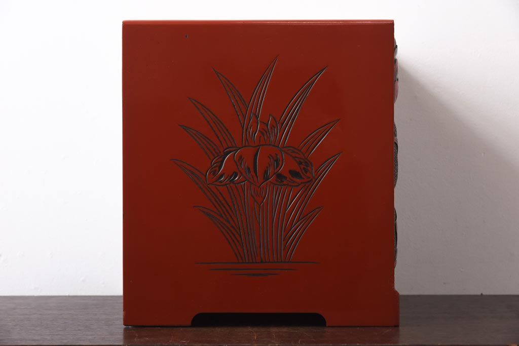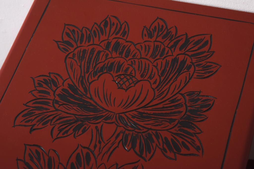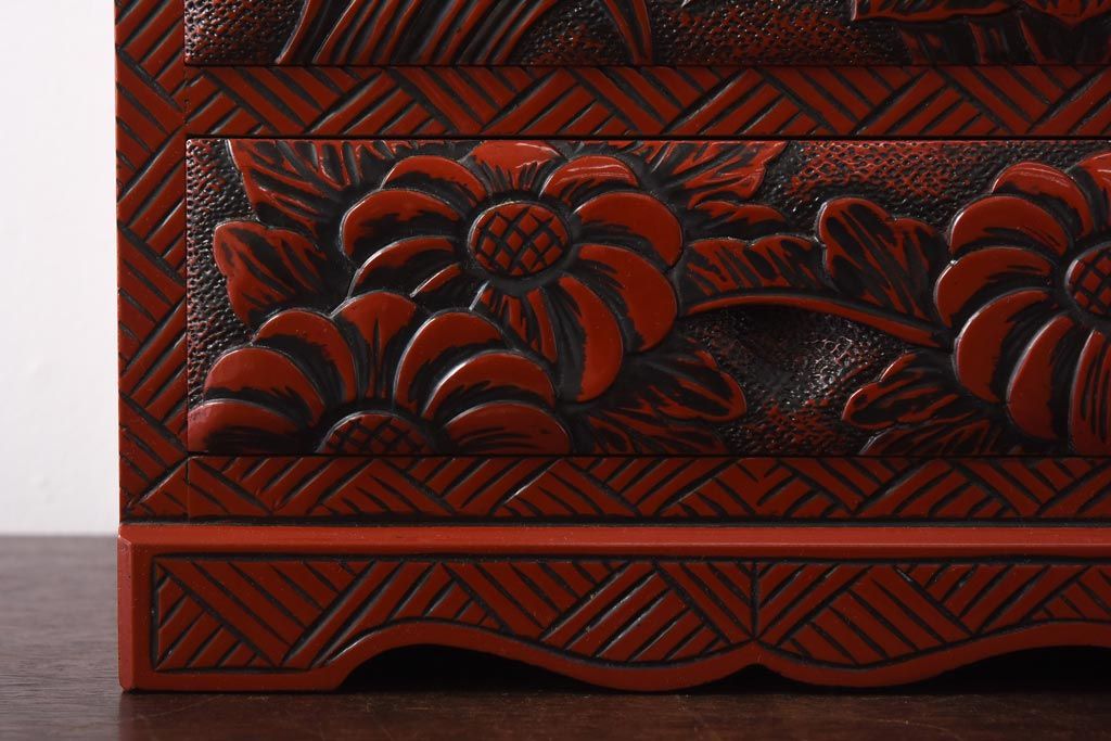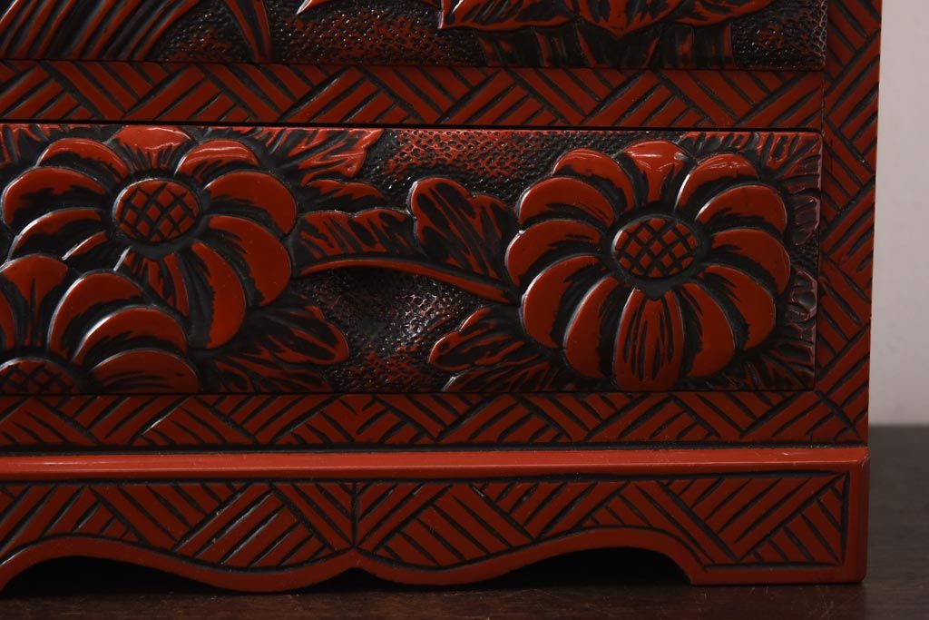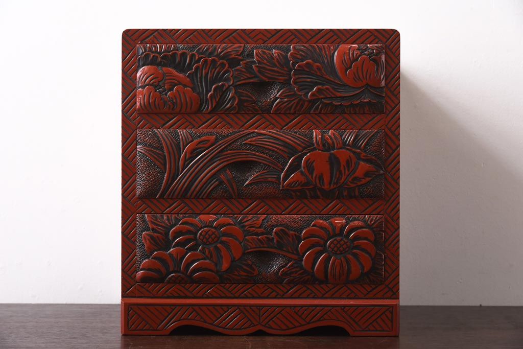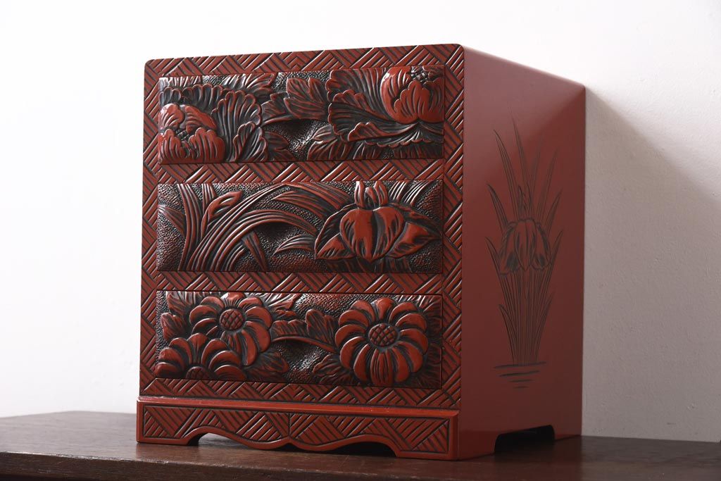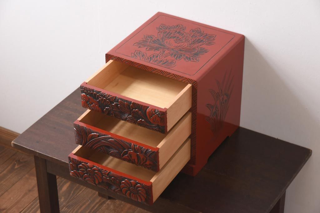 中古 伝統工芸 朱塗り 牡丹・菖蒲・菊 華やかさを添える日光彫りの小引き出し(小物収納)