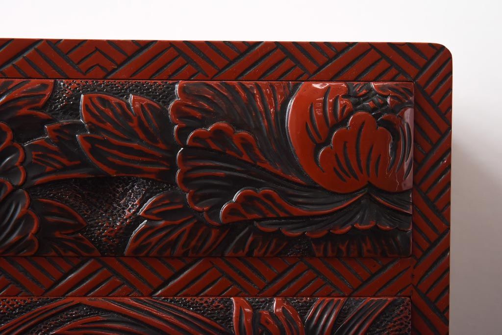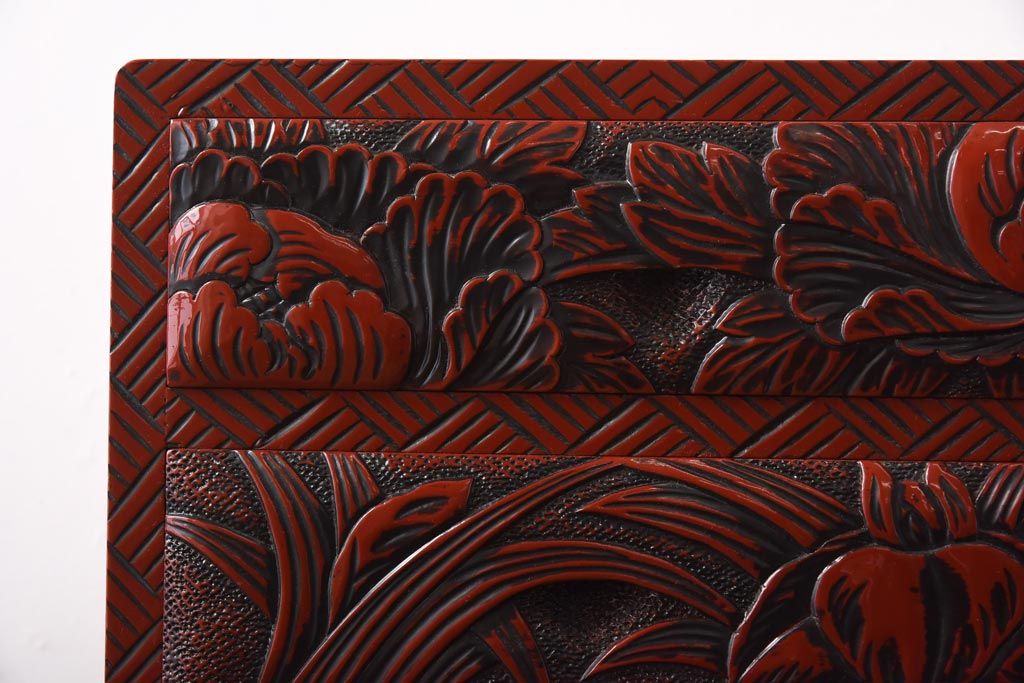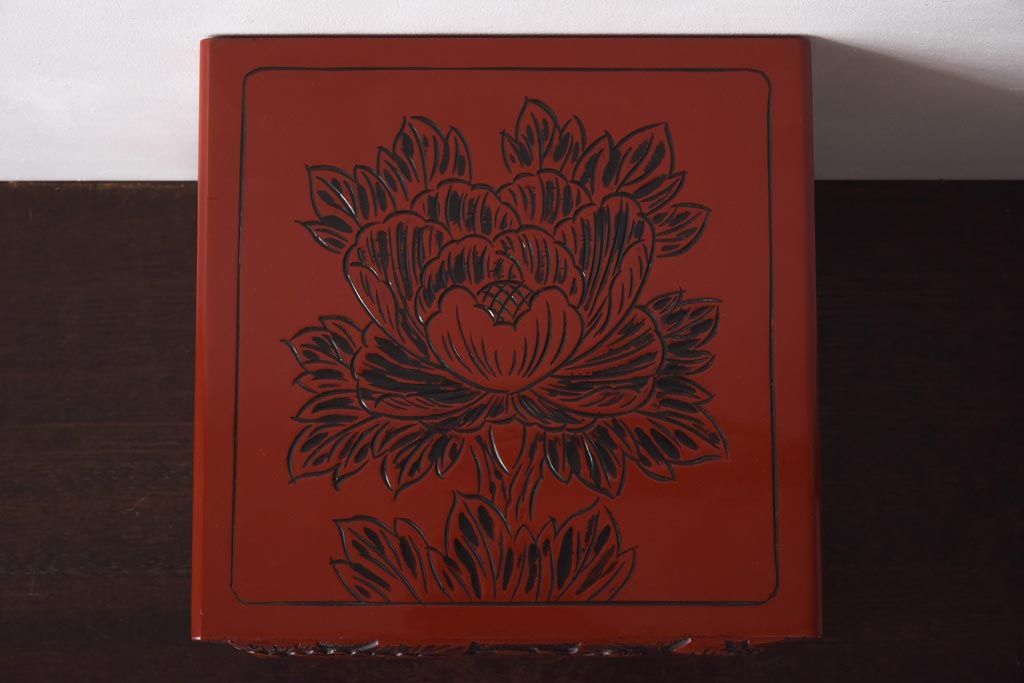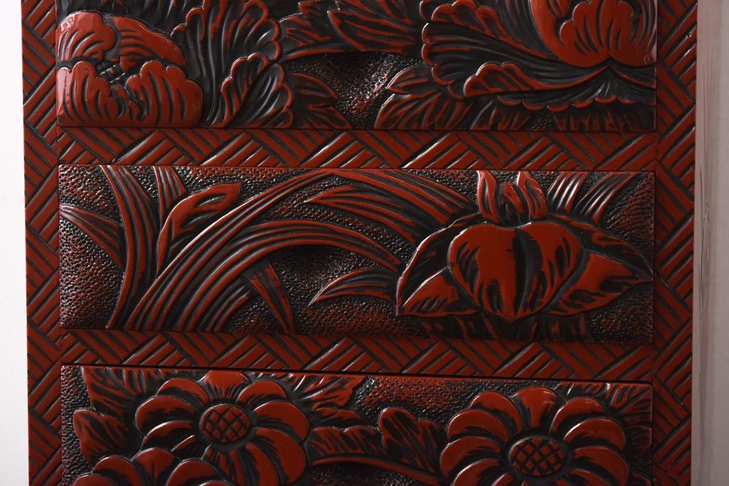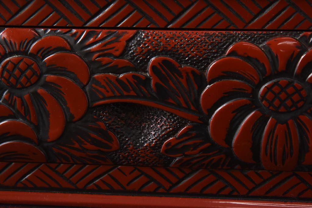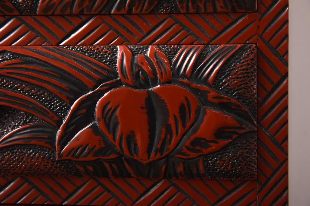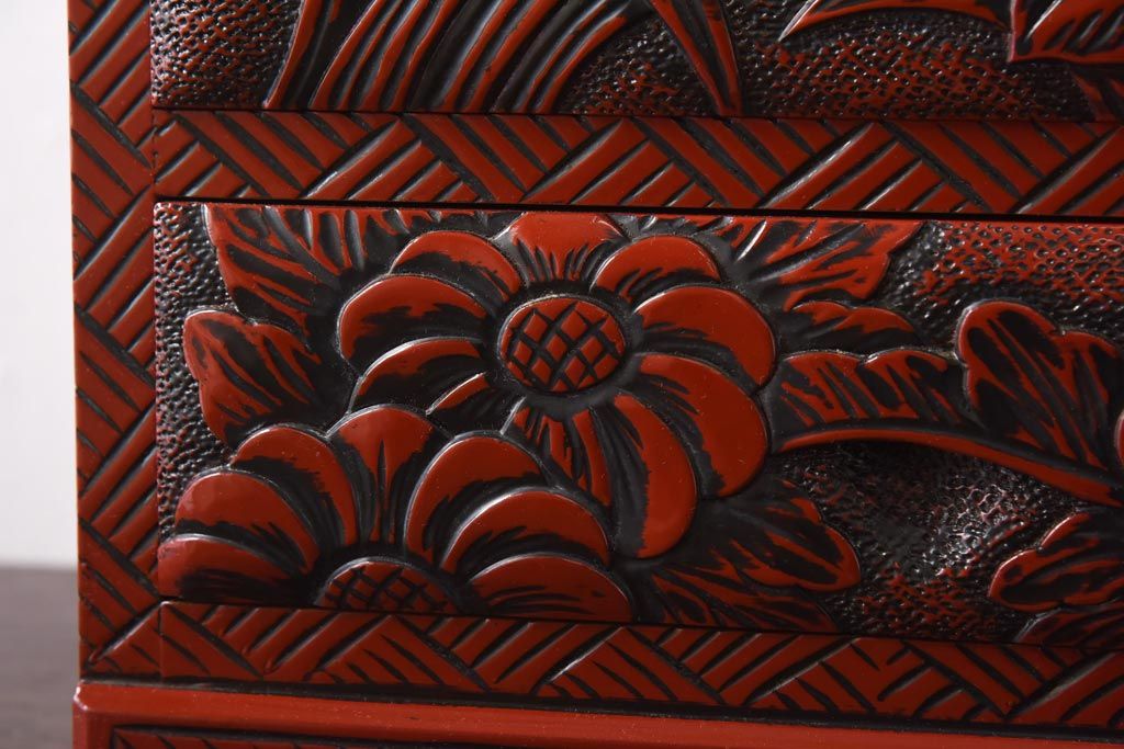 中古 伝統工芸 朱塗り 牡丹・菖蒲・菊 華やかさを添える日光彫りの小引き出し(小物収納)