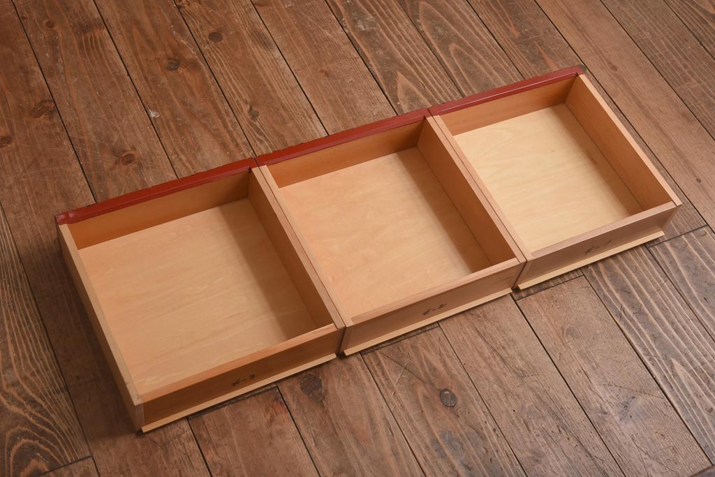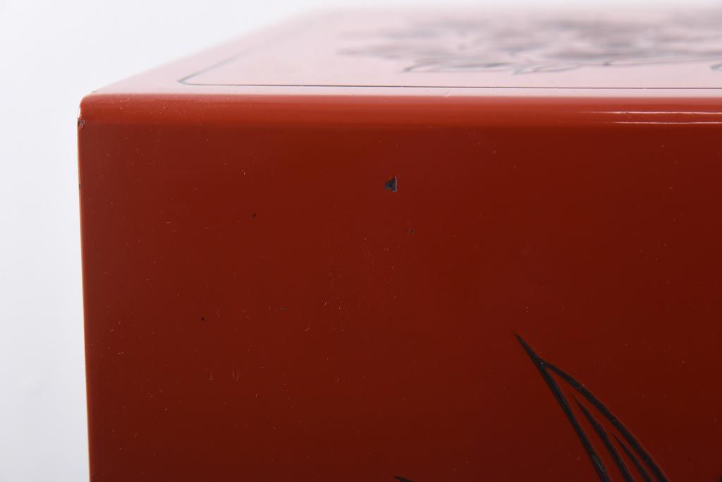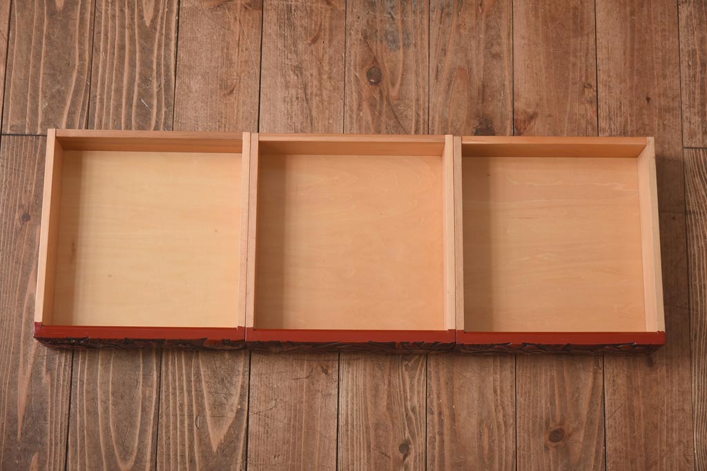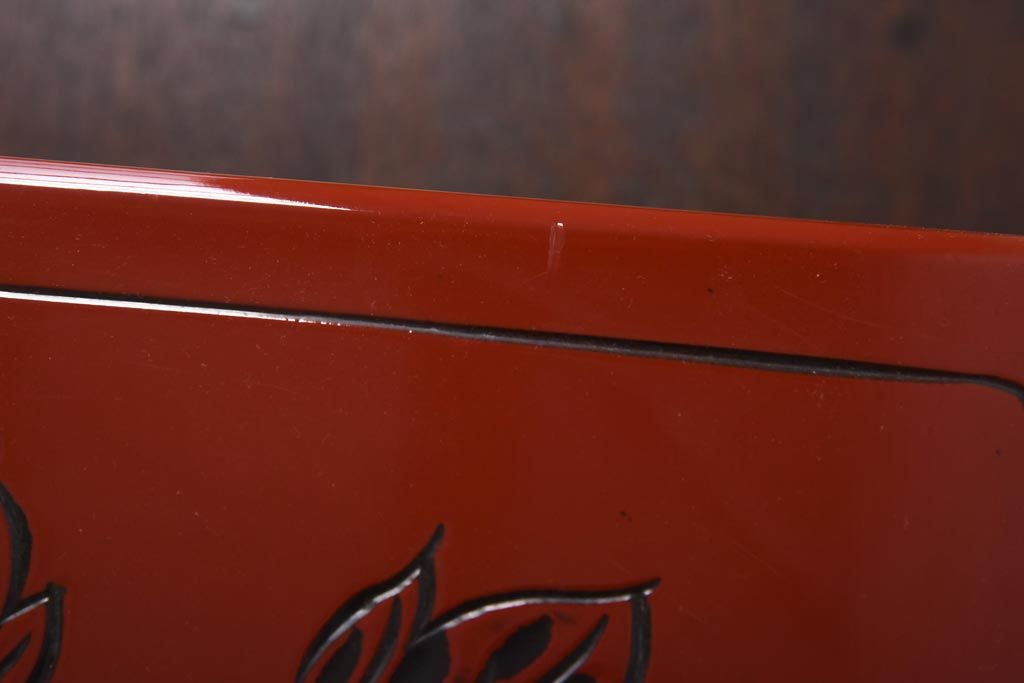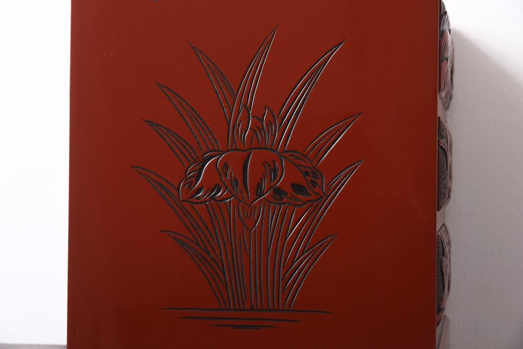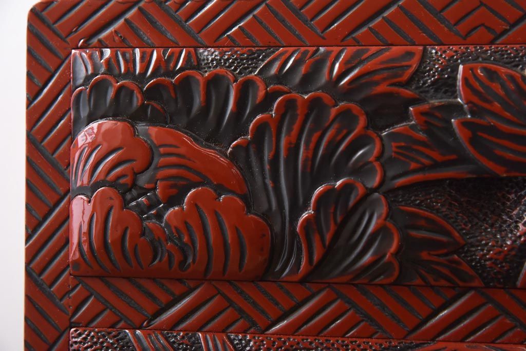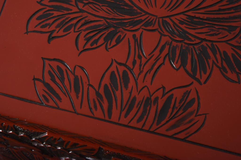 中古 伝統工芸 朱塗り 牡丹・菖蒲・菊 華やかさを添える日光彫りの小引き出し(小物収納)