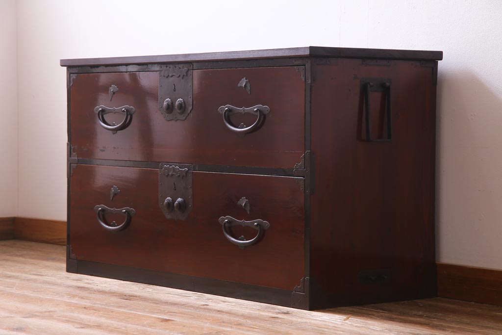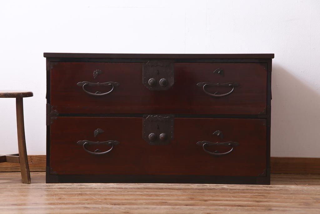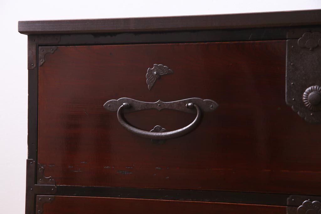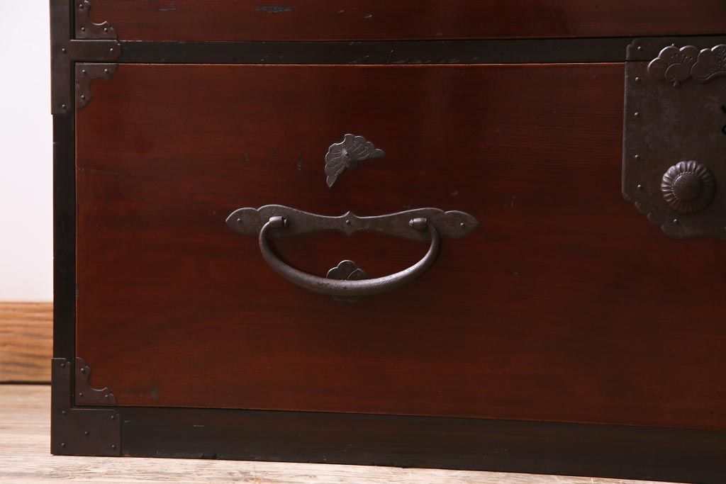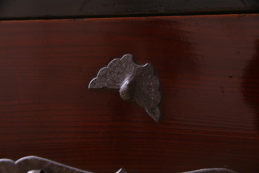 和箪笥> 衣装箪笥 > アンティーク家具 和製アンティーク 漆塗り 蝶の飾り金具が印象的な箪笥ローボード(衣装箪笥)