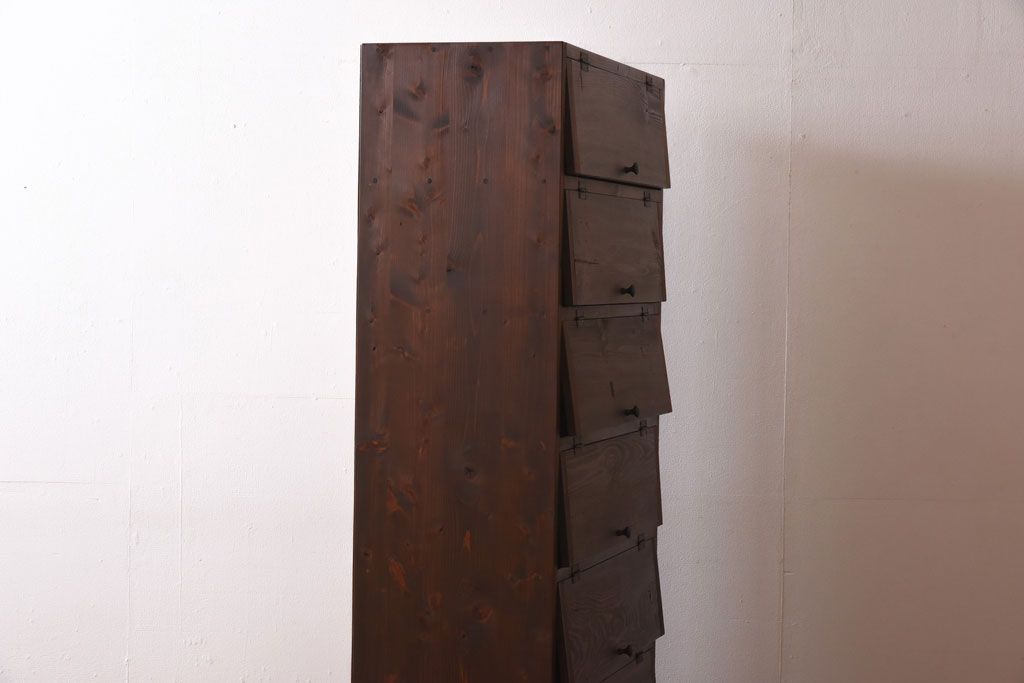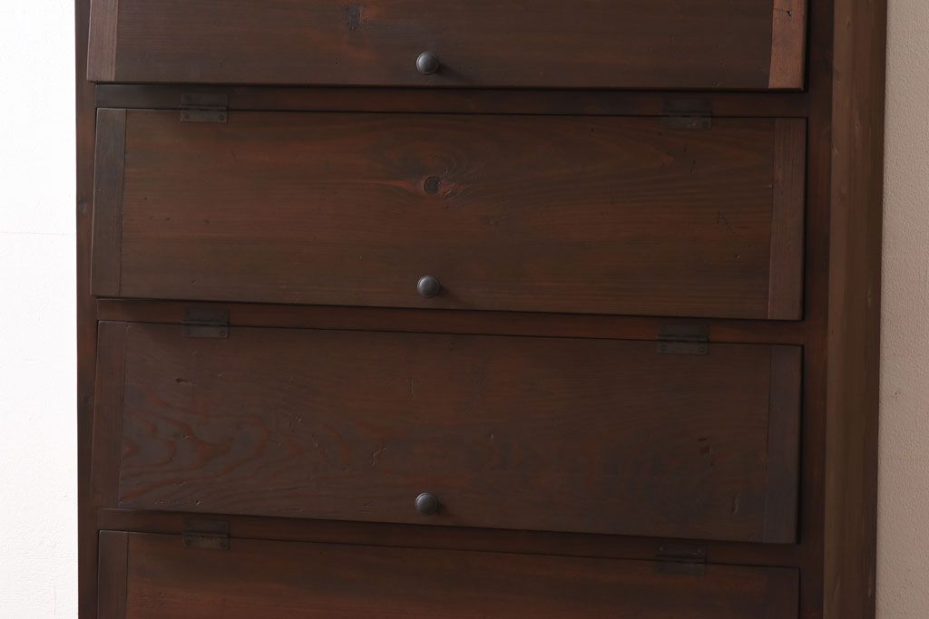リメイク家具 前面松材 古材の風合いが味わい深いパタパタ扉の鉄脚付きキャビネット(7段タイプ)(戸棚、下駄箱、収納棚)です。