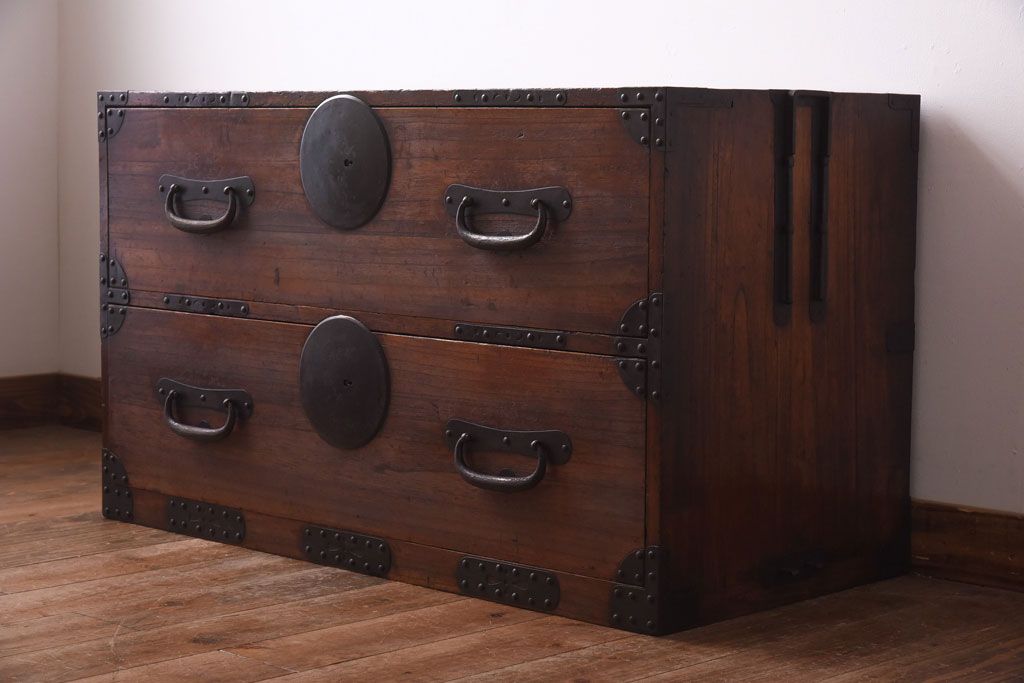 アンティーク家具 和製アンティーク 丸金具 鋲が目を惹く時代箪笥ローボード(テレビボード、ローチェスト)
