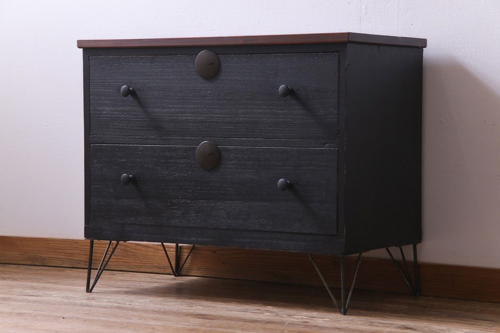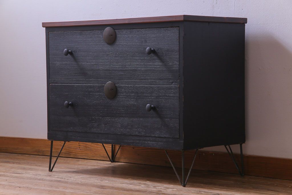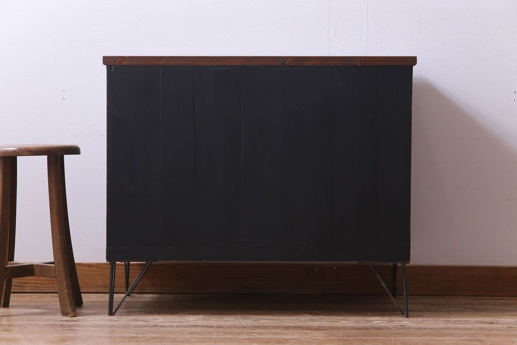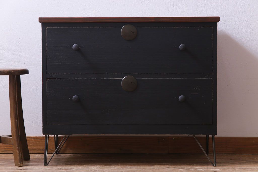 リメイク家具 大正期 ペイント 趣あふれる佇まいが魅力の鉄脚付き時代箪笥ローボード(チェスト、衣装箪笥、テレビボード)です。