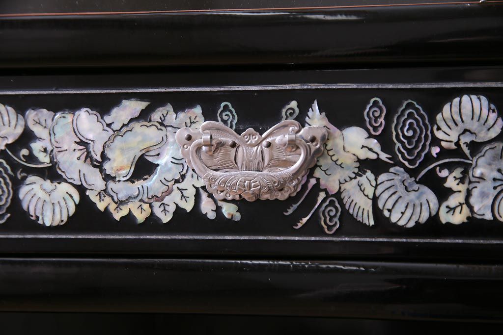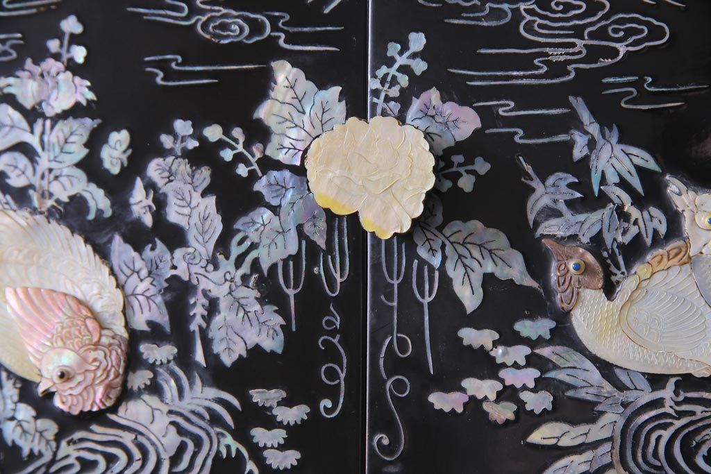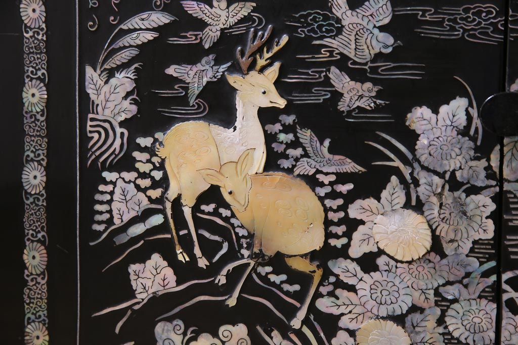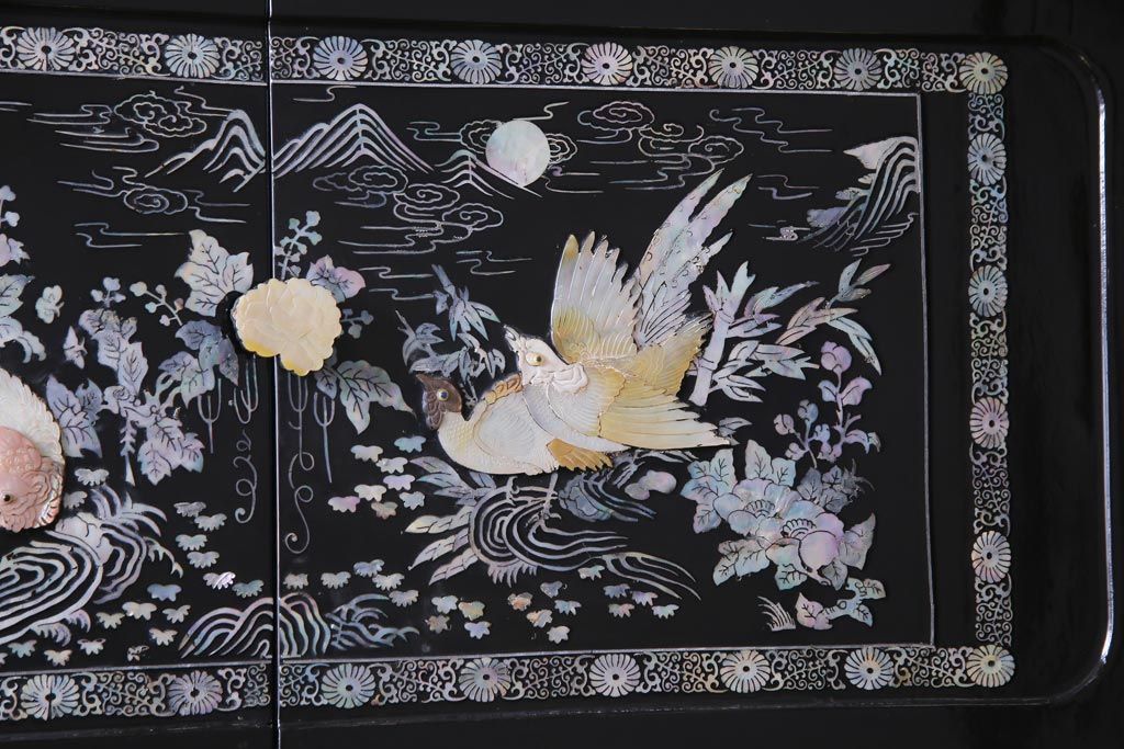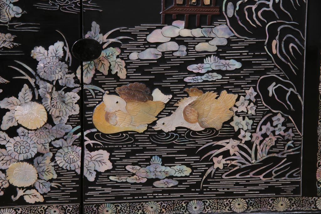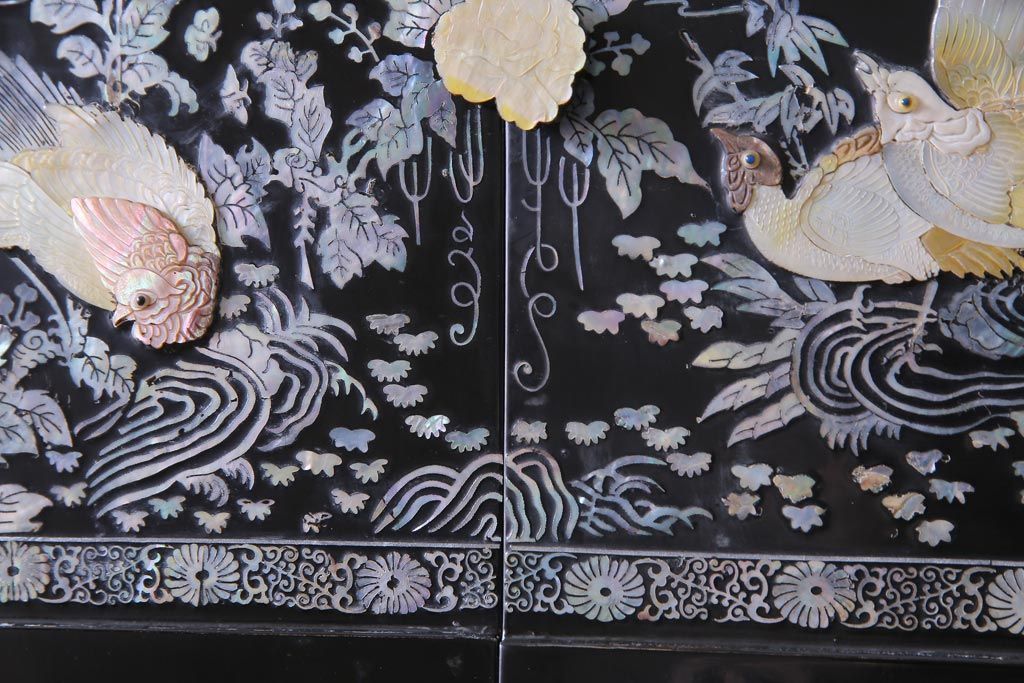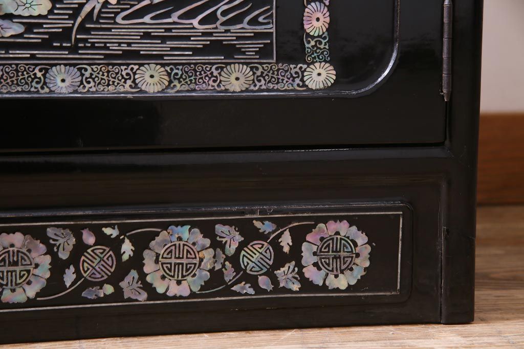 ラフジュ工房> 民芸家具 > 中古 韓国 螺鈿細工 高級品 華やかな意匠が存在感を放つ飾り棚(収納棚)(定価約80万円)