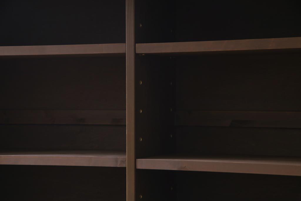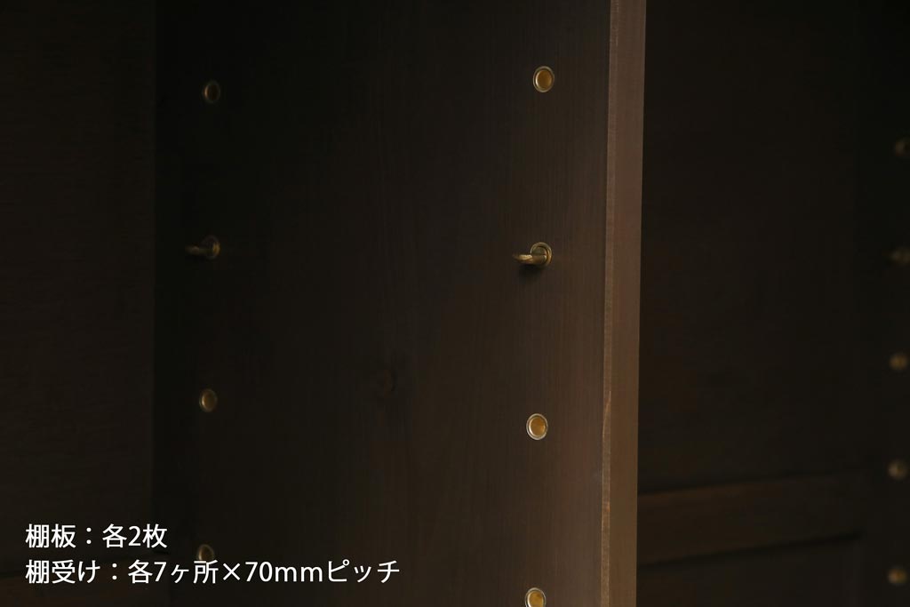 棚板は取り外しできます。棚板は各2枚あります。棚受けは各7ヶ所、70mmピッチで調整できます。棚幅サイズのものが1枚の作りです。