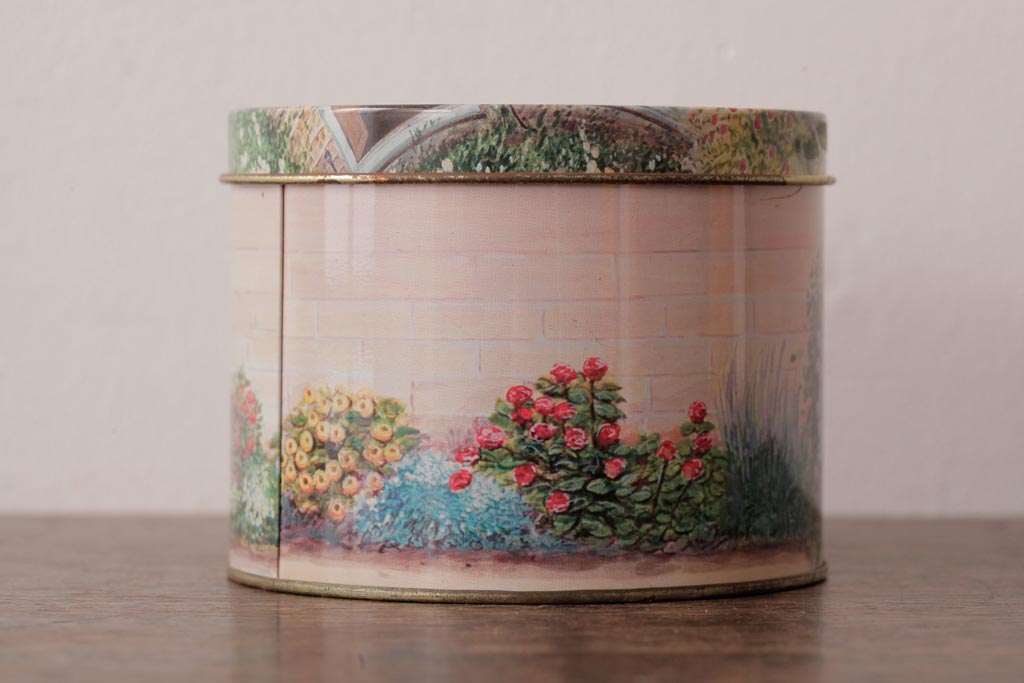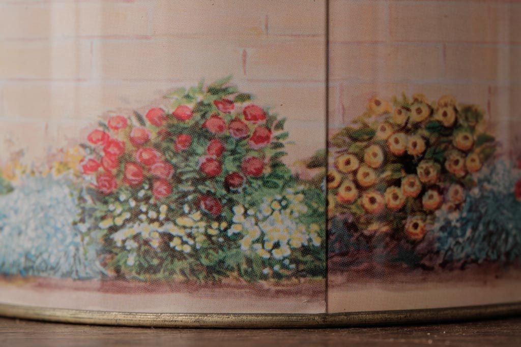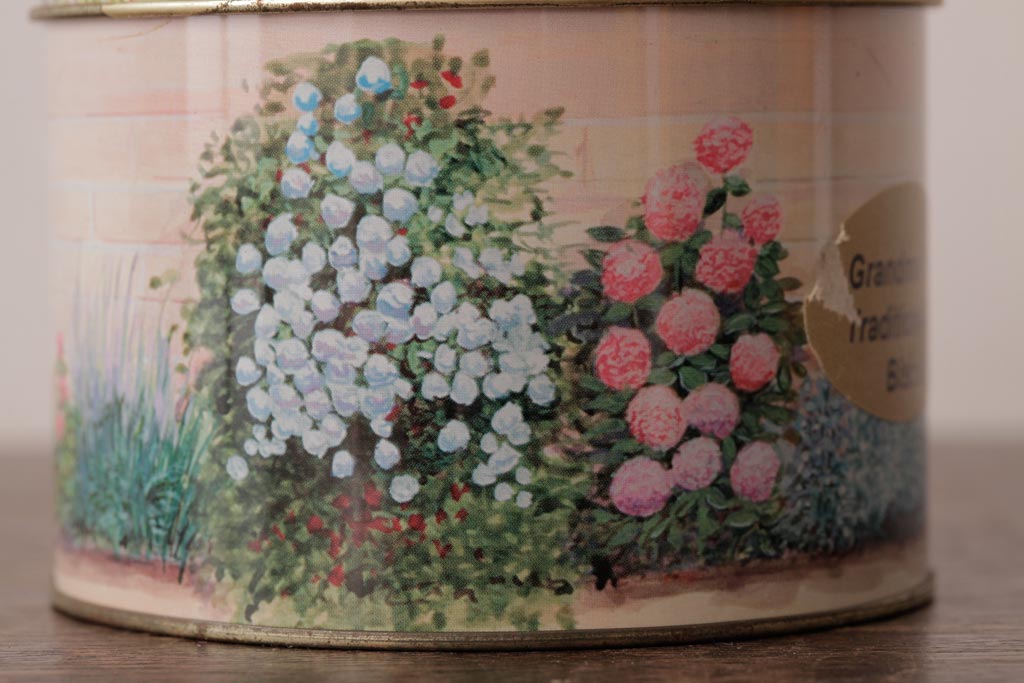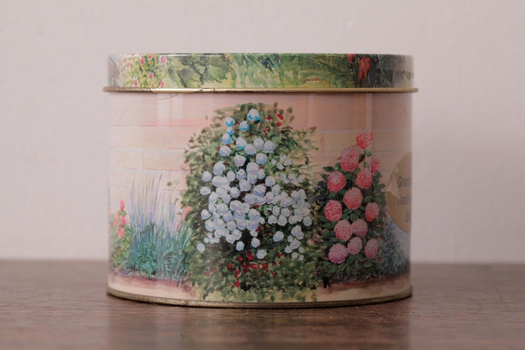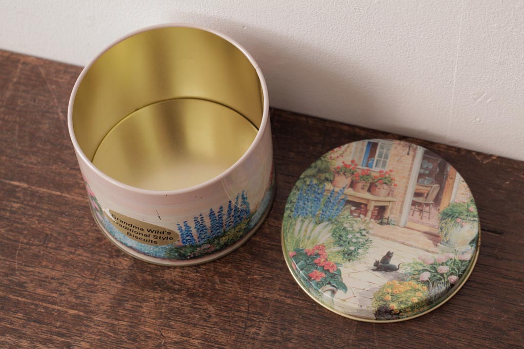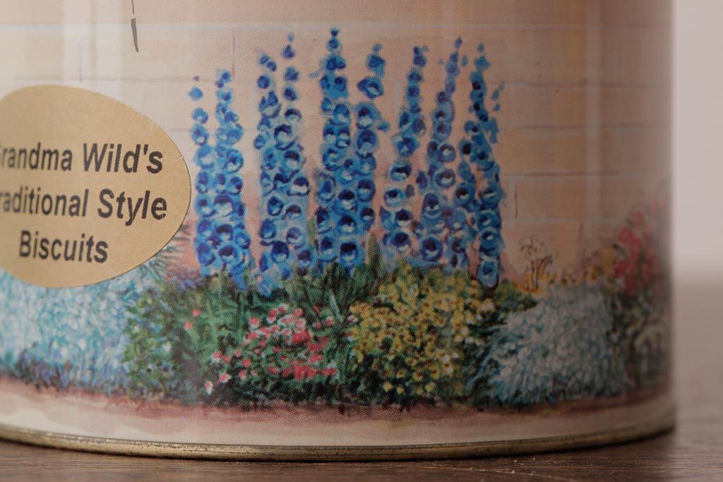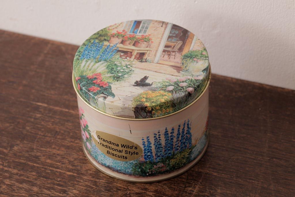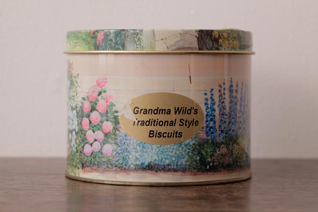 アンティーク雑貨 イギリスビンテージ Grandma Wild's(グランマ・ワイルド) 淡い色合いが愛らしいティン缶(ブリキ缶、ビスケット缶)