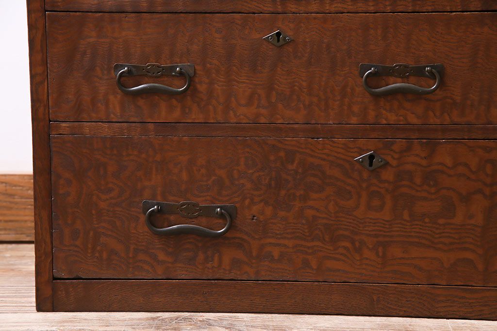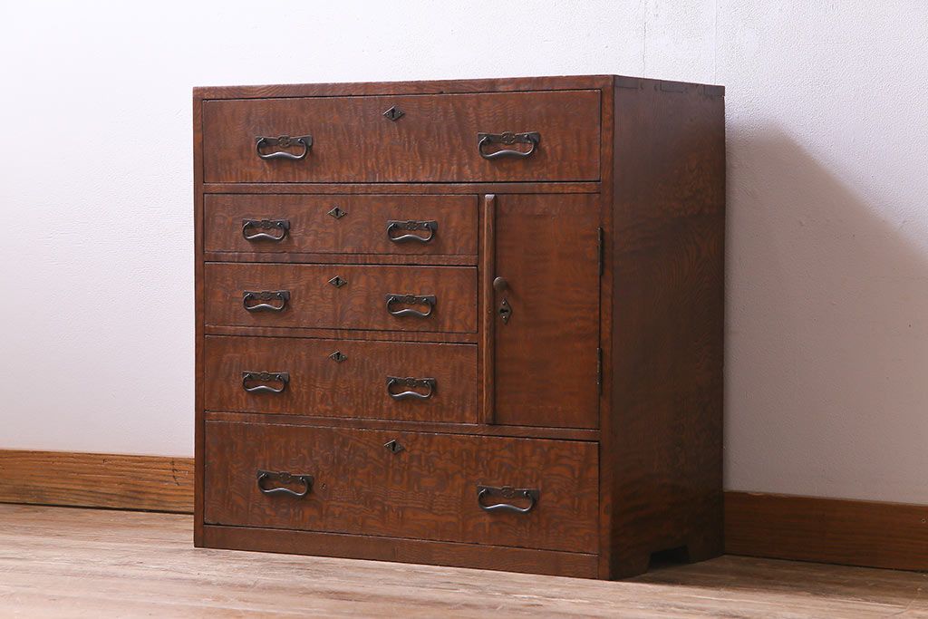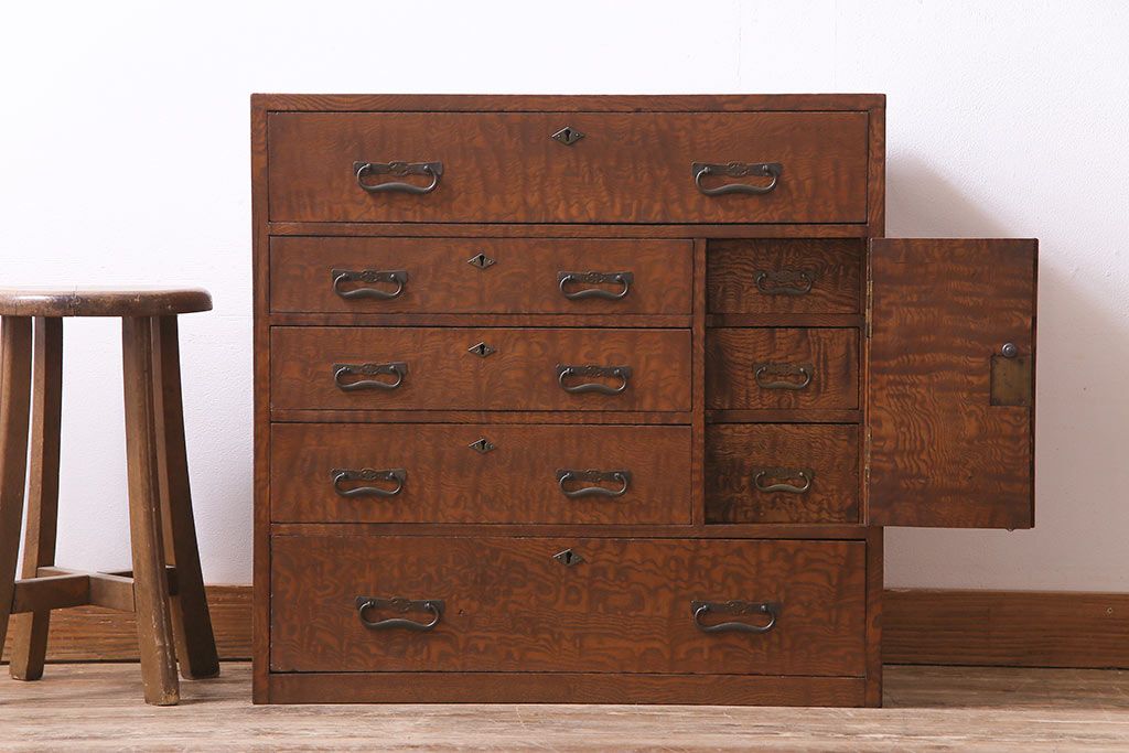 アンティーク家具 和製アンティーク 三方タモ玉杢材 真鍮金具 上質な作りの小箪笥(引き出し、和タンス)