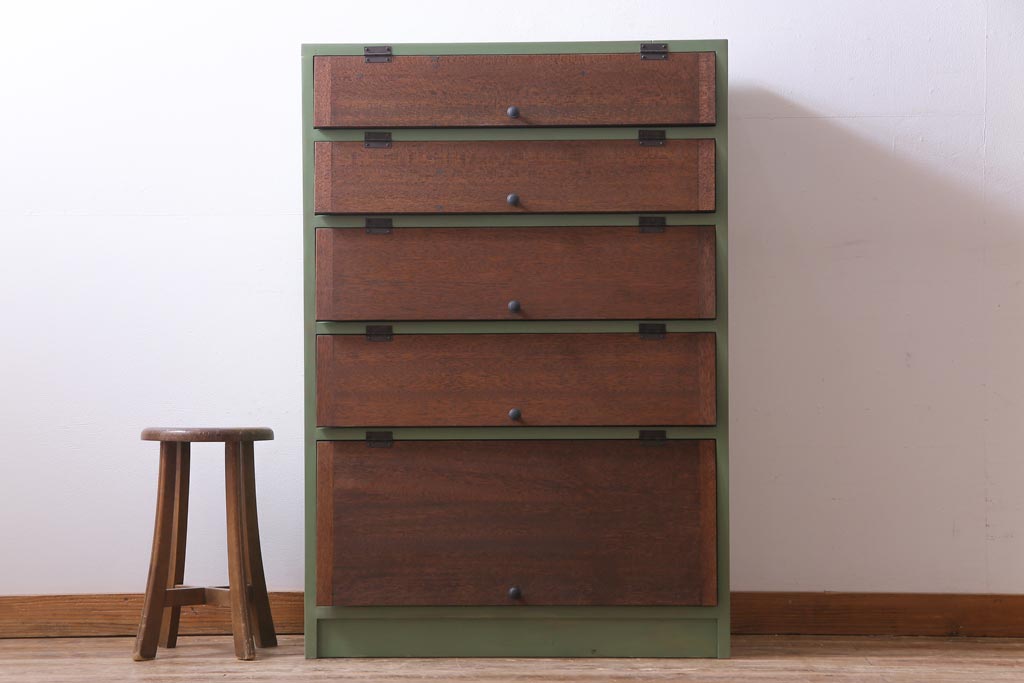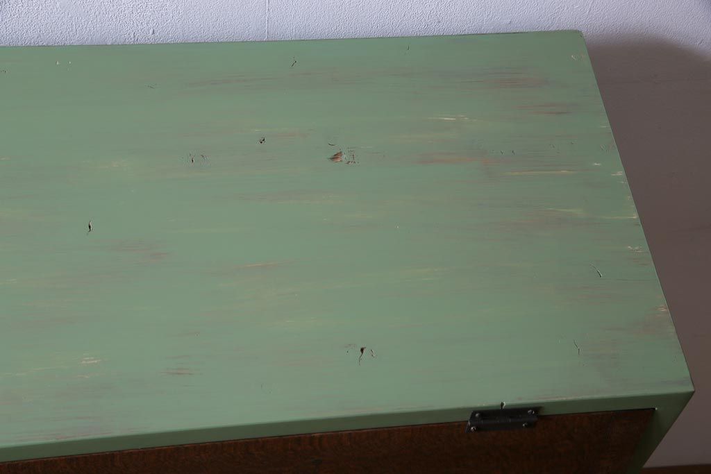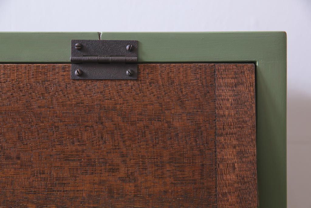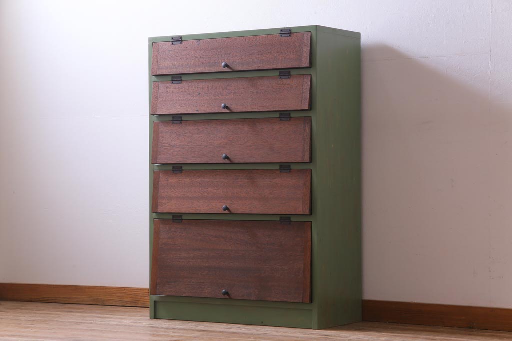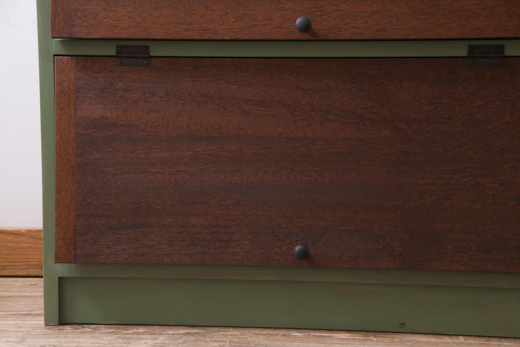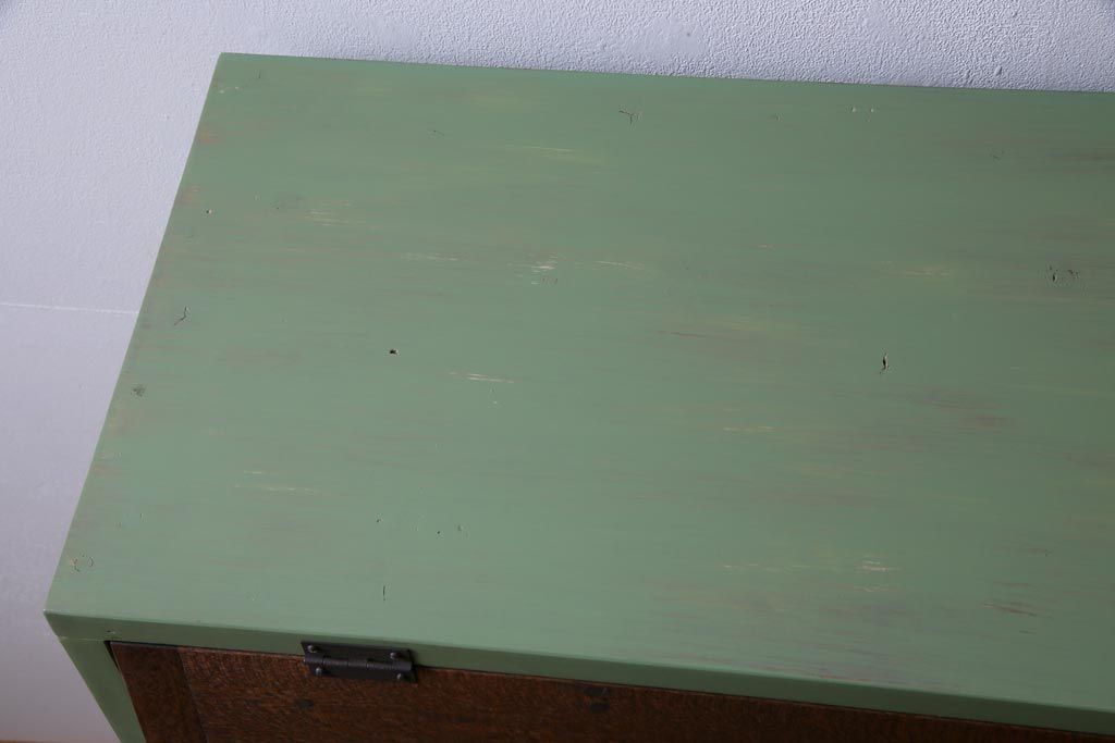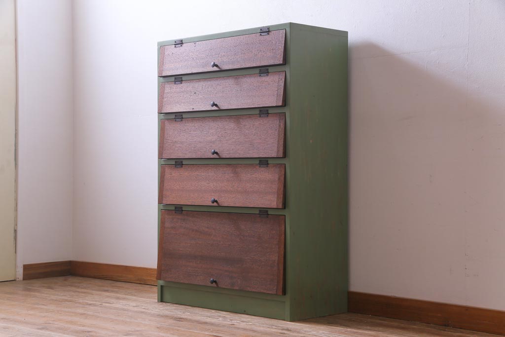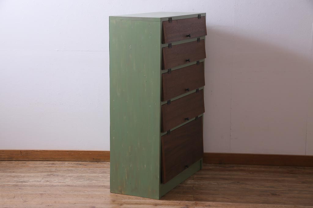 リメイク家具 グリーンのペイントと木材のコントラストがレトロな印象与えるパタパタ扉の収納棚(5段タイプ)(戸棚、下駄箱)