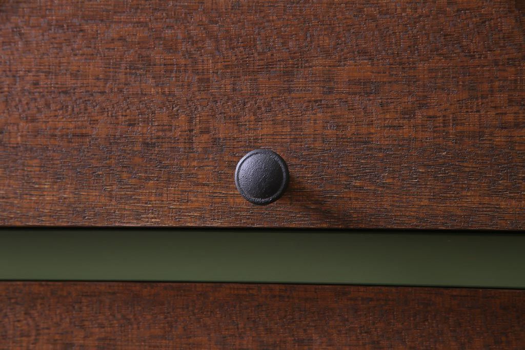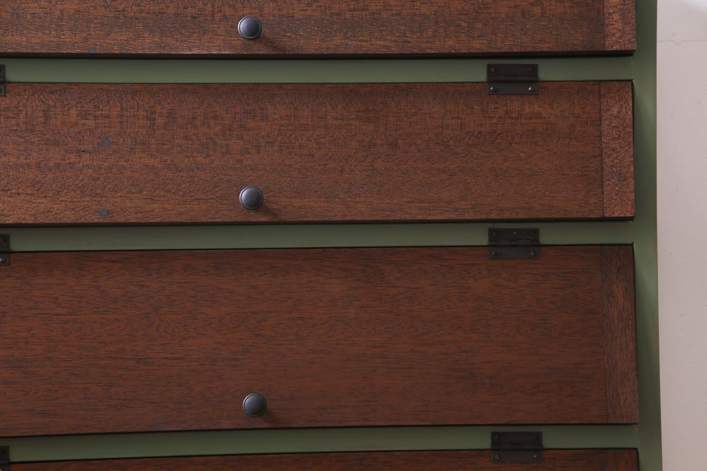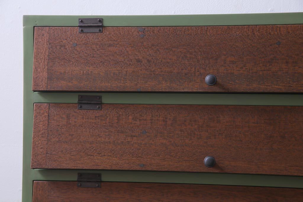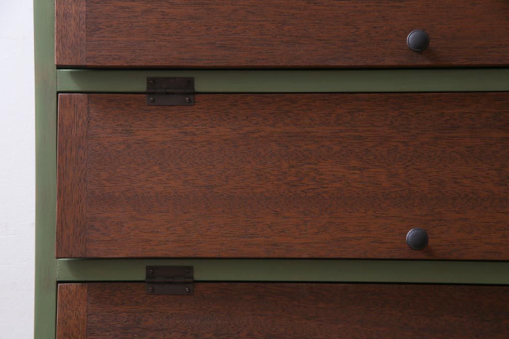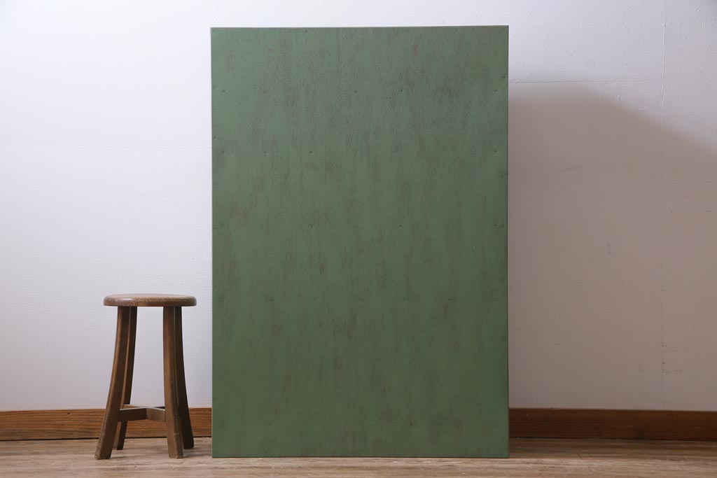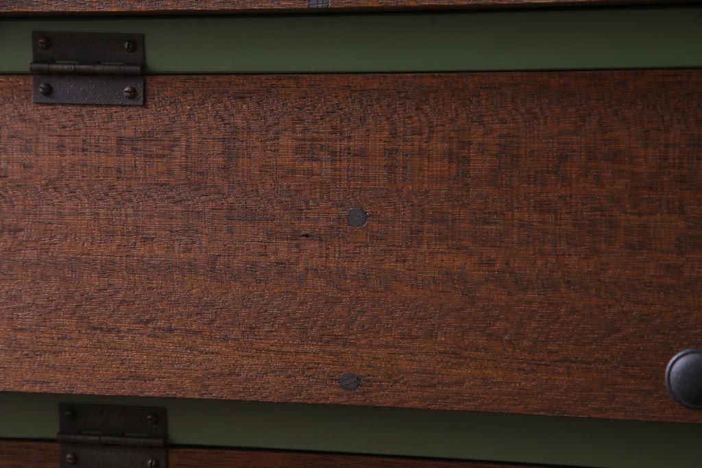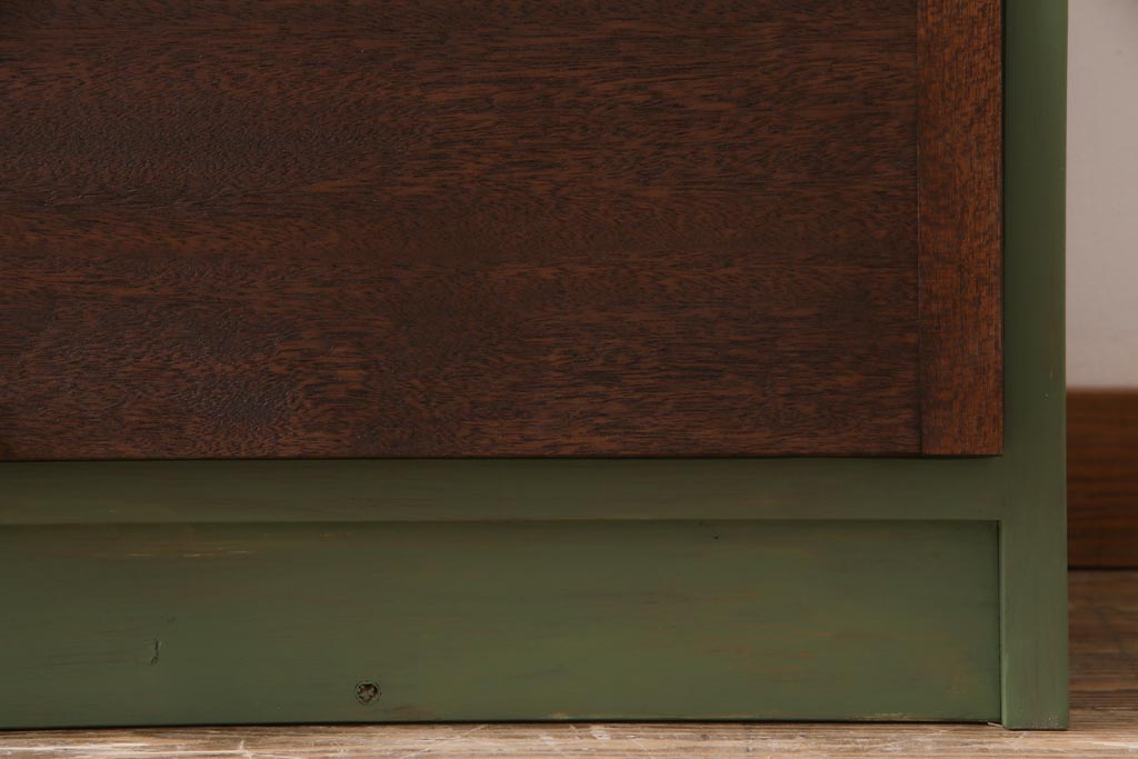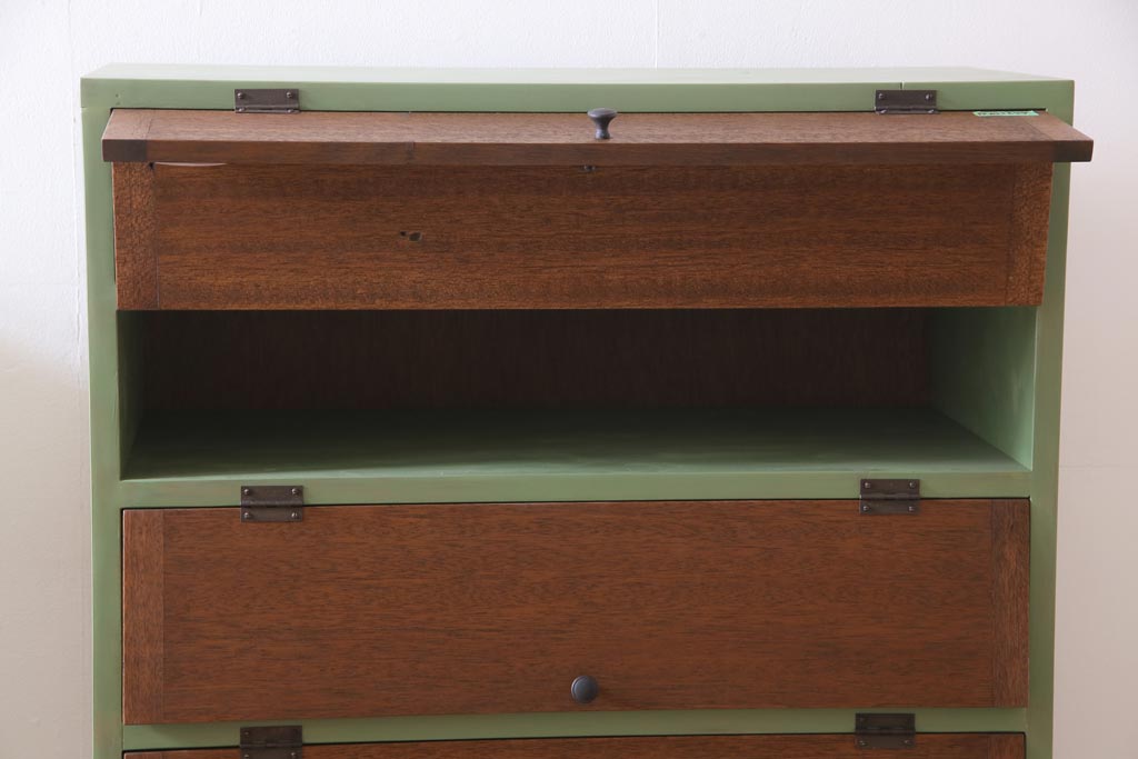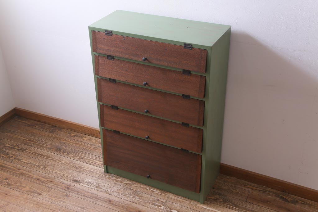 リメイク家具 グリーンのペイントと木材のコントラストがレトロな印象与えるパタパタ扉の収納棚(5段タイプ)(戸棚、下駄箱)
