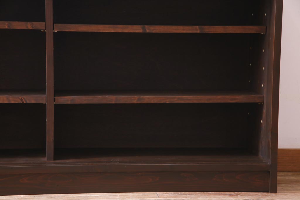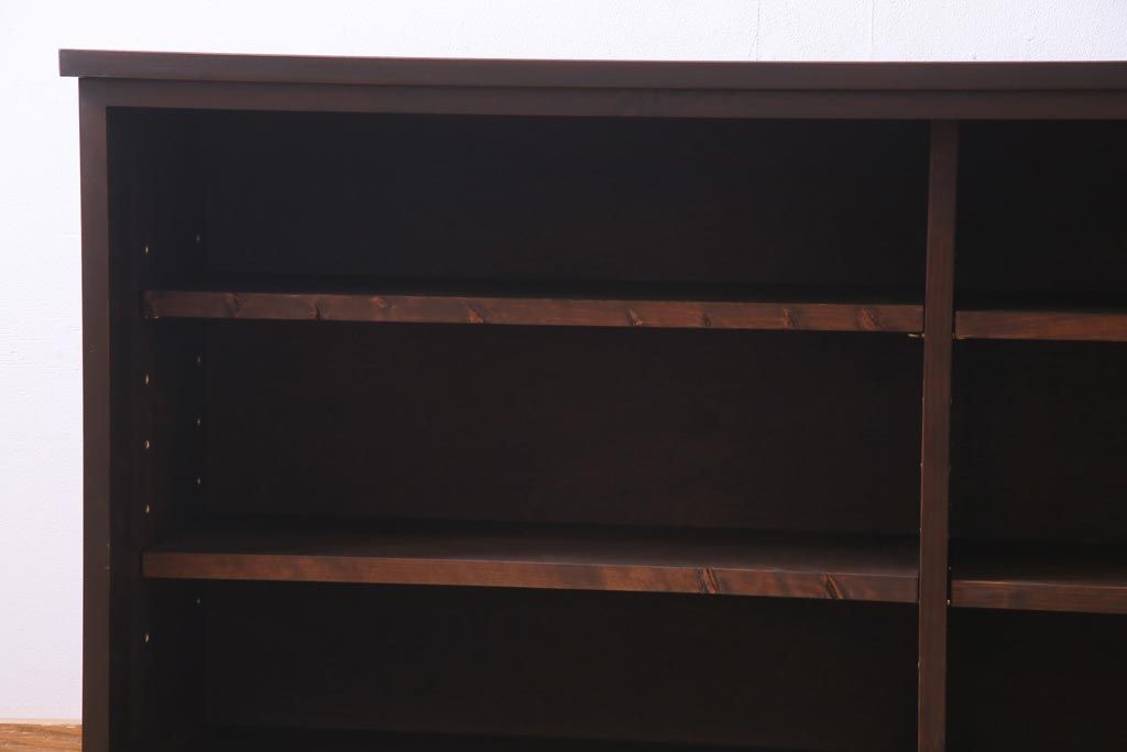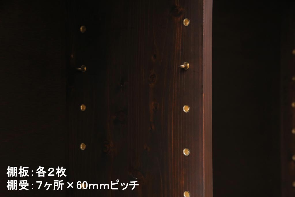 棚板は取り外しできます。棚板は各2枚あります。棚受けは7ヶ所、60mmピッチで調整できます。棚幅サイズのものが1枚の作りです。