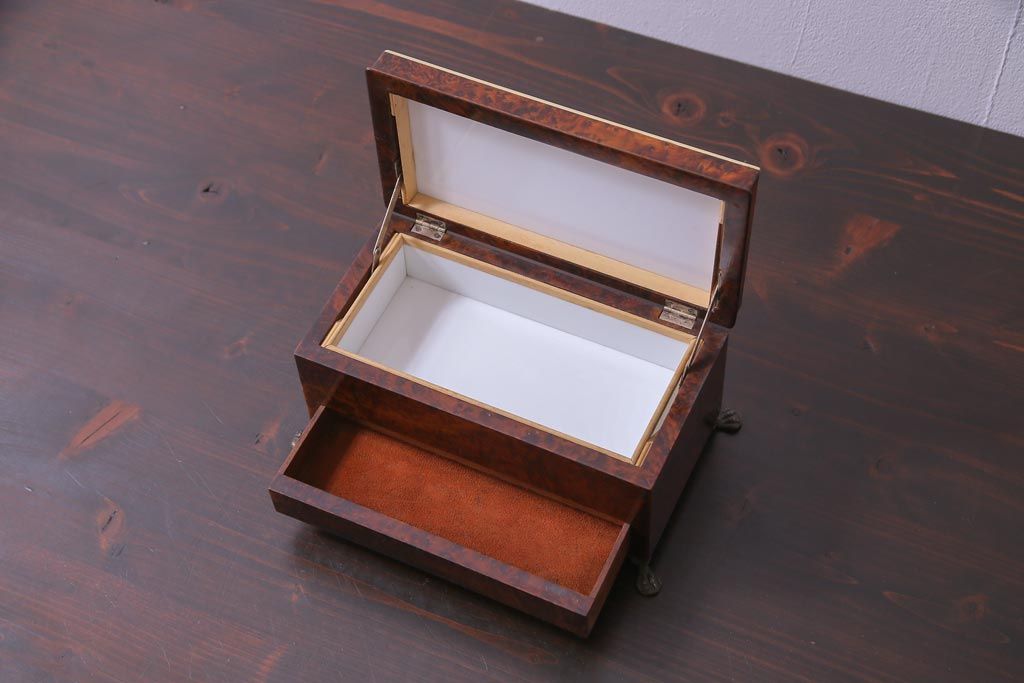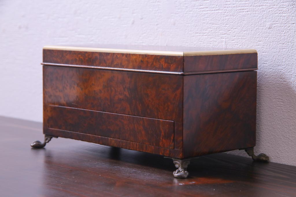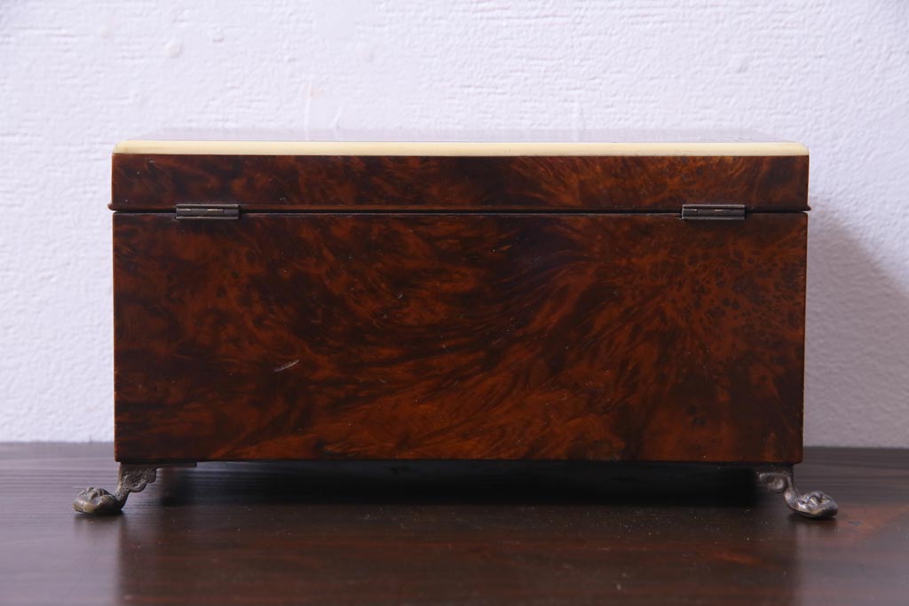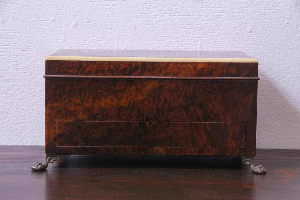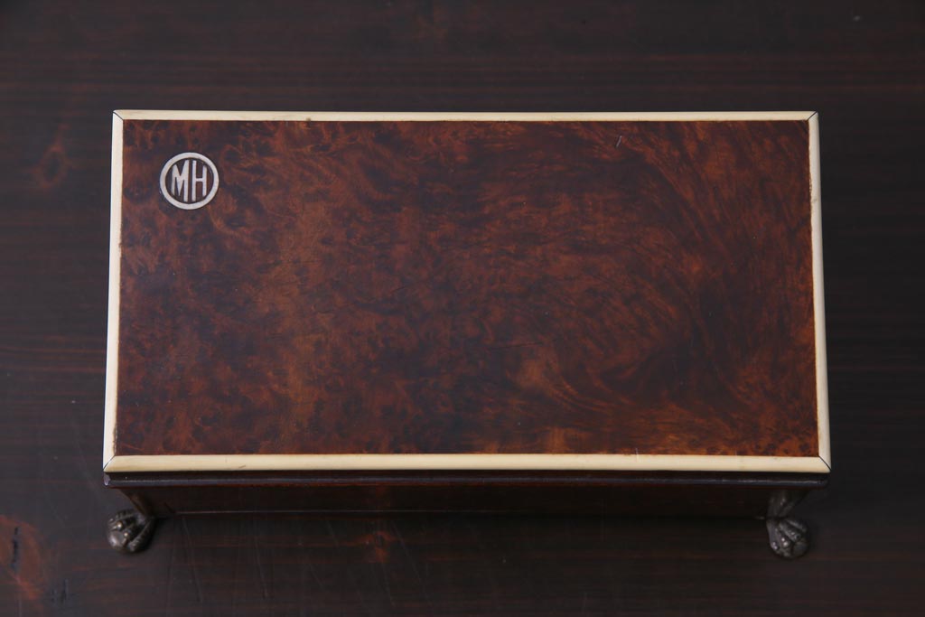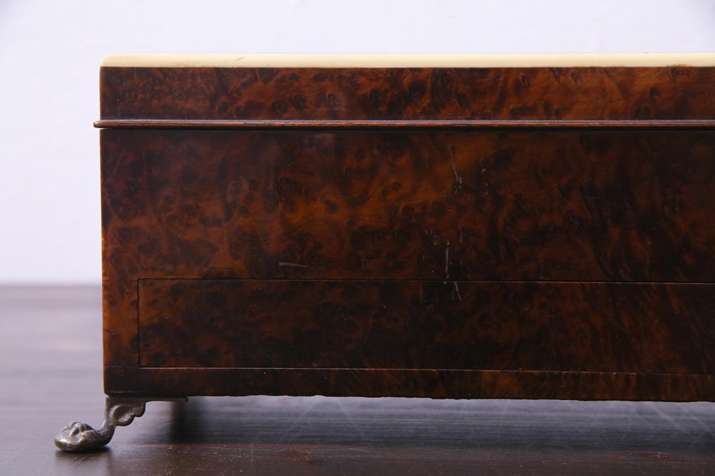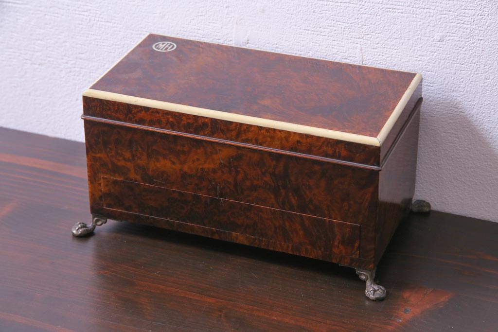 アンティーク雑貨 アメリカビンテージ 鳥眼杢 鹿角の意匠が目を引く脚付きシガーケース(ヒュミドール、葉巻入れ)