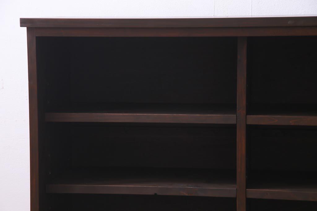 棚板は取り外しできます。棚板は各2枚あります。棚受けは9ヶ所、50mmピッチで調整できます。棚幅サイズのものが1枚の作りです。
