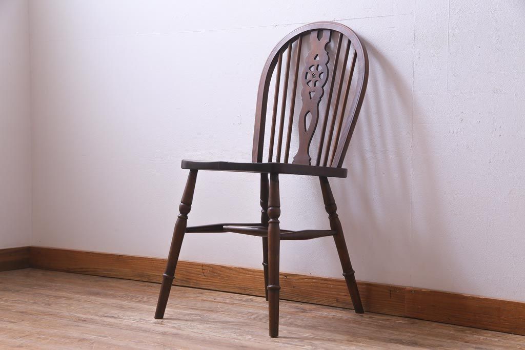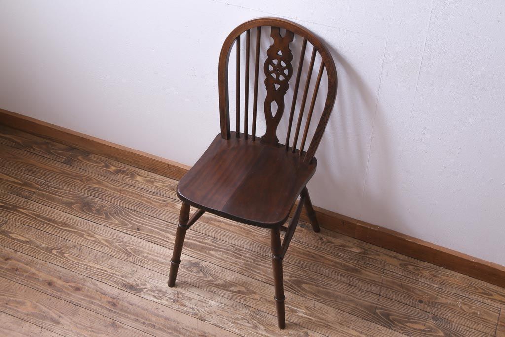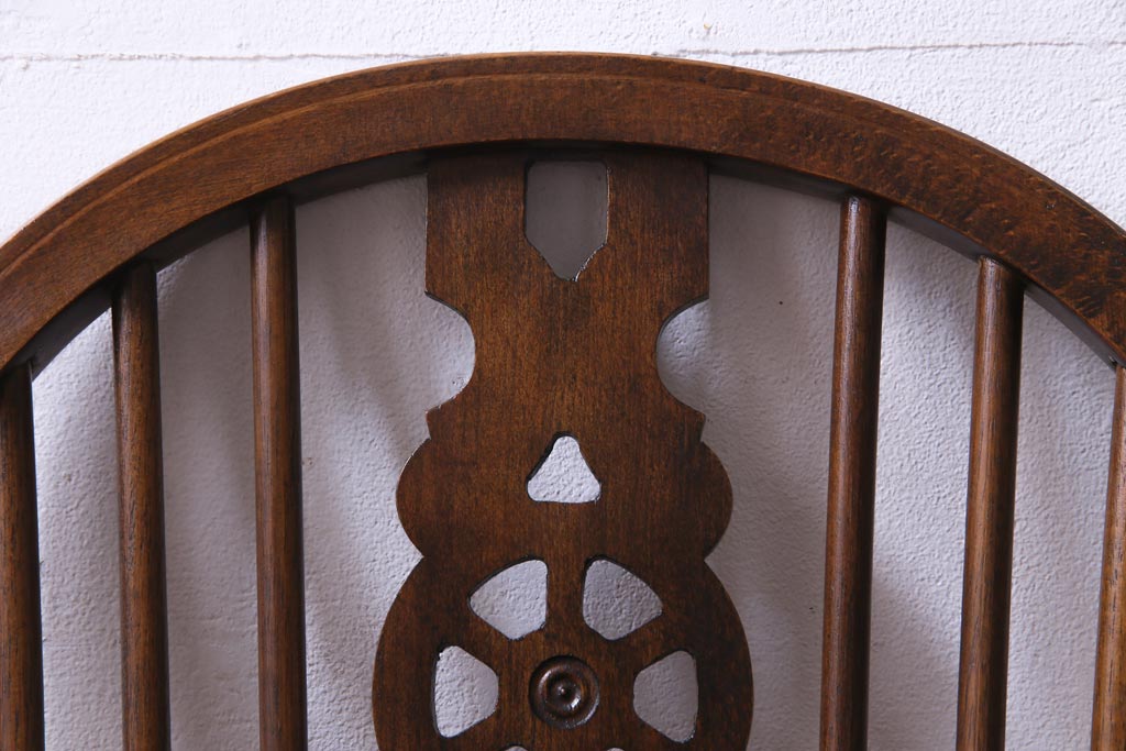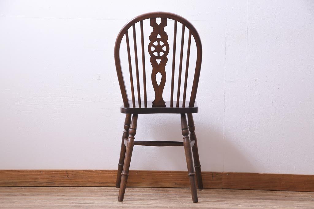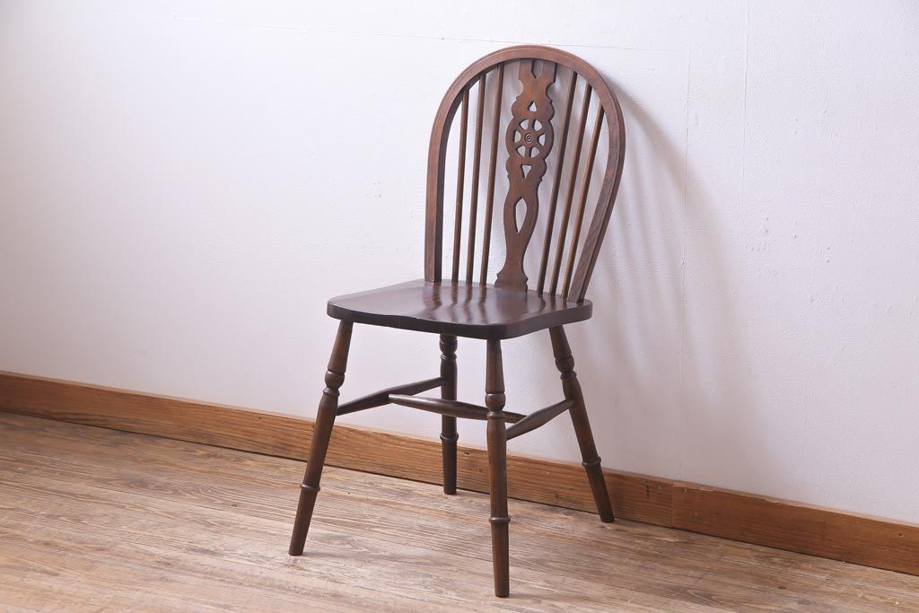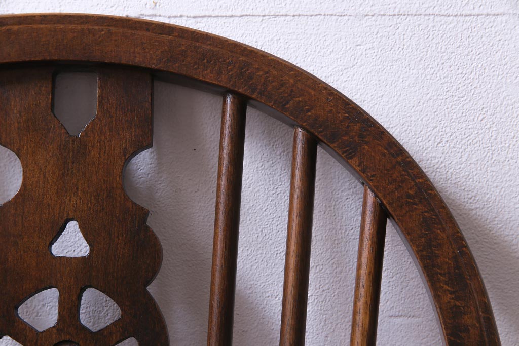 ヴィンテージ家具 イギリスビンテージ 背もたれの透かし彫りがお洒落なホイールバックチェア(板座チェア、ダイニングチェア)(1)