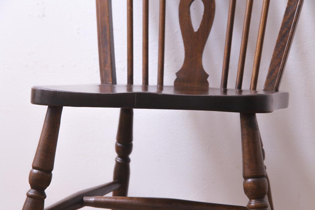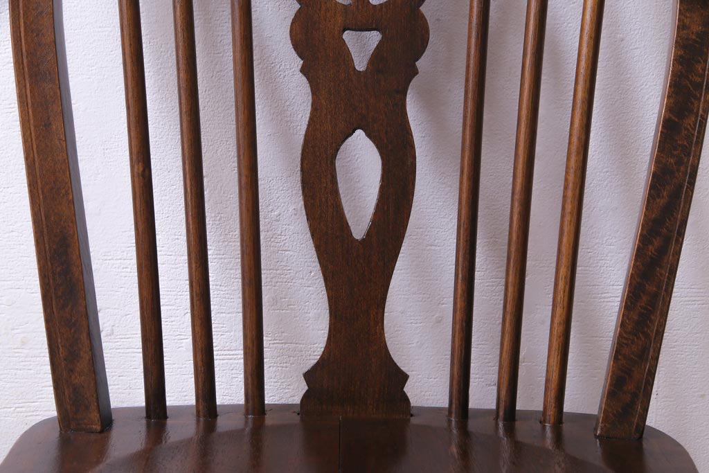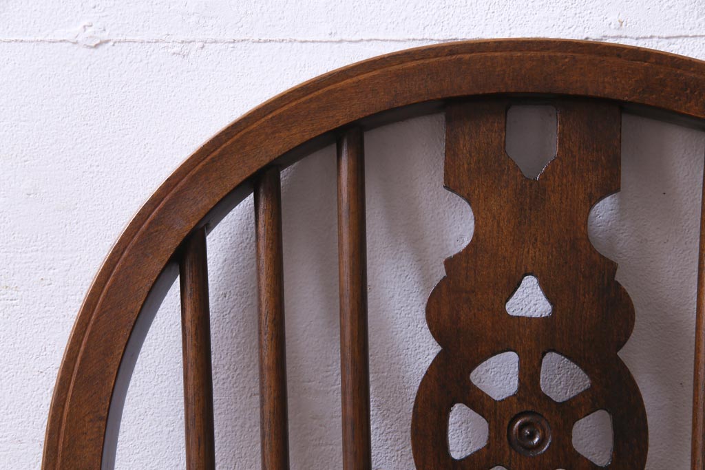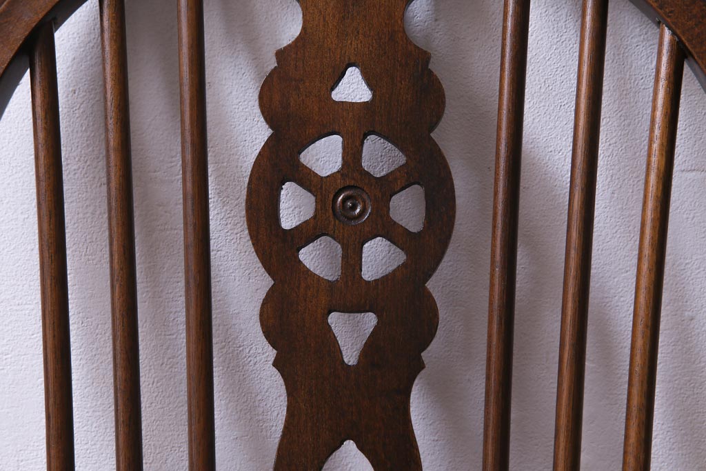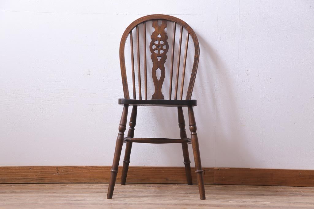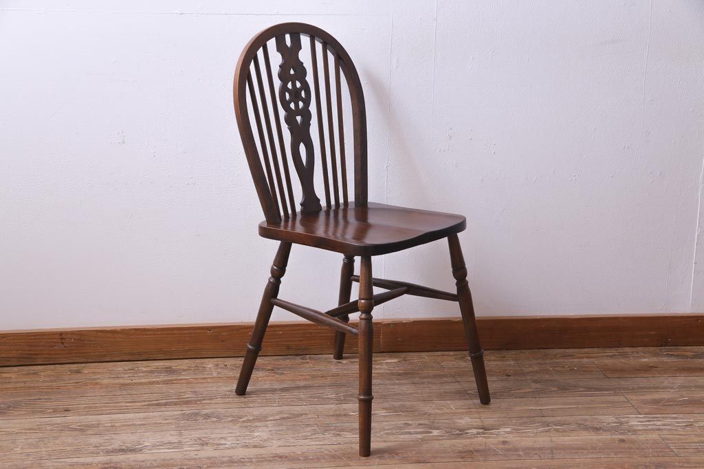ヴィンテージ家具 イギリスビンテージ 背もたれの透かし彫りがお洒落なホイールバックチェア(板座チェア、ダイニングチェア)(1)