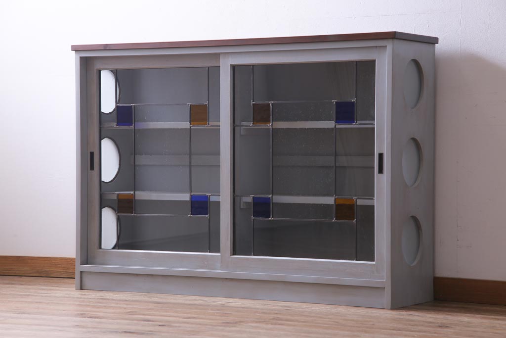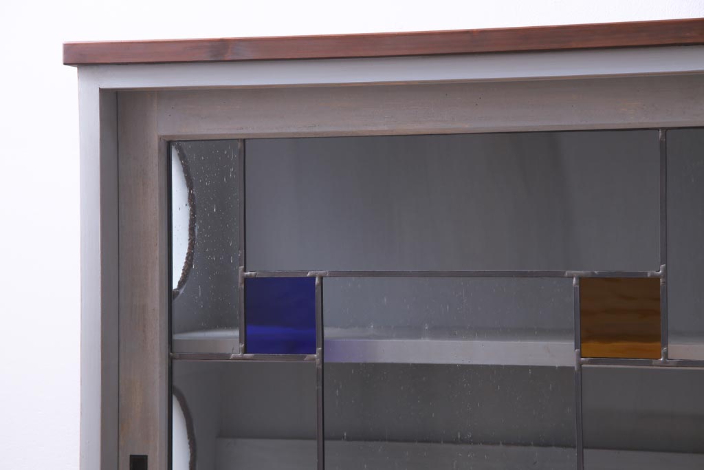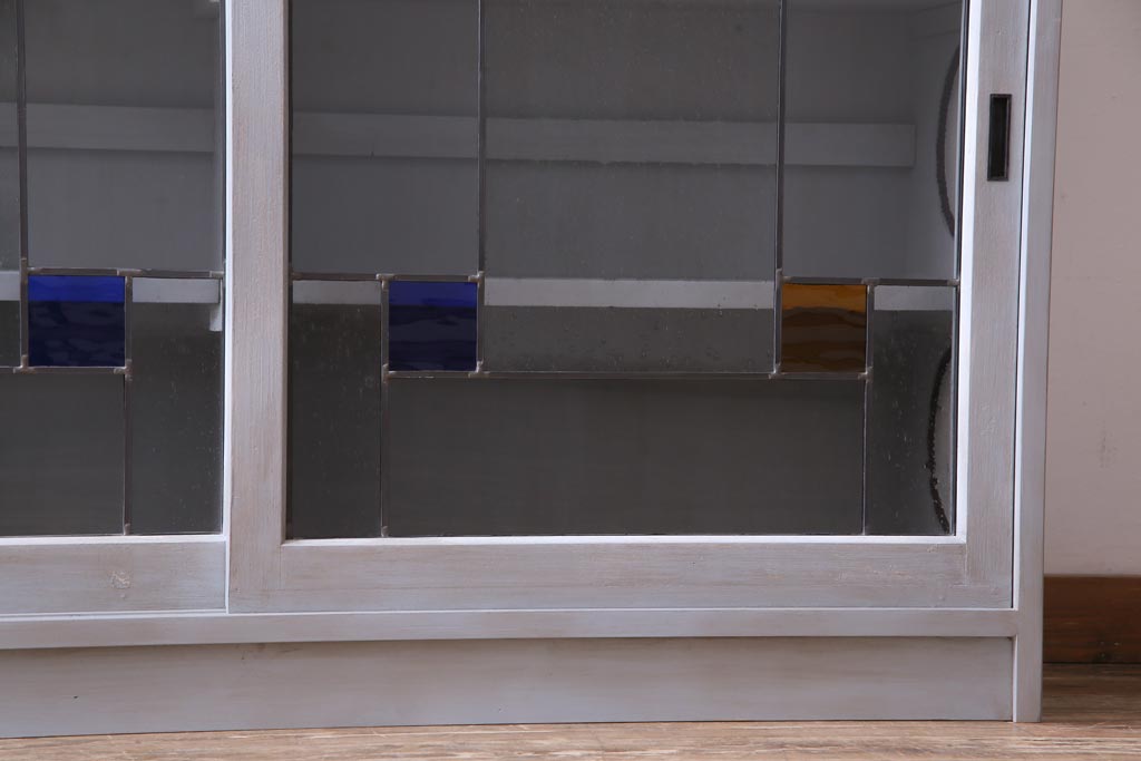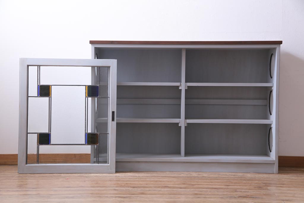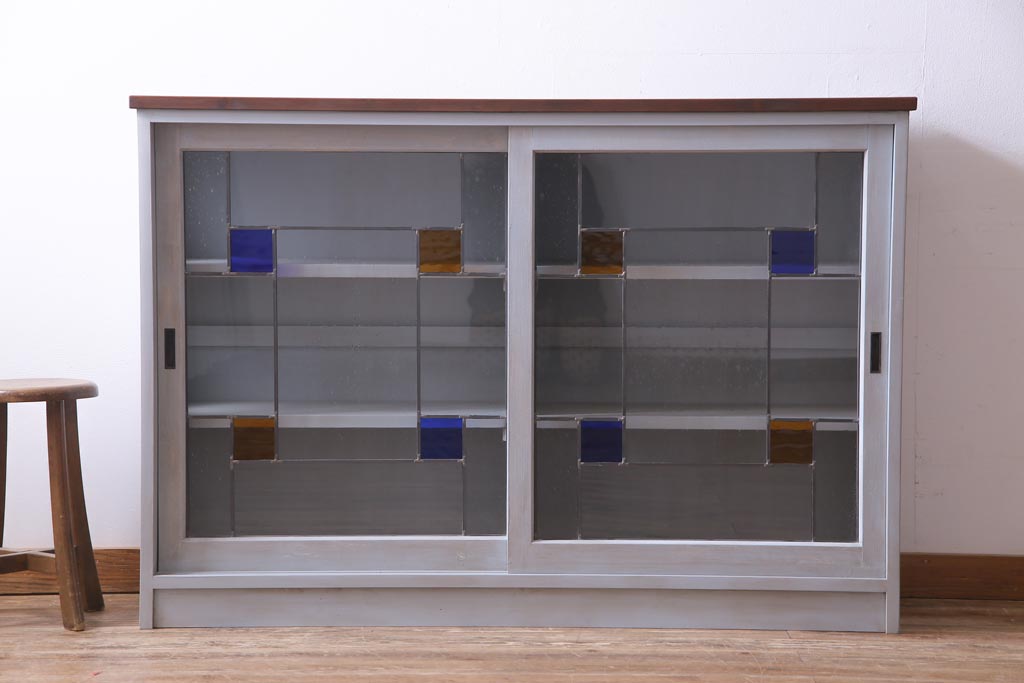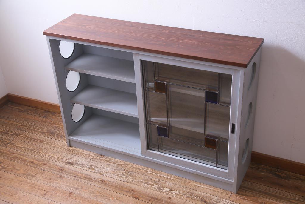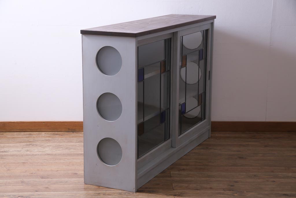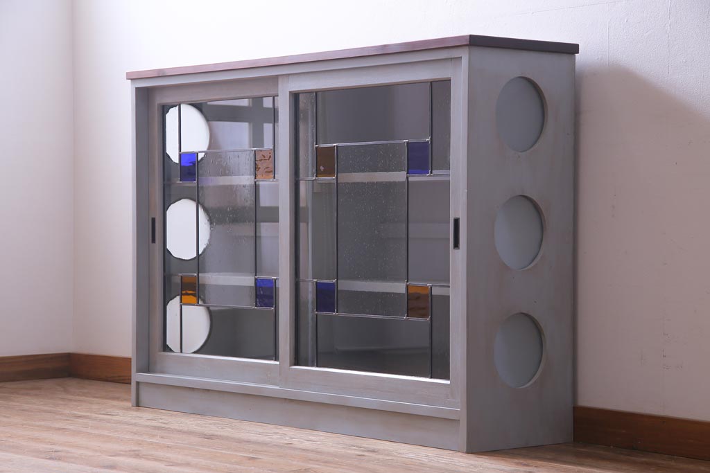 ラフジュ工房オリジナル 古建具リメイク おしゃれなステンドグラス入り戸棚(収納棚、サイドボード)