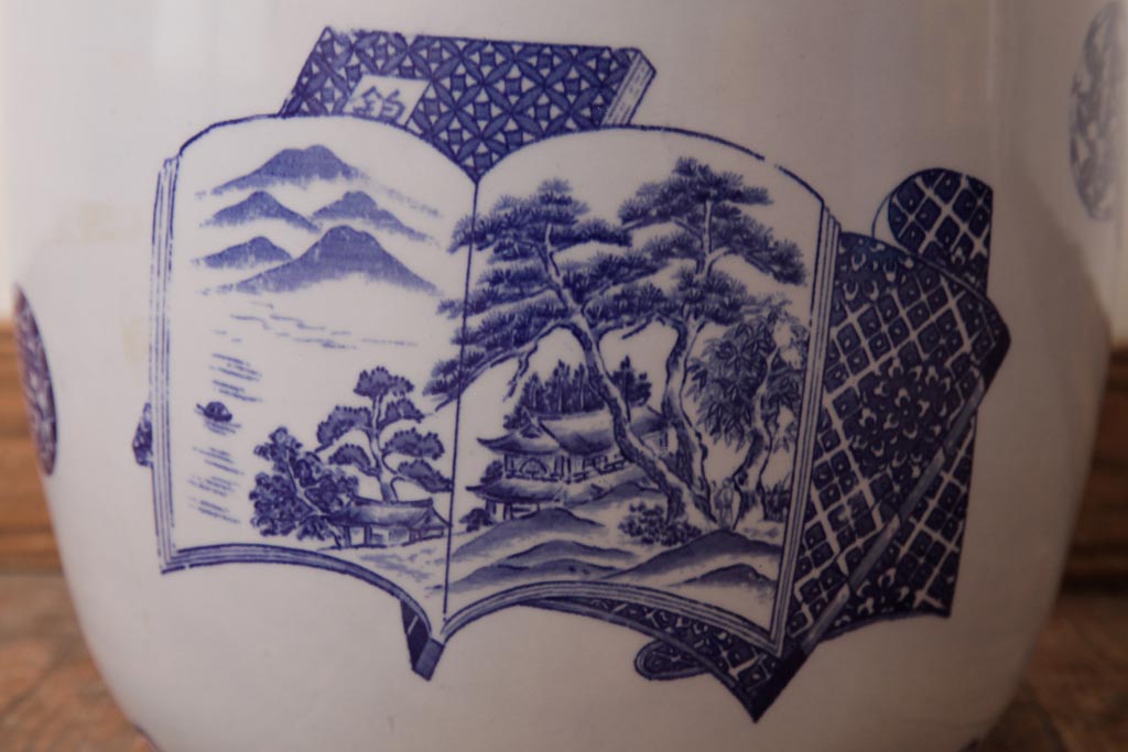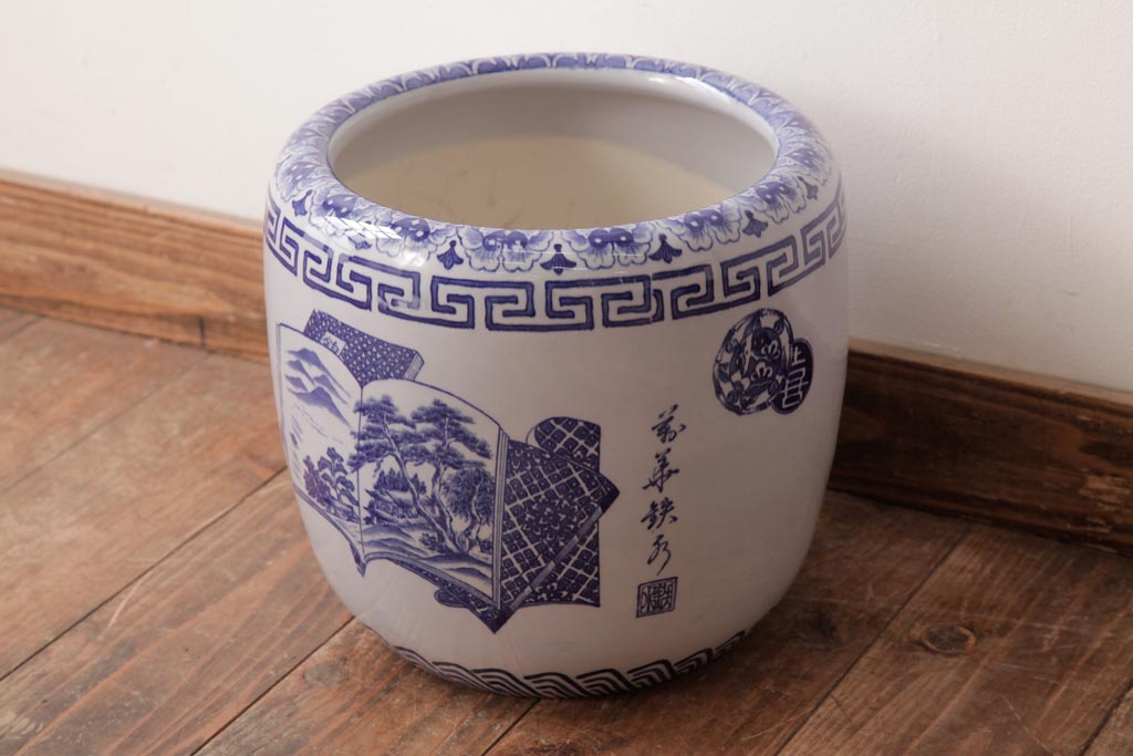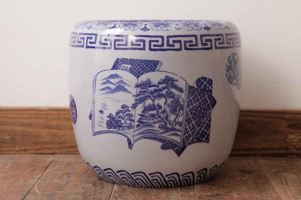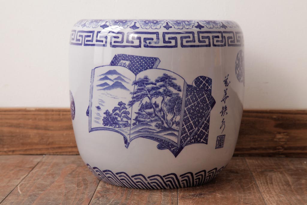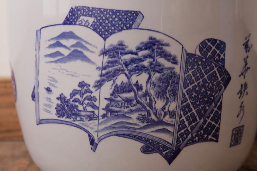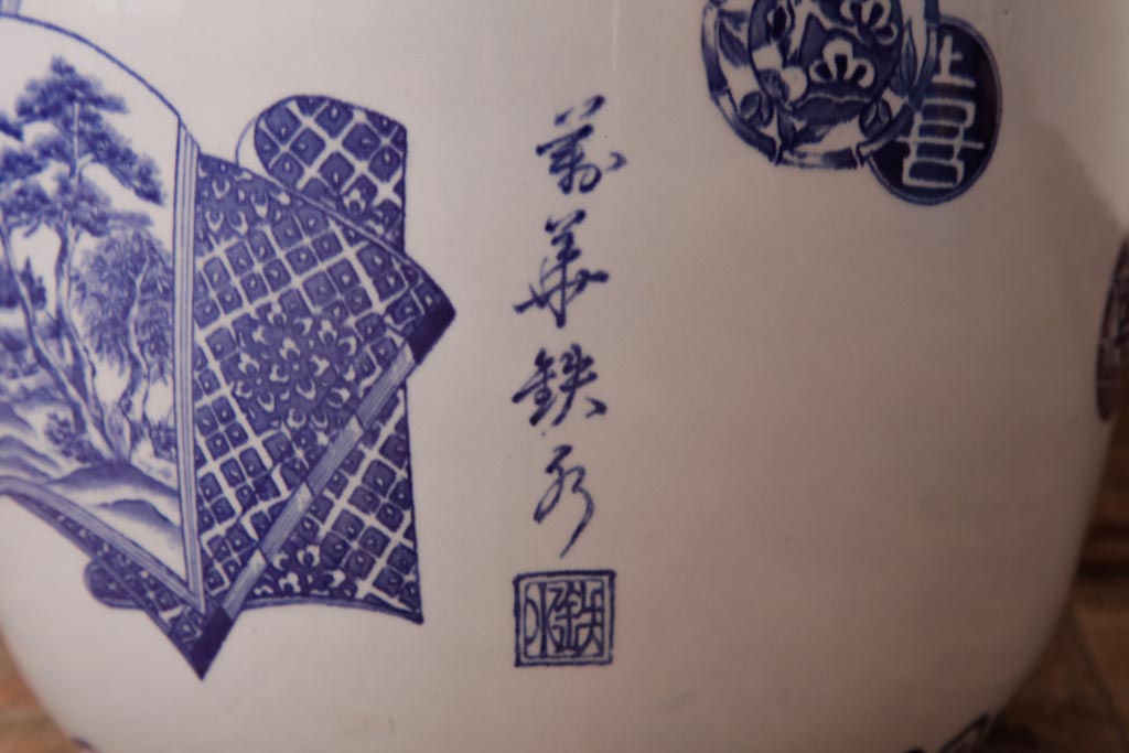 火鉢> 瀬戸火鉢 > アンティーク雑貨 古民具・骨董 銘入り 窓絵に描かれた山水図が風情溢れる瀬戸火鉢(鉢カバー、手あぶり)