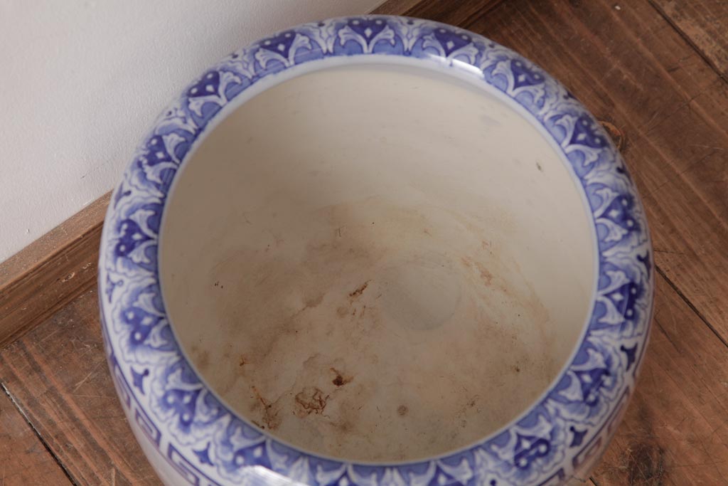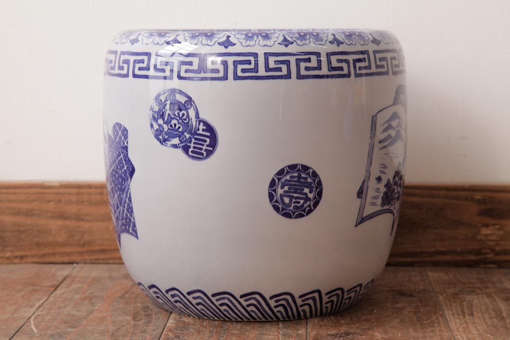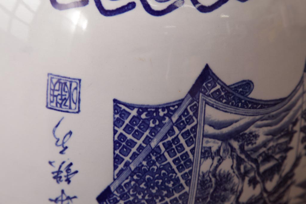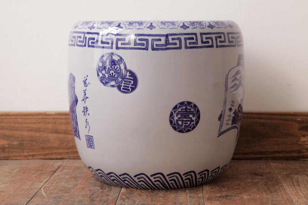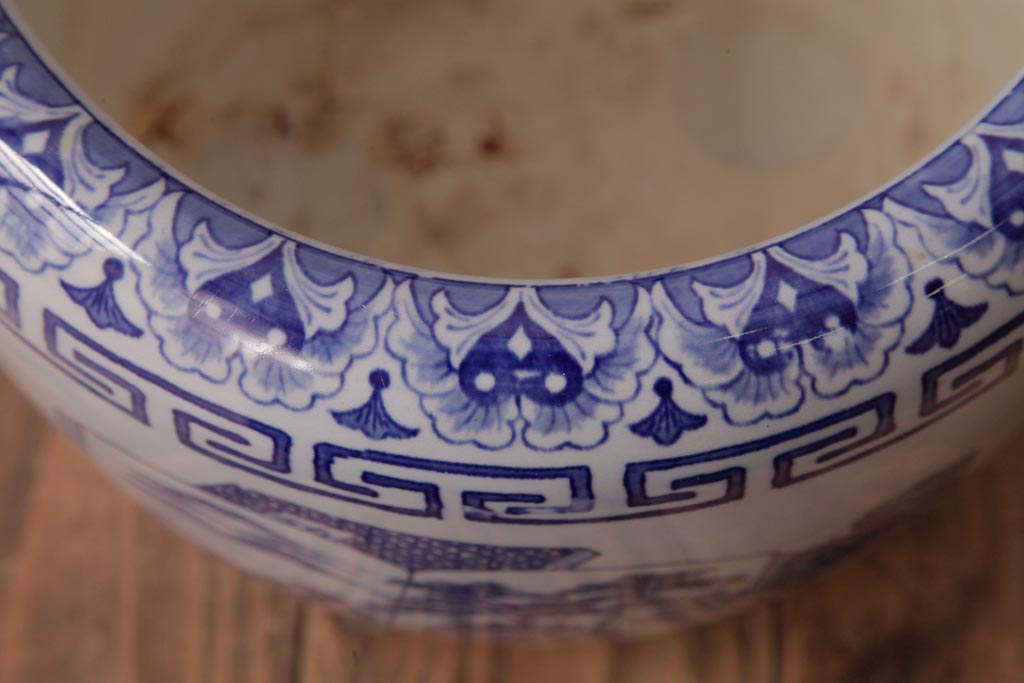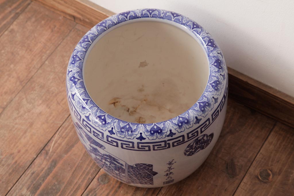 火鉢> 瀬戸火鉢 > アンティーク雑貨 古民具・骨董 銘入り 窓絵に描かれた山水図が風情溢れる瀬戸火鉢(鉢カバー、手あぶり)
