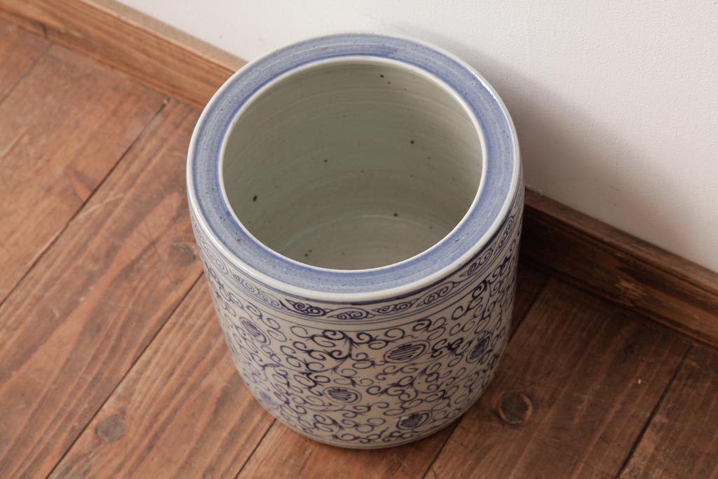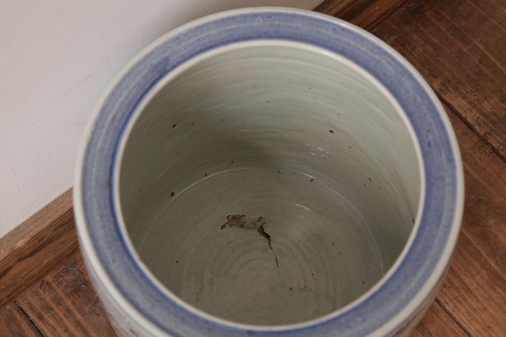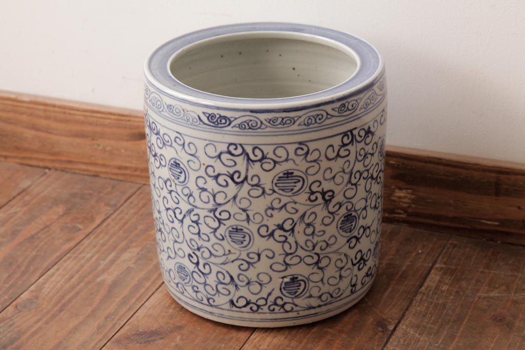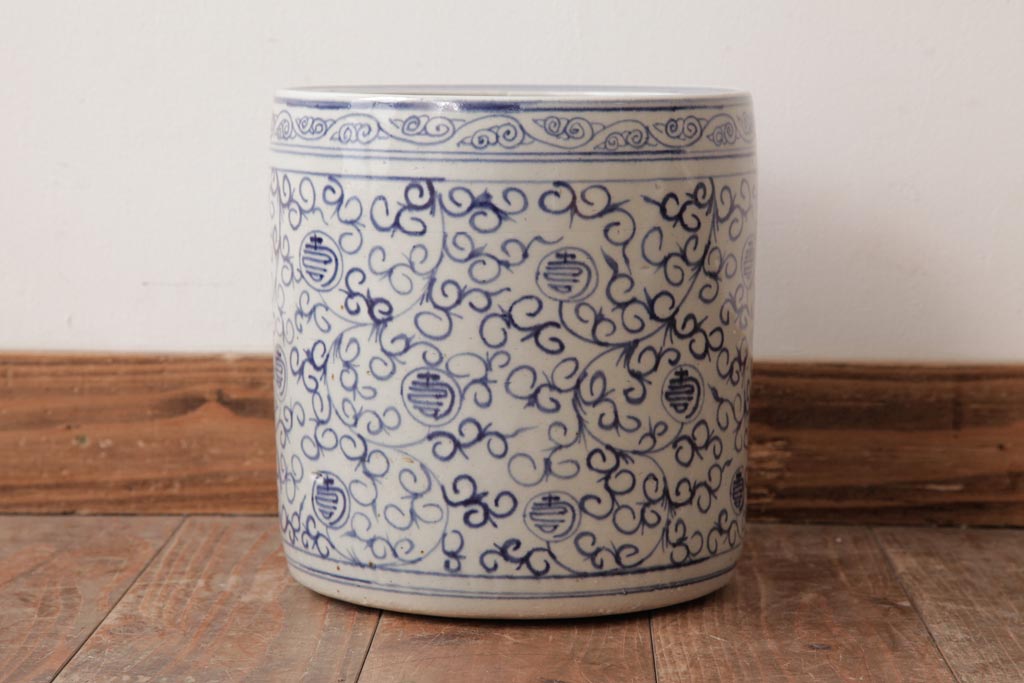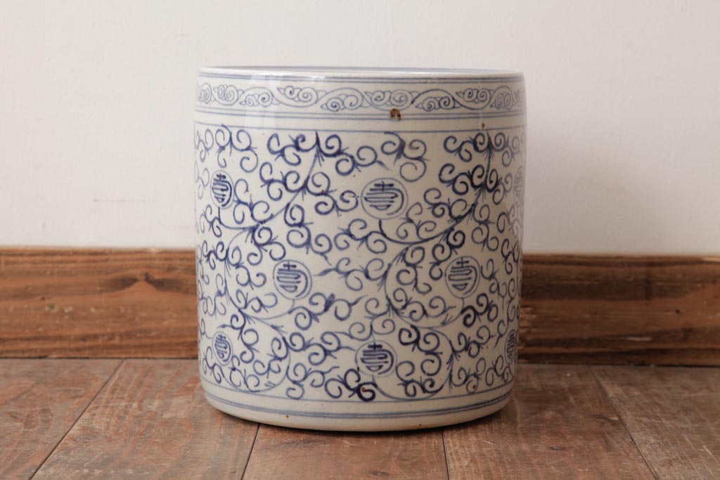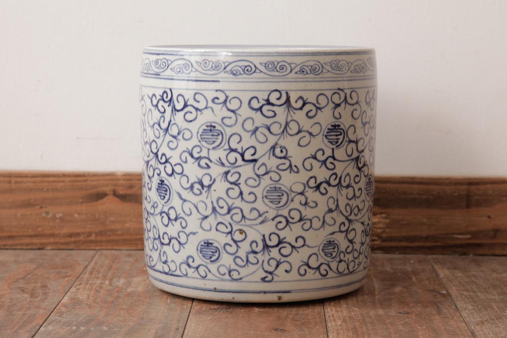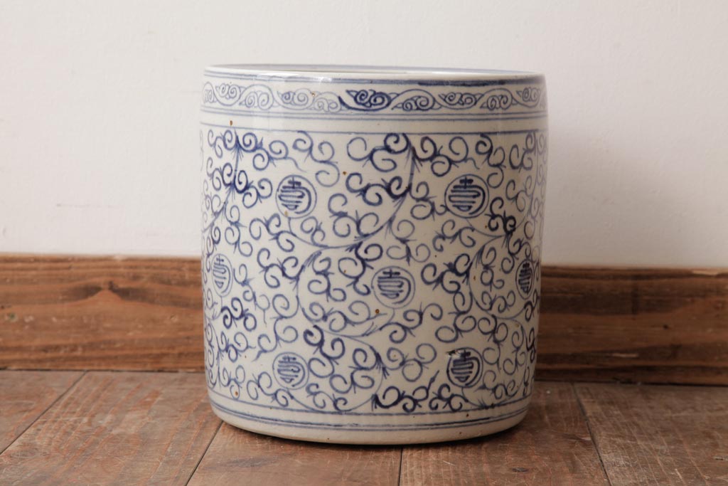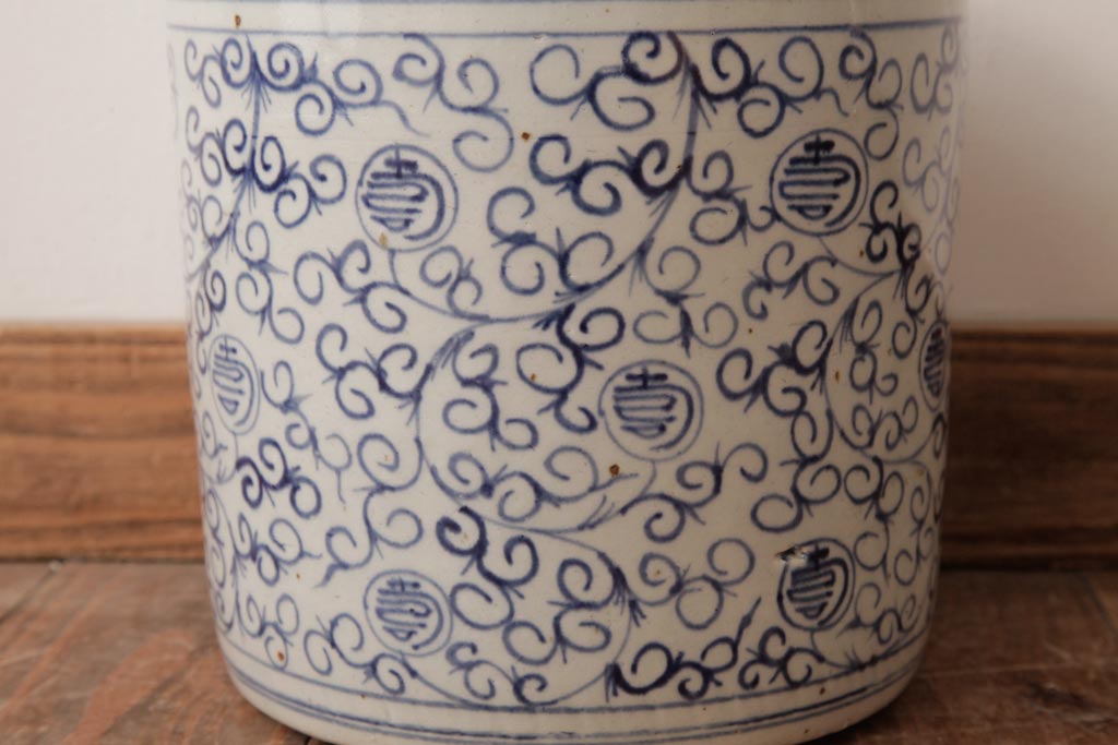 火鉢> 瀬戸火鉢 > アンティーク雑貨 和製アンティーク 小振り 唐草と寿文様が描かれた珍しい図柄の火鉢(手あぶり)