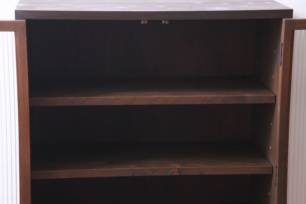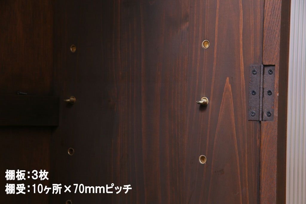 棚板は取り外しできます。棚板は3枚あります。棚受けは10ヶ所、70mmピッチで調整できます。棚幅サイズのものが1枚の作りです。