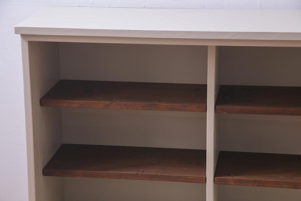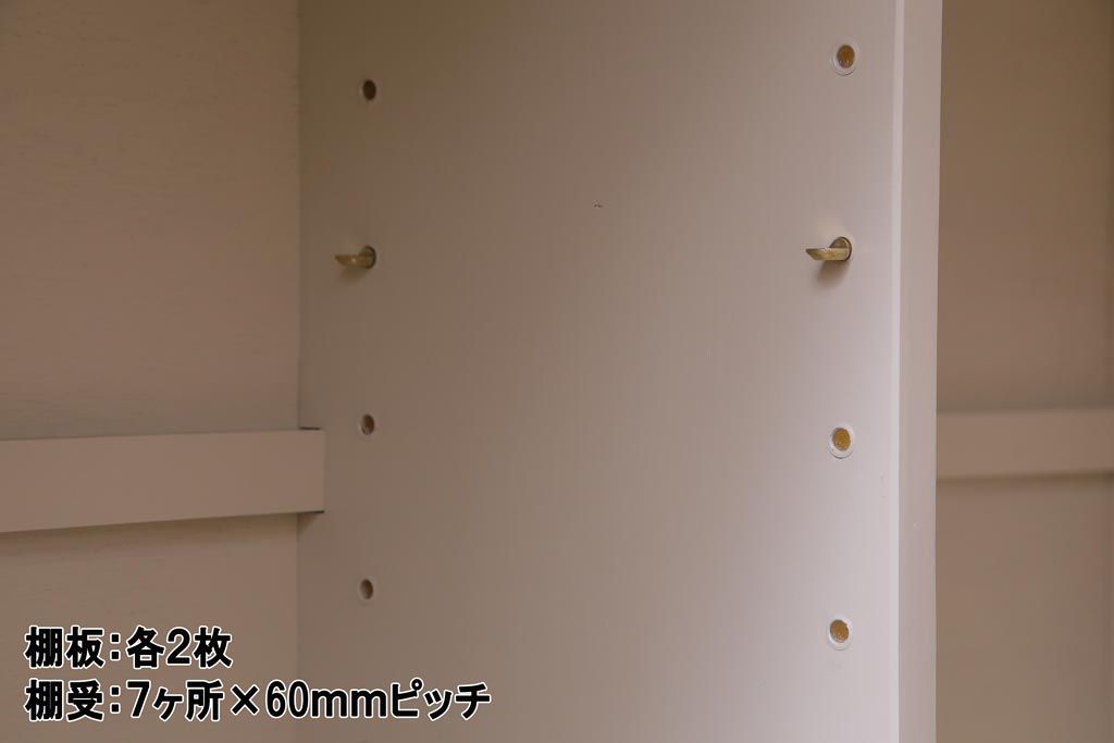 棚板は取り外しできます。棚板は各2枚あります。棚受けは7ヶ所、60mmピッチで調整できます。棚幅サイズのものが1枚の作りです。