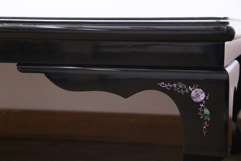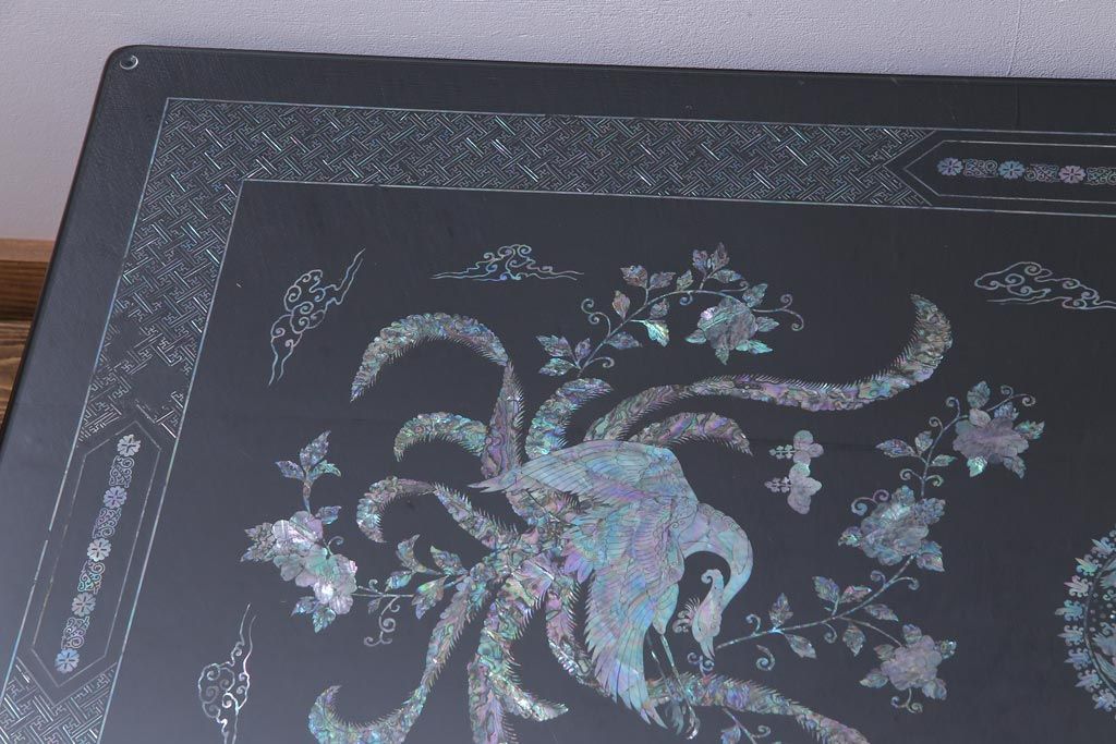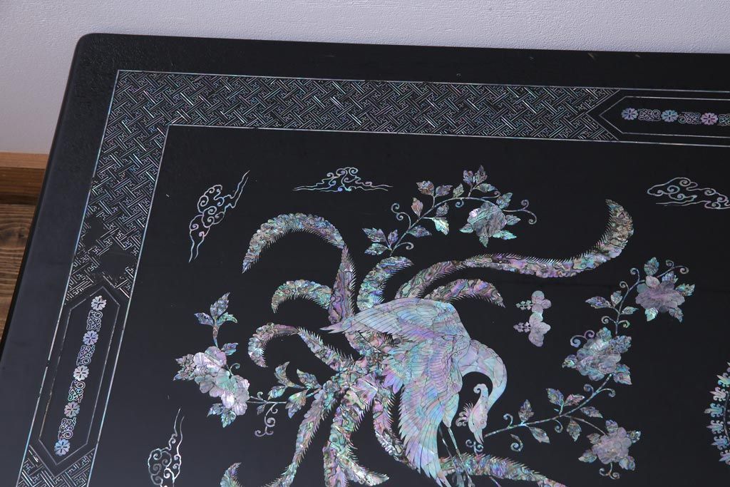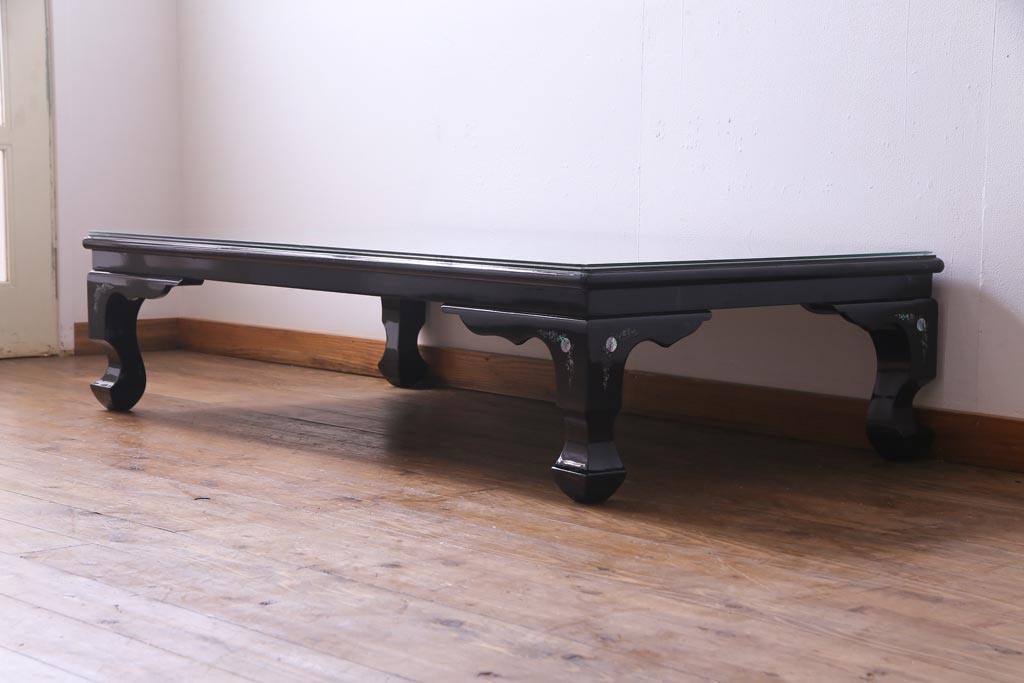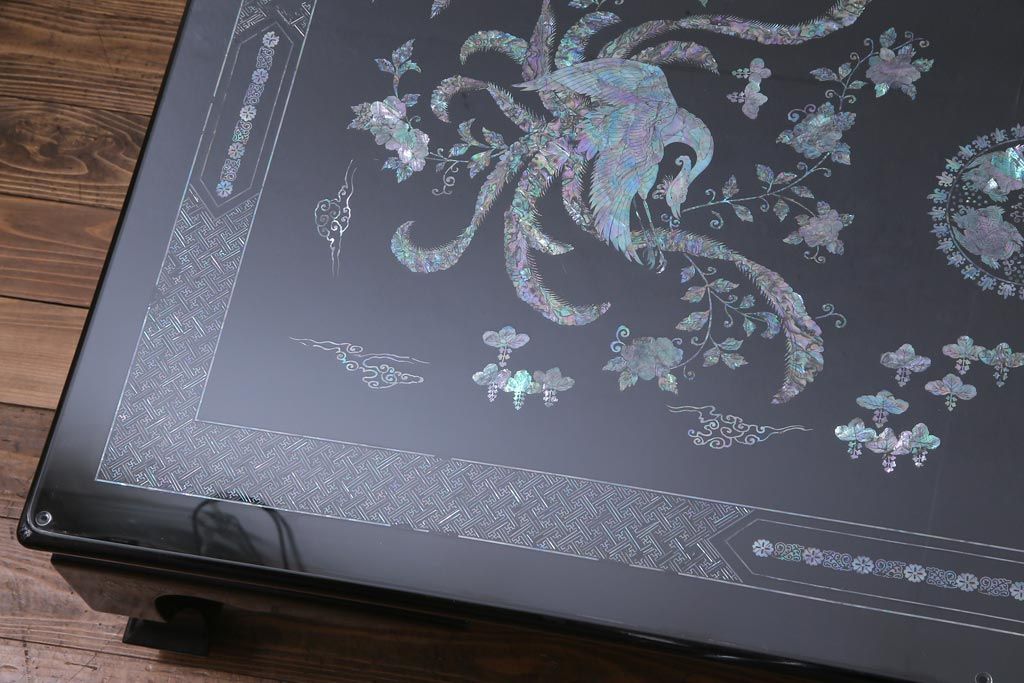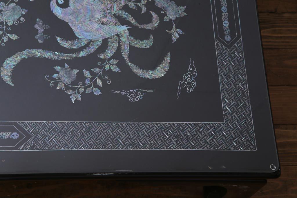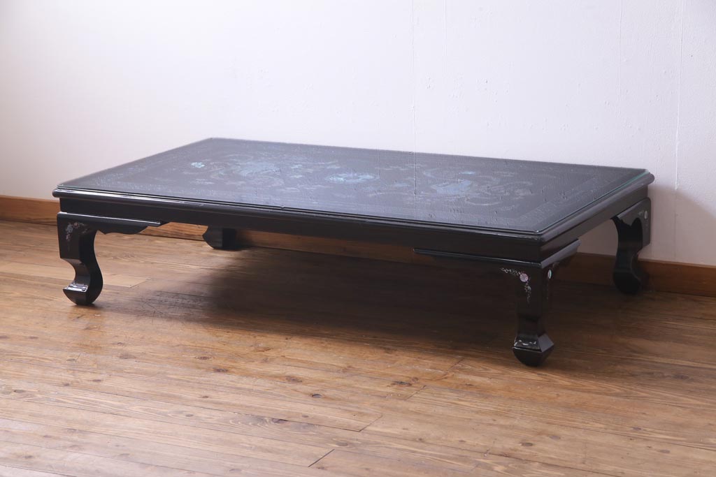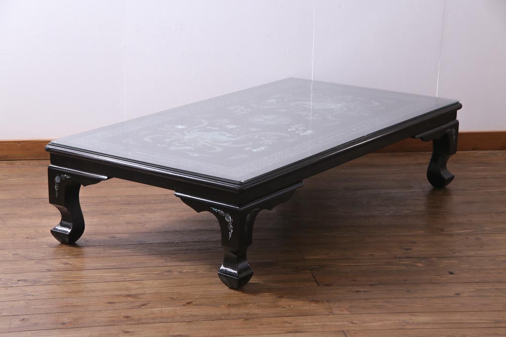 中古 民芸家具 ガラス天板付き 鳳凰 気品漂う螺鈿細工の座卓(ローテーブル)